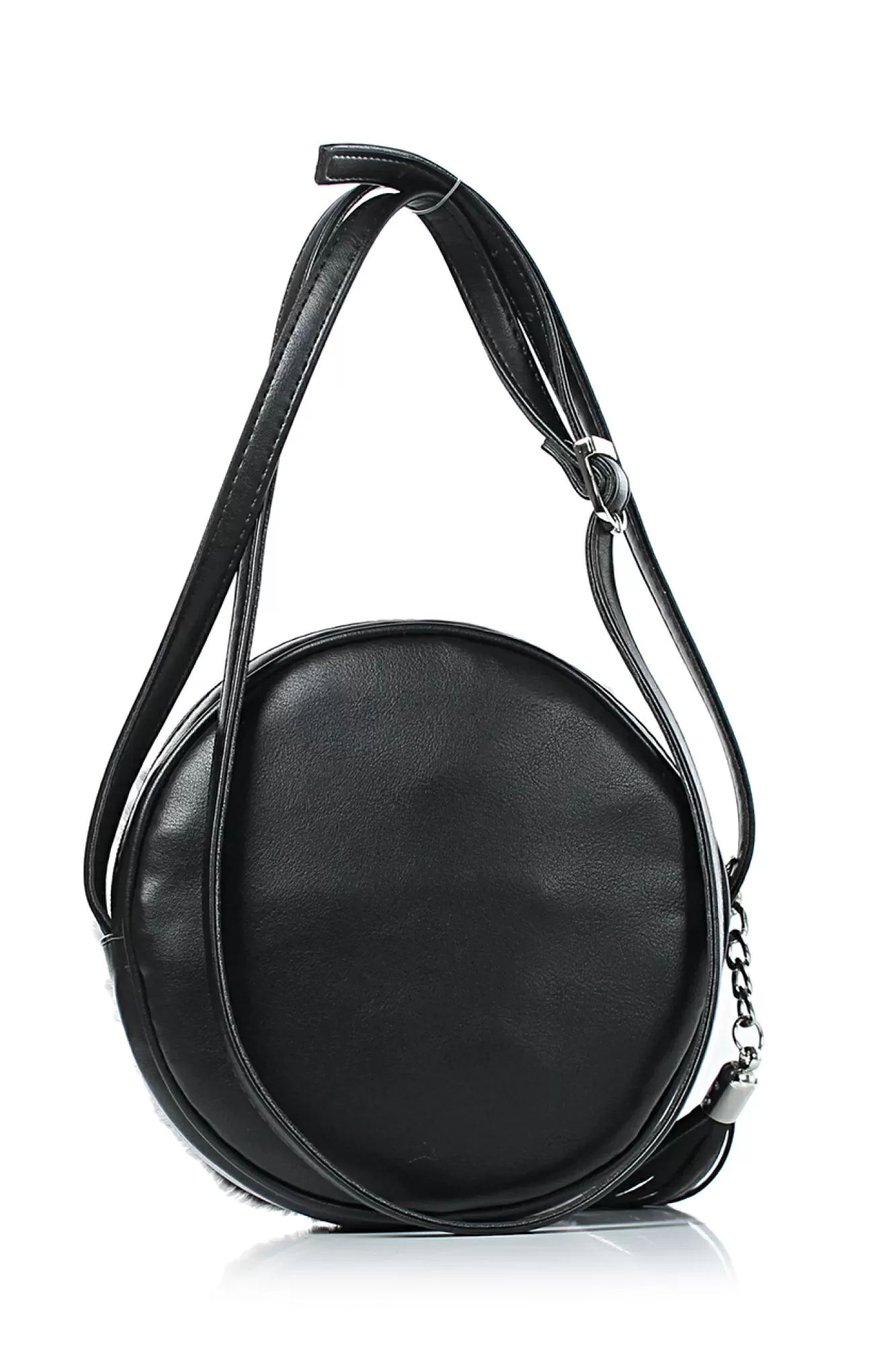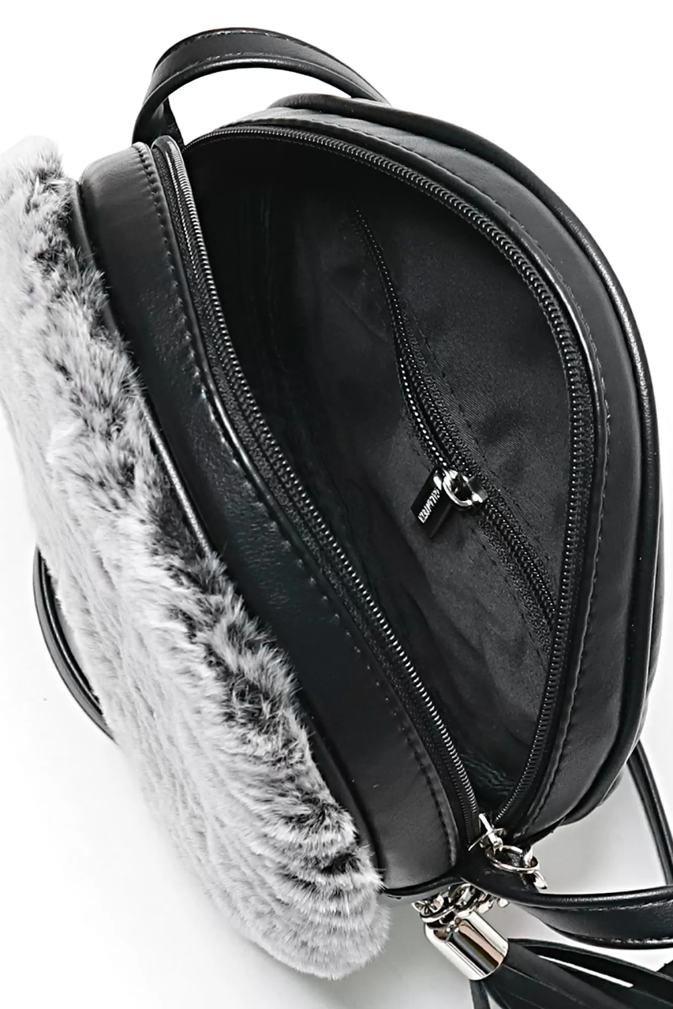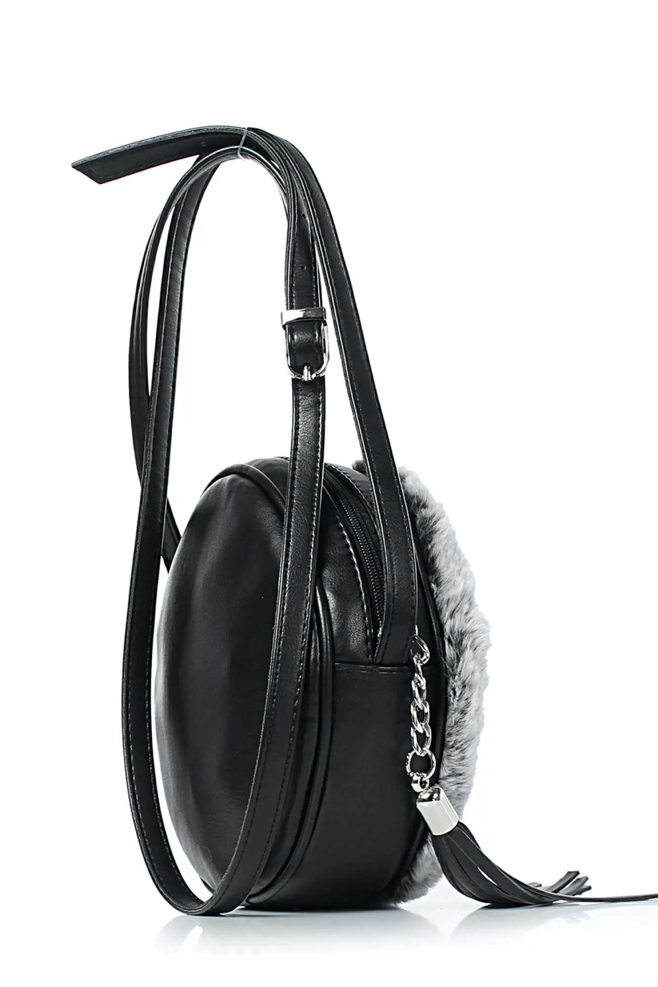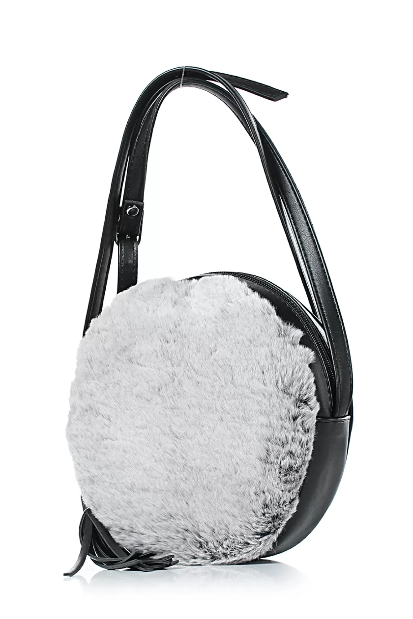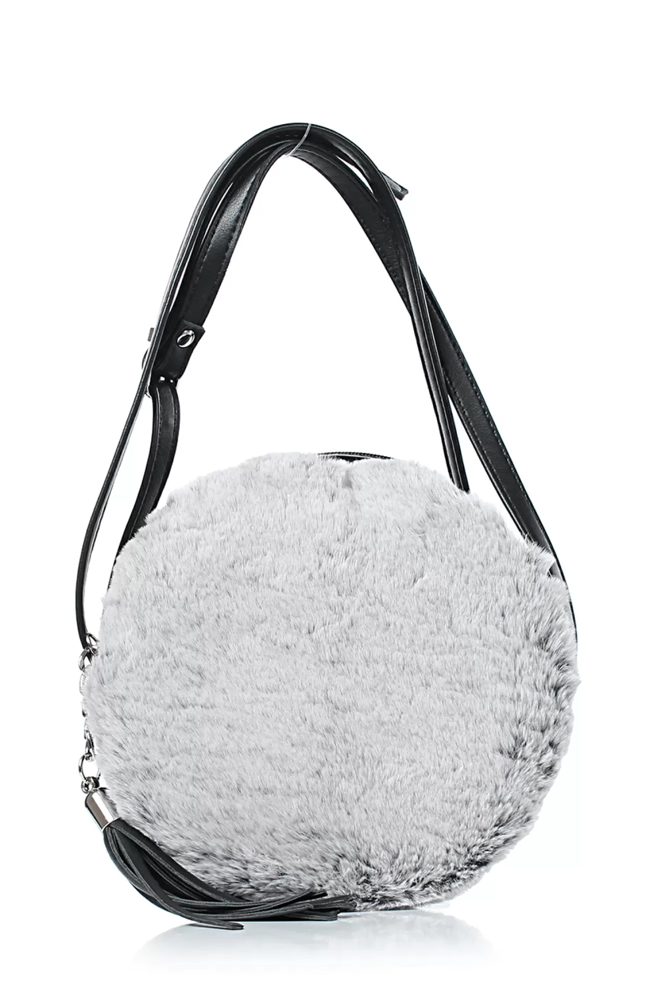 Сумка на одно отделение,закрывающегося на застежку-молнию,с регулирующейся по длине ручкой-ремнем на пряжке (максимальная длина плечевого ремня 1590+-10мм),с украшением кисточка на цепочке,с прокладкой кедера.Передняя стенка выполнена из меха.Цвет фурниту Размеры: 190x190x55