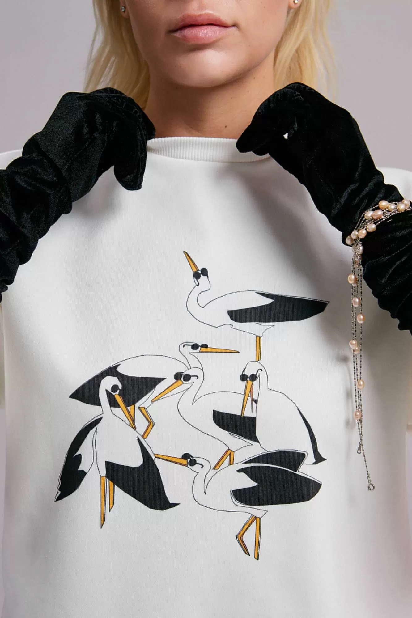 Стильный свитшот из натурального хлопка (95% хлопок) с принтом ""Аист"" станет ярким дополнением вашего образа. Молочный цвет, прямой силуэт, длинный рукав со спущенной линией плеча. Горловина, низ рукава и низ изделия отделаны трикотажной резинкой. По швам плеча, низа рукава, низа изделия проложена двойная декоративная строчка. Такая форма изделия и способ пошива не стесняют движений, обеспечивая дополнительный комфорт при носке, что отмечают наши покупательницы. В комплект к свитшоту идут брюки в цвет, прямого силуэта, зауженные к низу арт.120026. Длина изделия - 42-52,2; 44-53,1; 46-54; 48-55,0см