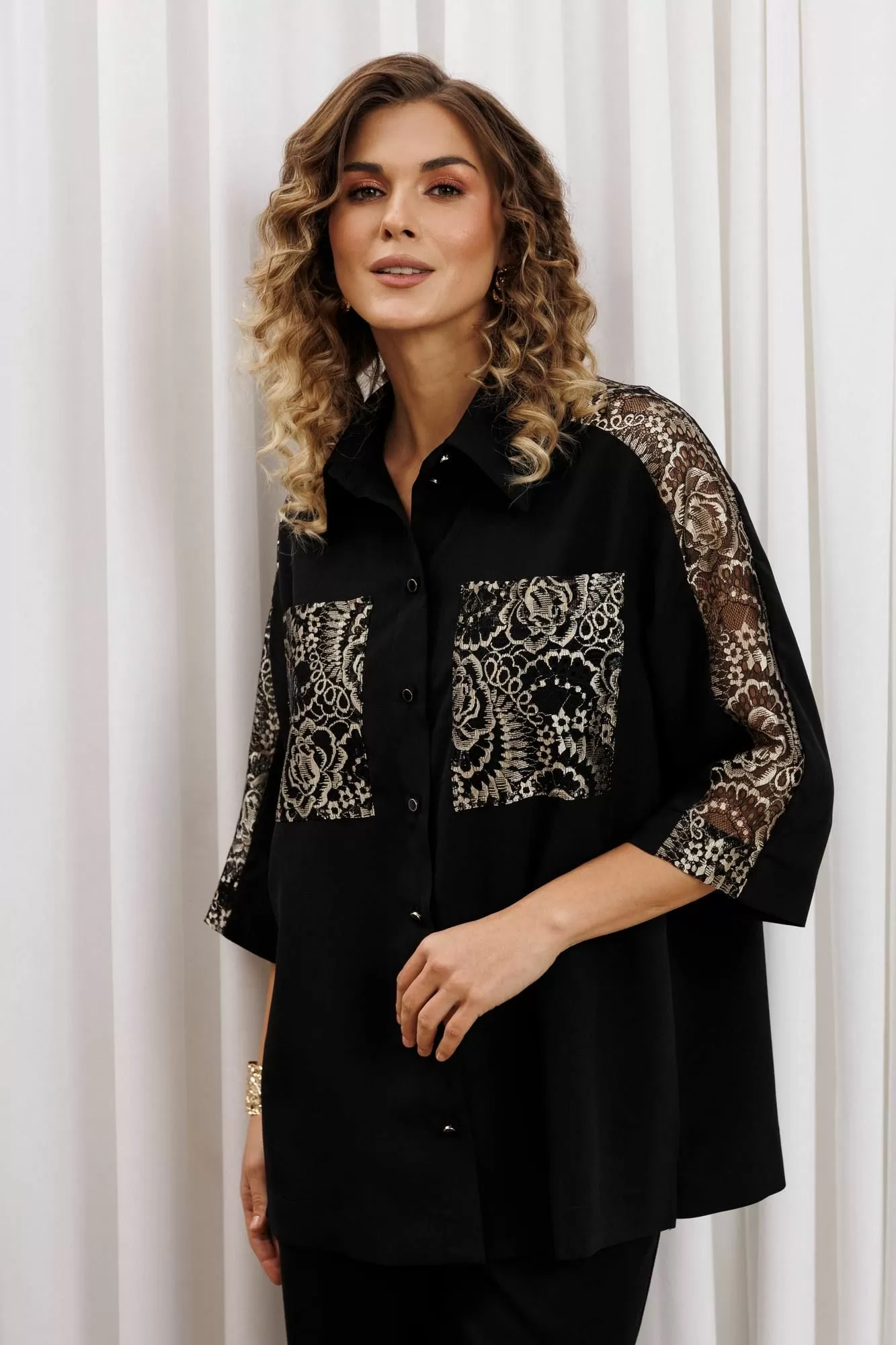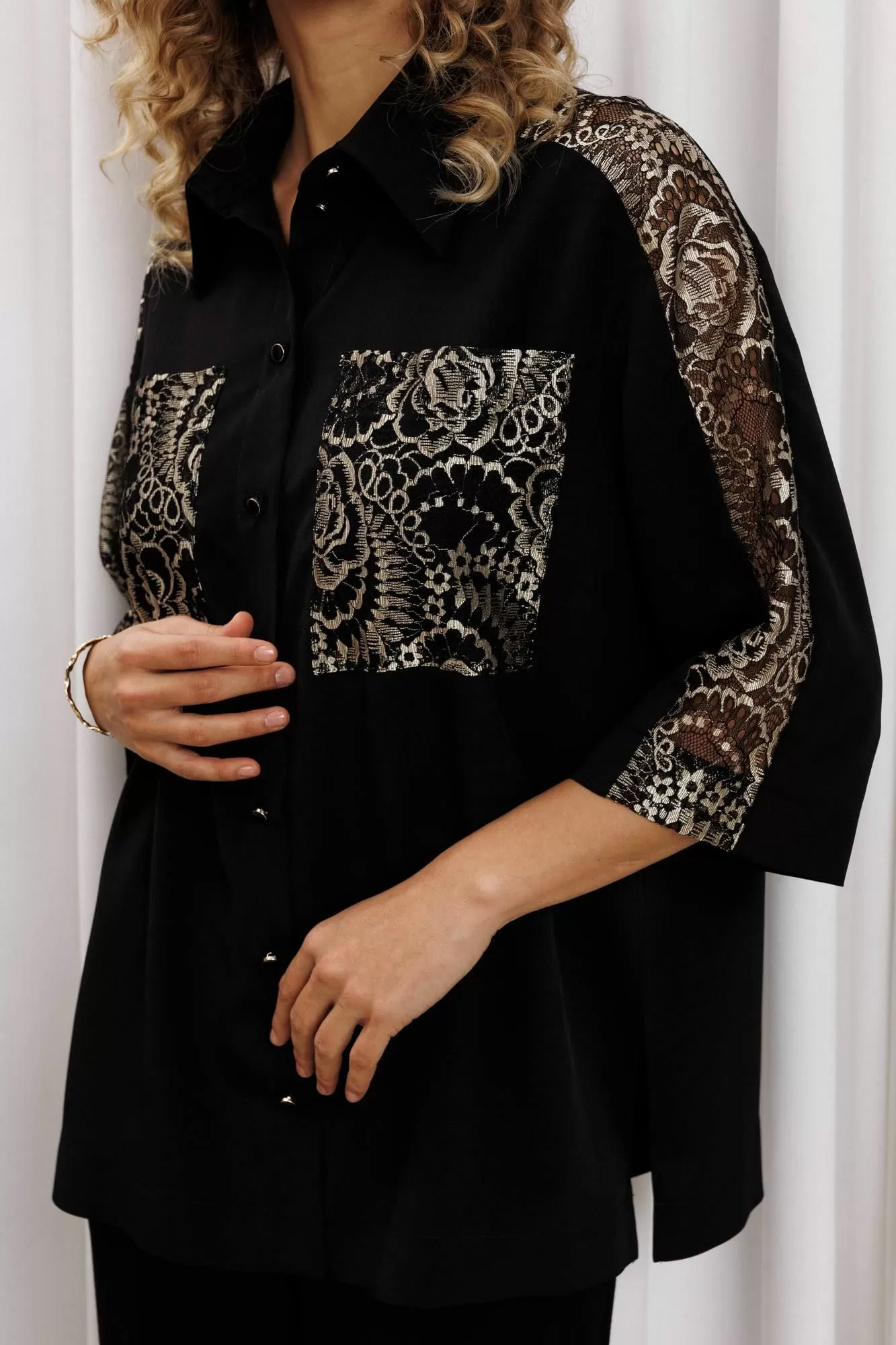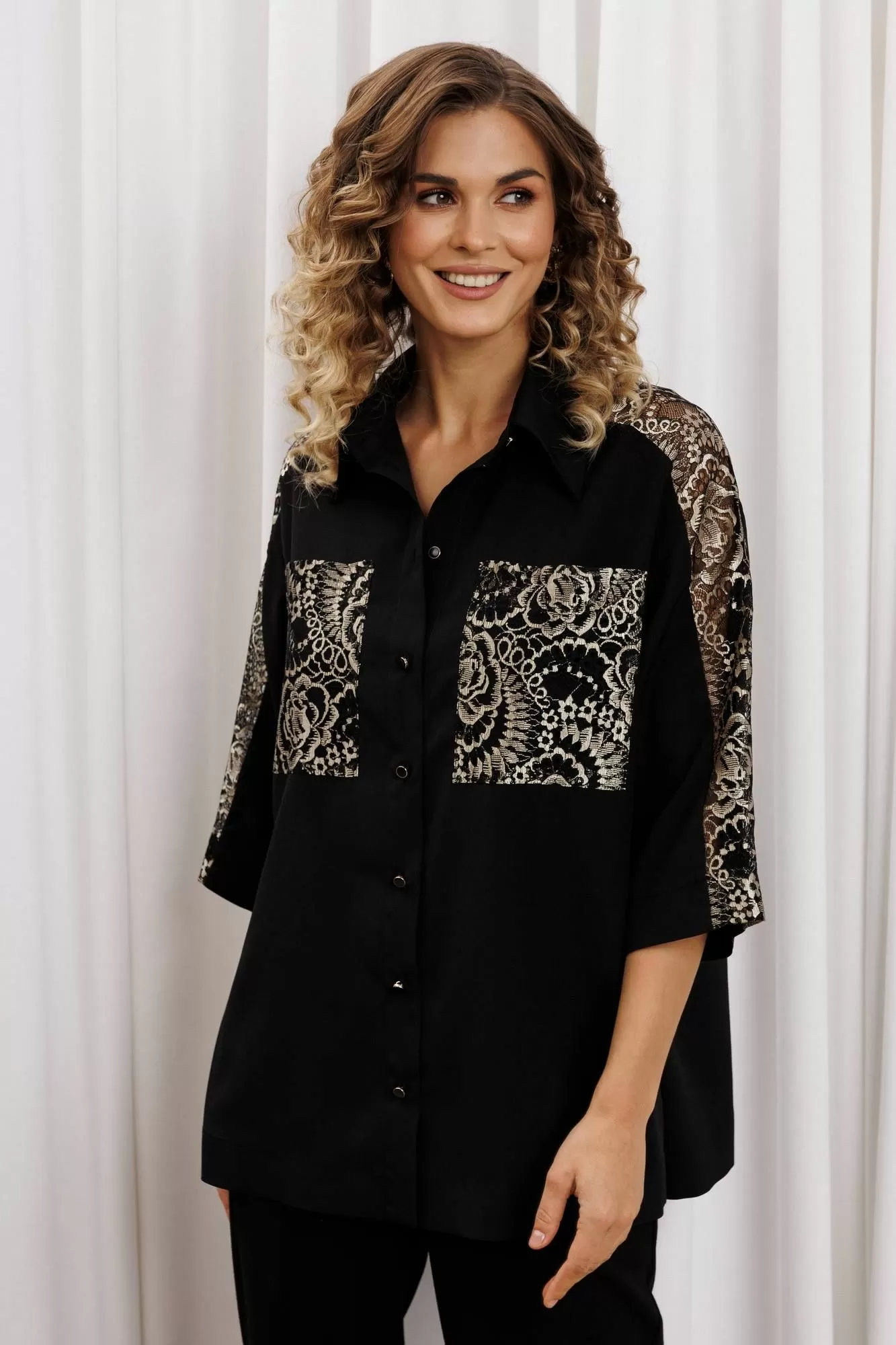 Рубашка свободного силуэта из блузочного крепа. Застежка центральная на петли и пуговицы, воротник на стойке. В боковых швах разрезы. Рукав втачной рубашечного кроя. Карманы спереди и вставка вдоль плеча и рукава выполнеы из кружева. Длина рубашки- 71 см. длина рукава рубашки - 35 см.