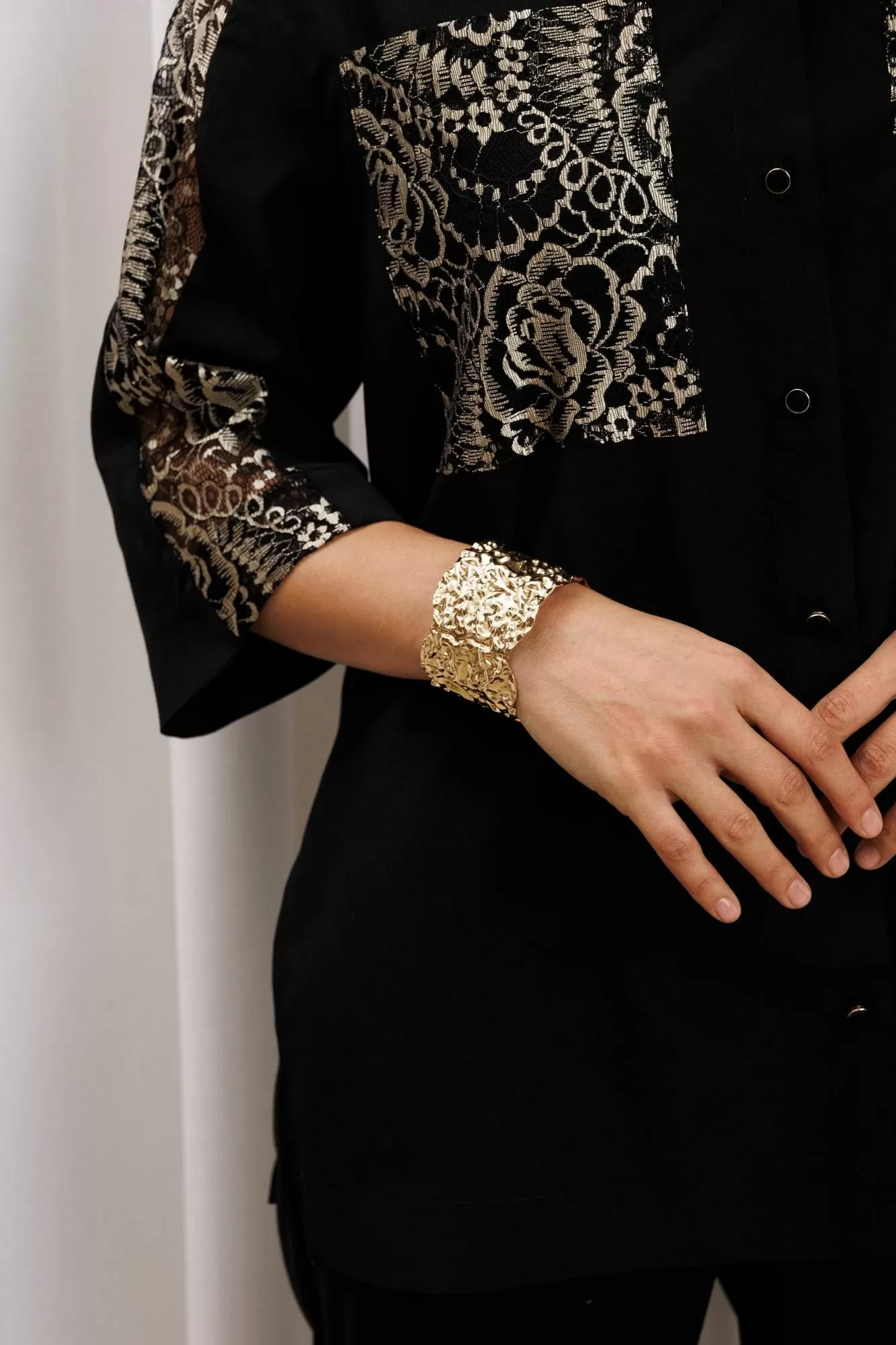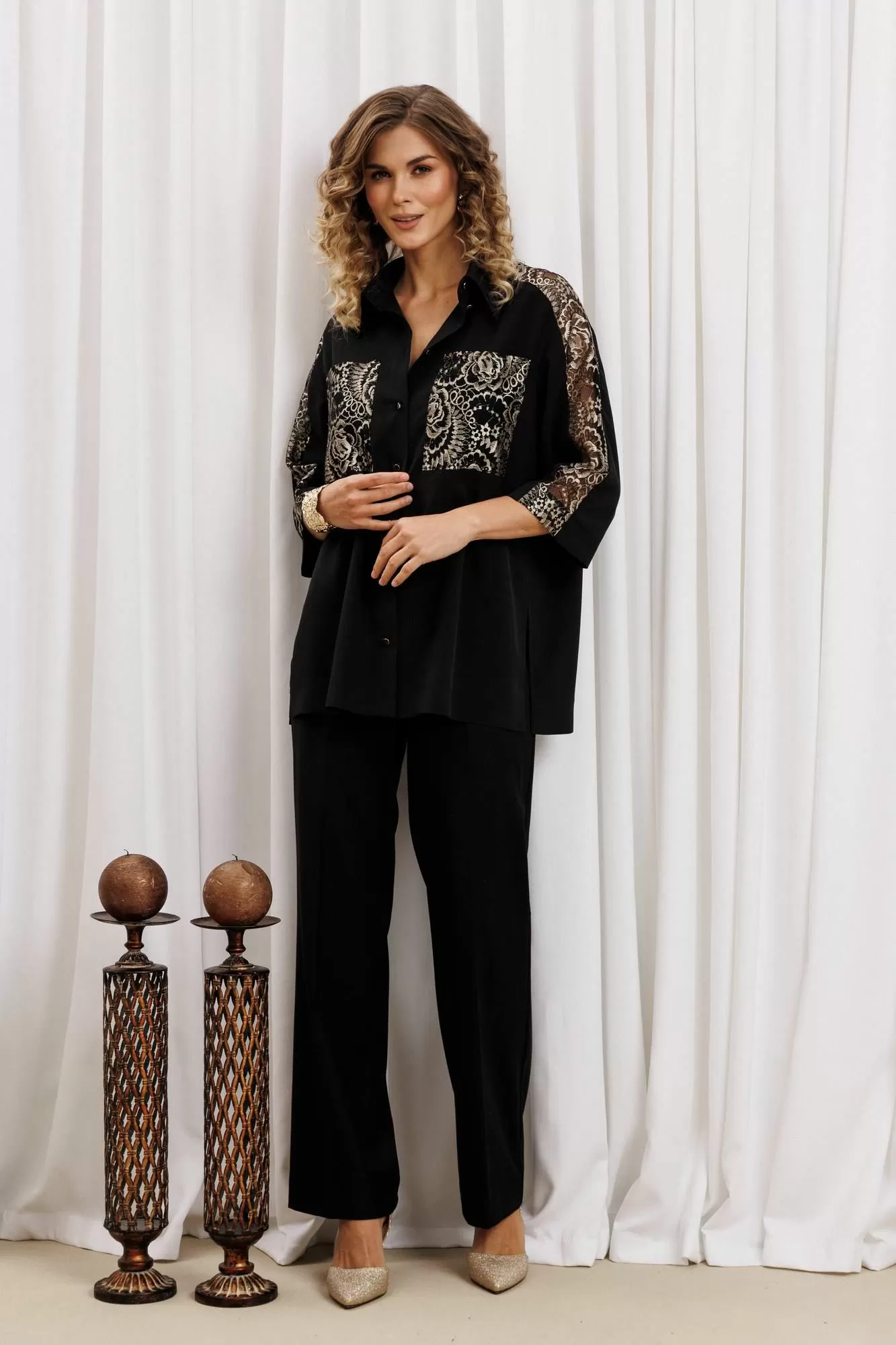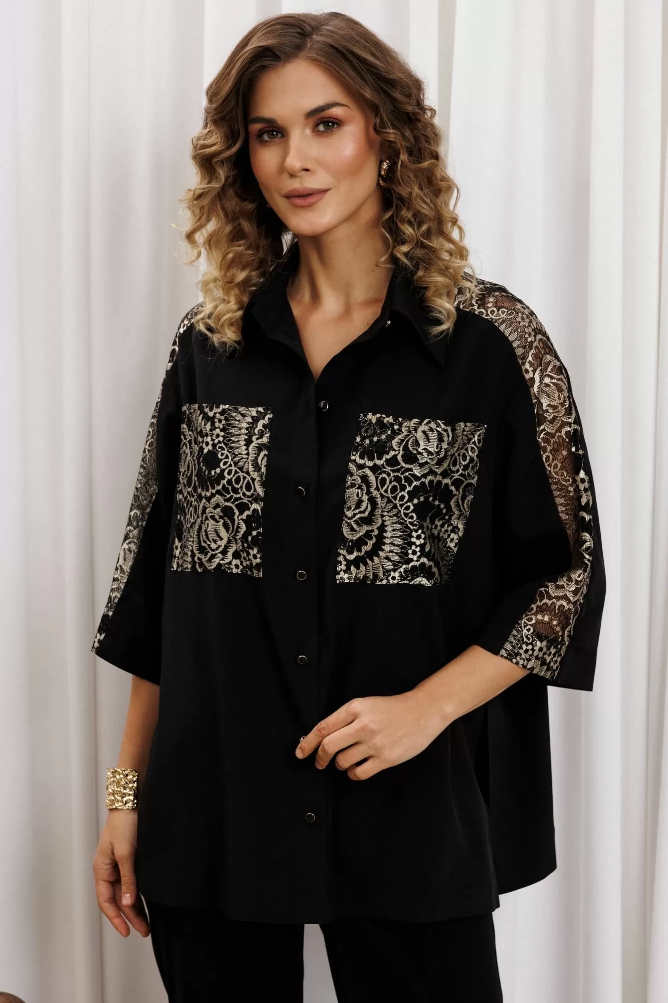 Рубашка свободного силуэта из блузочного крепа. Застежка центральная на петли и пуговицы, воротник на стойке. В боковых швах разрезы. Рукав втачной рубашечного кроя. Карманы спереди и вставка вдоль плеча и рукава выполнеы из кружева. Длина рубашки- 71 см. длина рукава рубашки - 35 см.