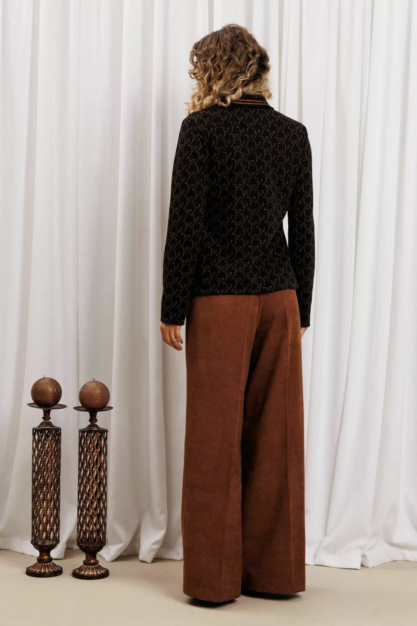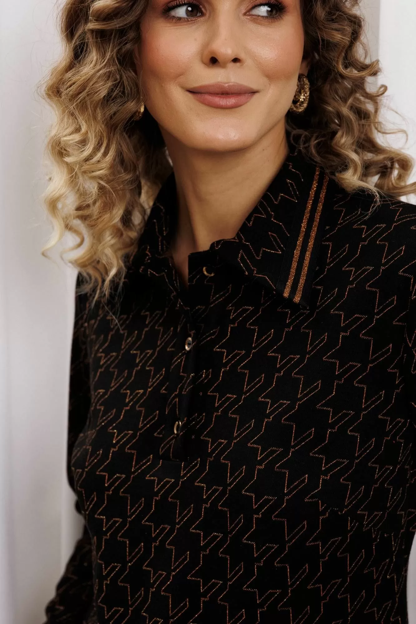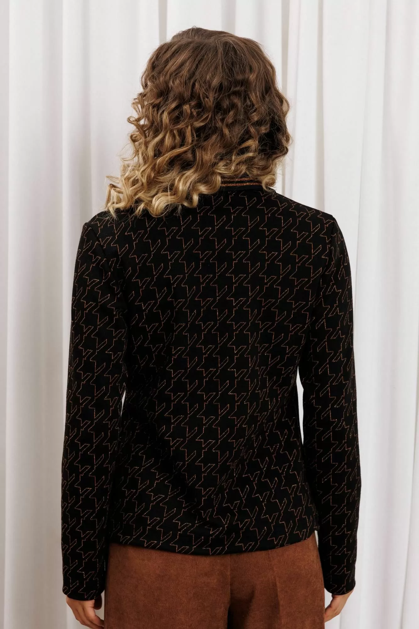Джемпер прямого силуэта из плотного трикотажного полотна с оригинальным рисунком из люрекса. Перед с застежкой поло и нагрудными вытачками. По воротнику настрочена декоративная тесьма. Длина джемпера - 60 см, длина рукава - 61 см.