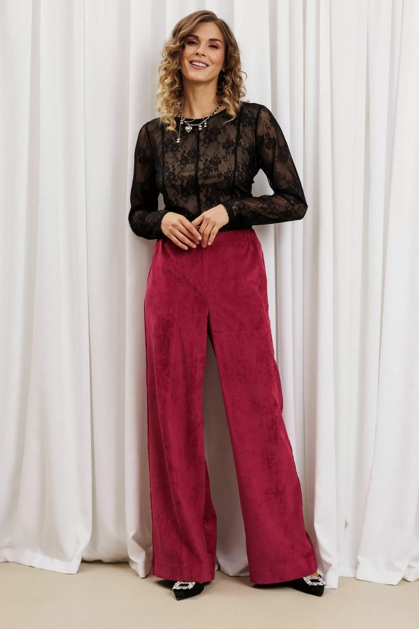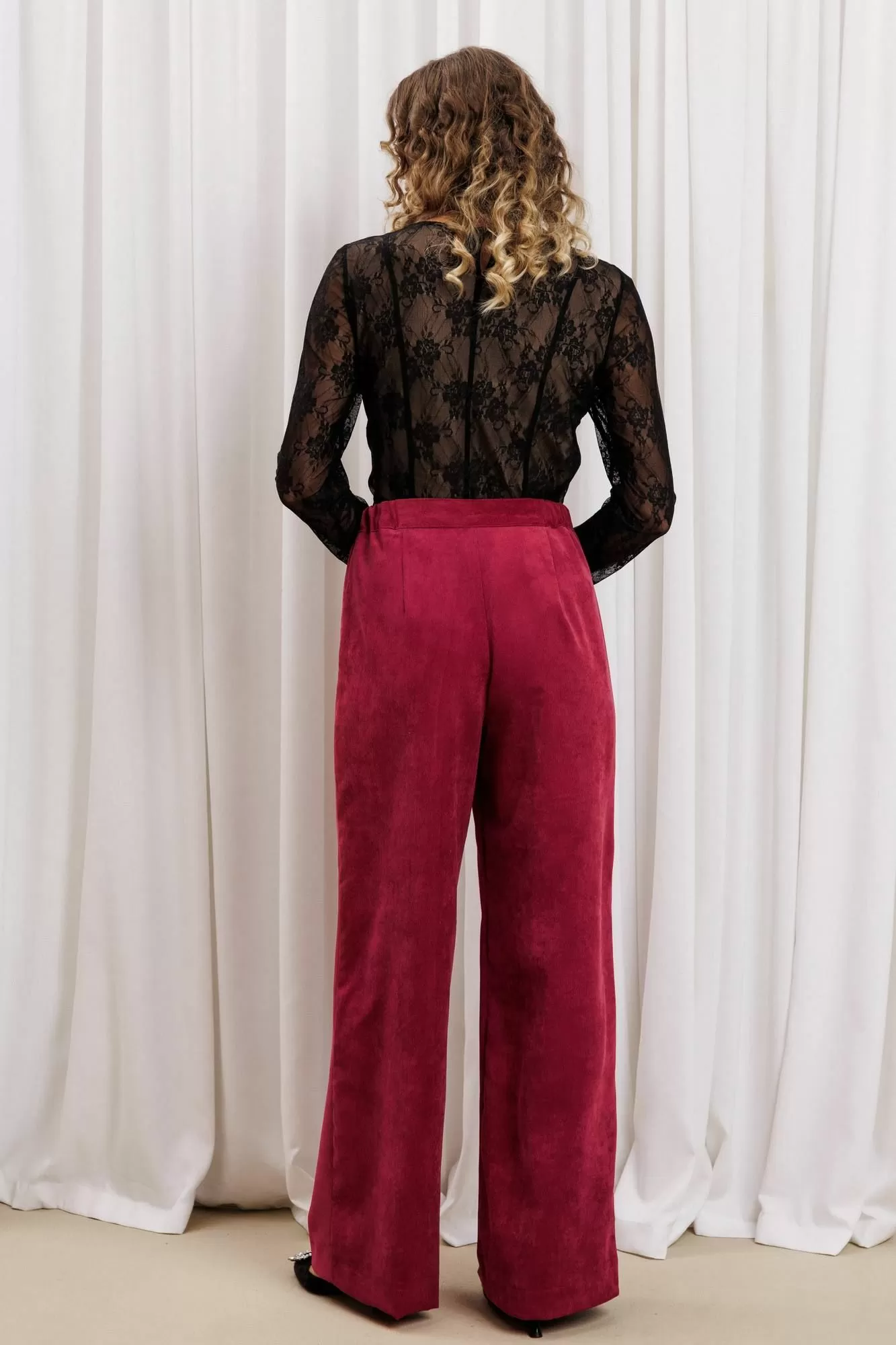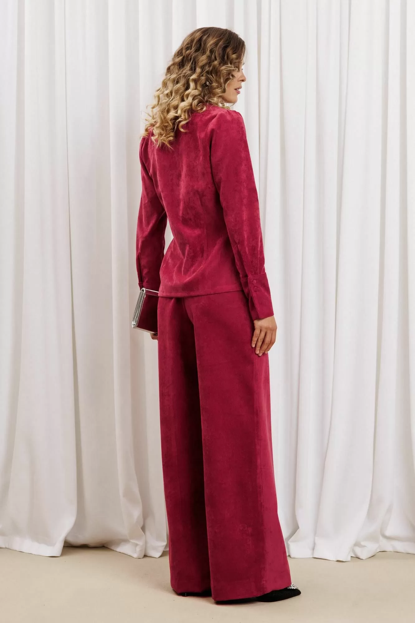 Брюки палаццо с притачным поясом из мягкой вельветовой ткани. Спереди застежка гульфик на молнии и петлей и пуговицей по поясу. По задней частям брюк вытачки. Пояс с резинкой в боковых частях. Брюки с заутюженными стрелками. Длина брюк с учетом пояса - 109 см.