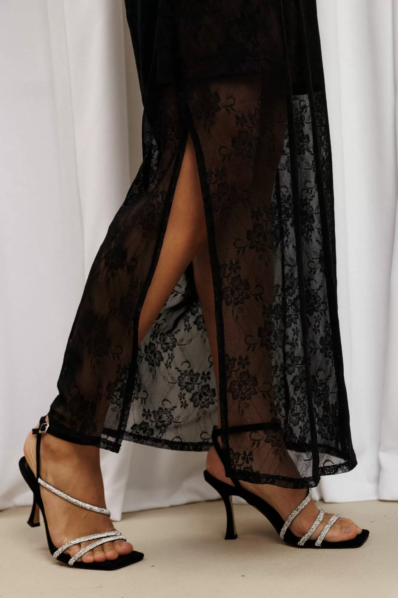 Платье прямого силуэта из кружевной эластичной ткани с нижним платьем. Нижнее платье полуприталеного силуэта на регулируемых бретельках. Перед с нагрудными и талиевыми вытачками. Спинка со средни швом и талиевыми вытачками. Верхнее платье прямого силуэта выполнено из кружева. В боковом шве разрез. Рукав втачной одношовный удлиненный с вырезом на палец на руке. Длина нижнего платья: 68 см. Длина верхнего платья 139 см, длина рукава 73 см.