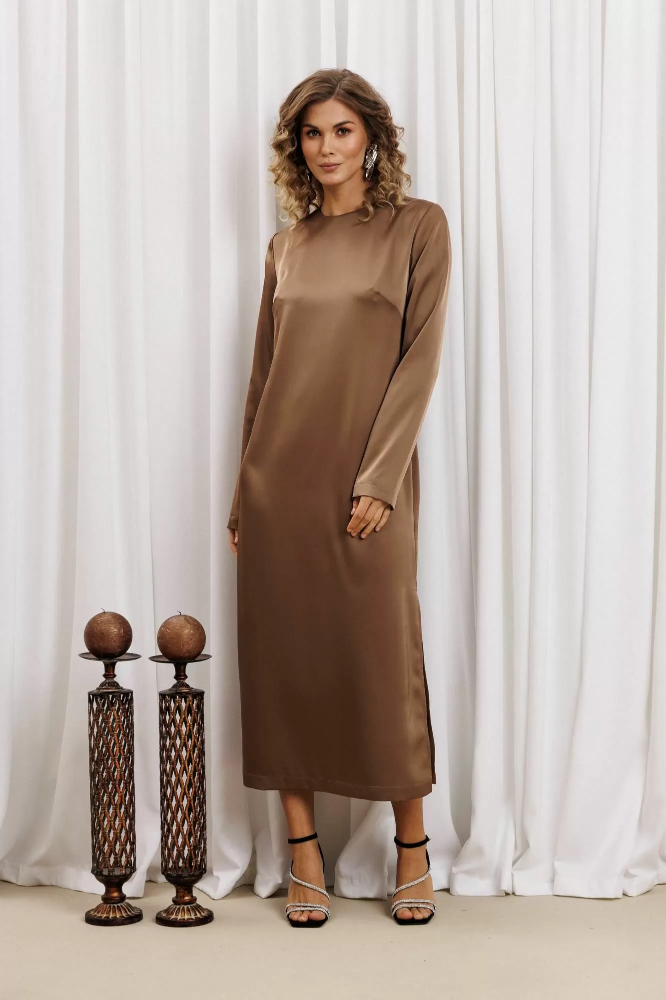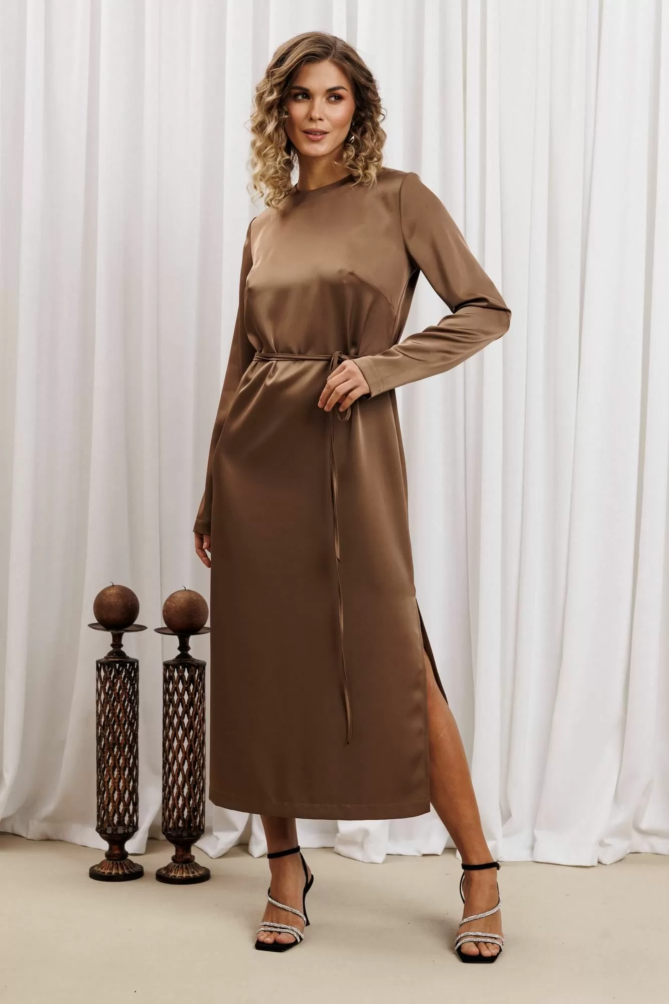 Платье прямого силуэта выполнено из атласной ткани. Перед с нагрудной вытачкой. Спинка с застежкой "капелькой" на петлю и пуговицу сверху. В боковом шве разрез. Рукав втачной одношовный. К платью прилагается пояс из основной ткани. Длина платья 125 см, длина рукава - 61 см.