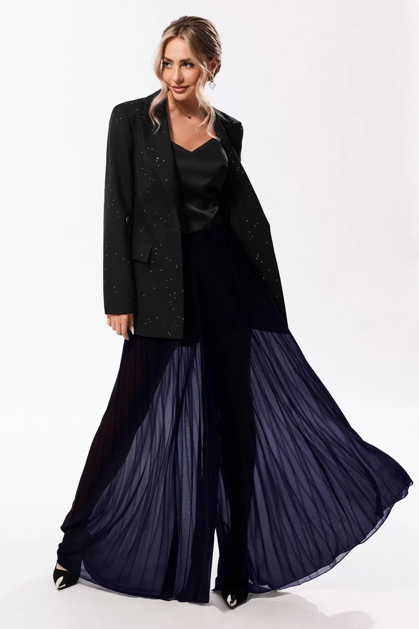 Брюки расширенного силуэта, с отрезным поясом, без застежки, верх брюк присборен на резинку. Брюки без боковых швов