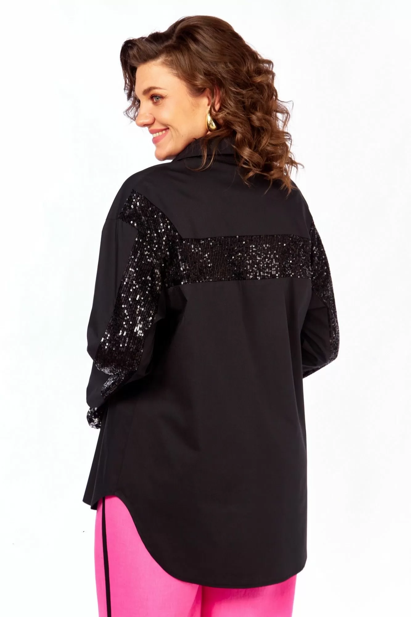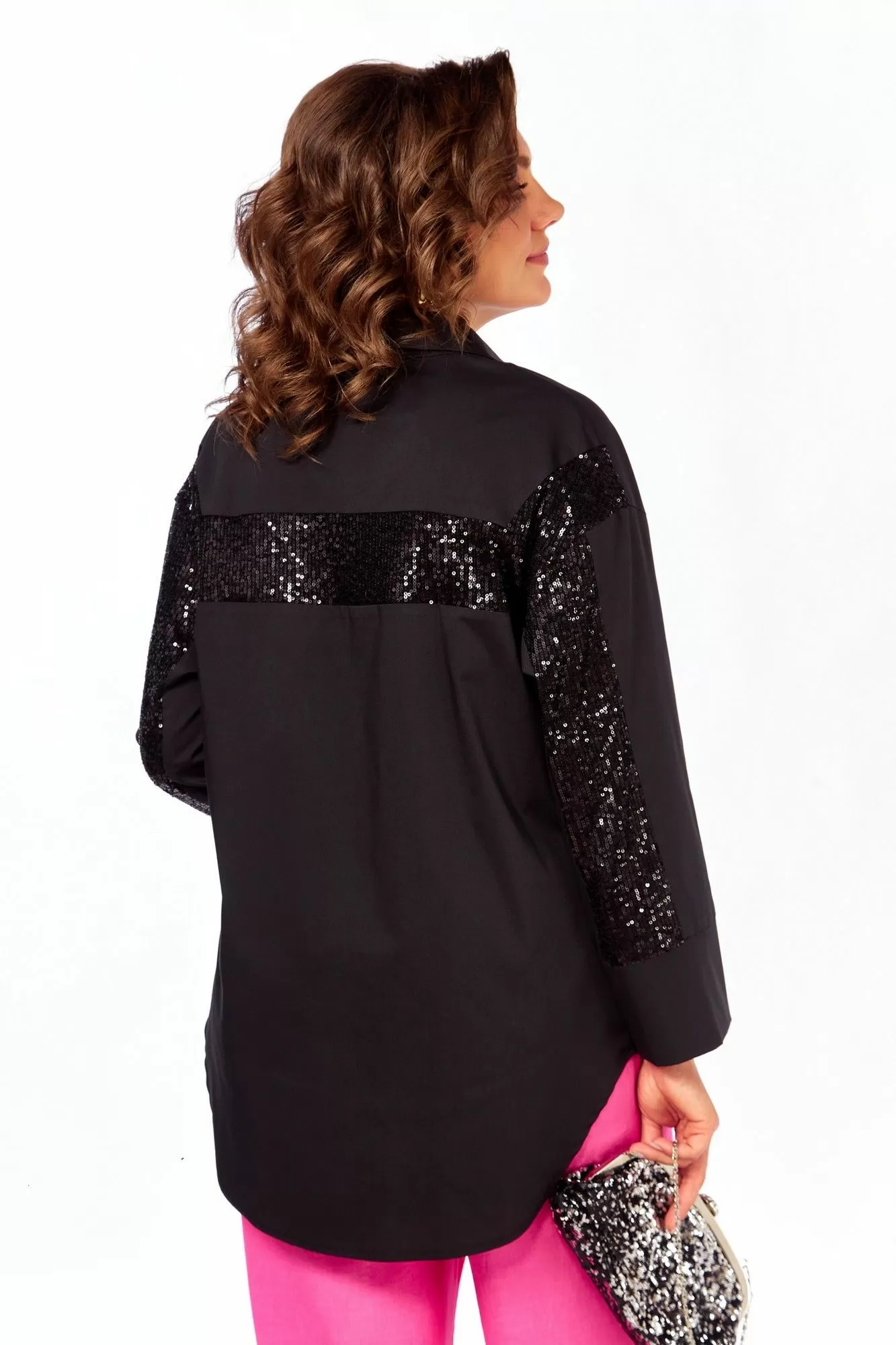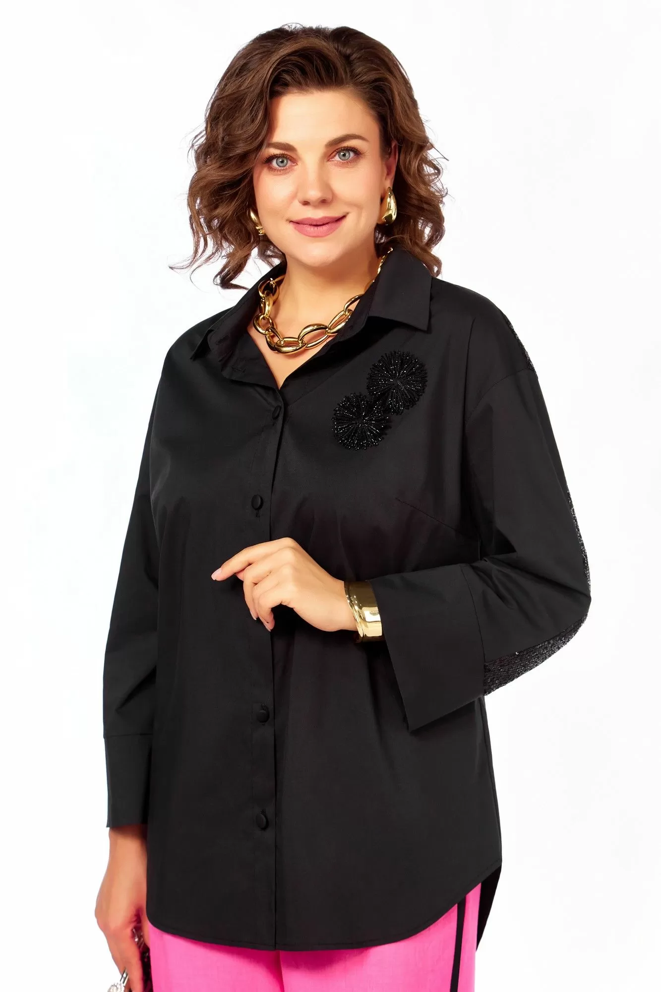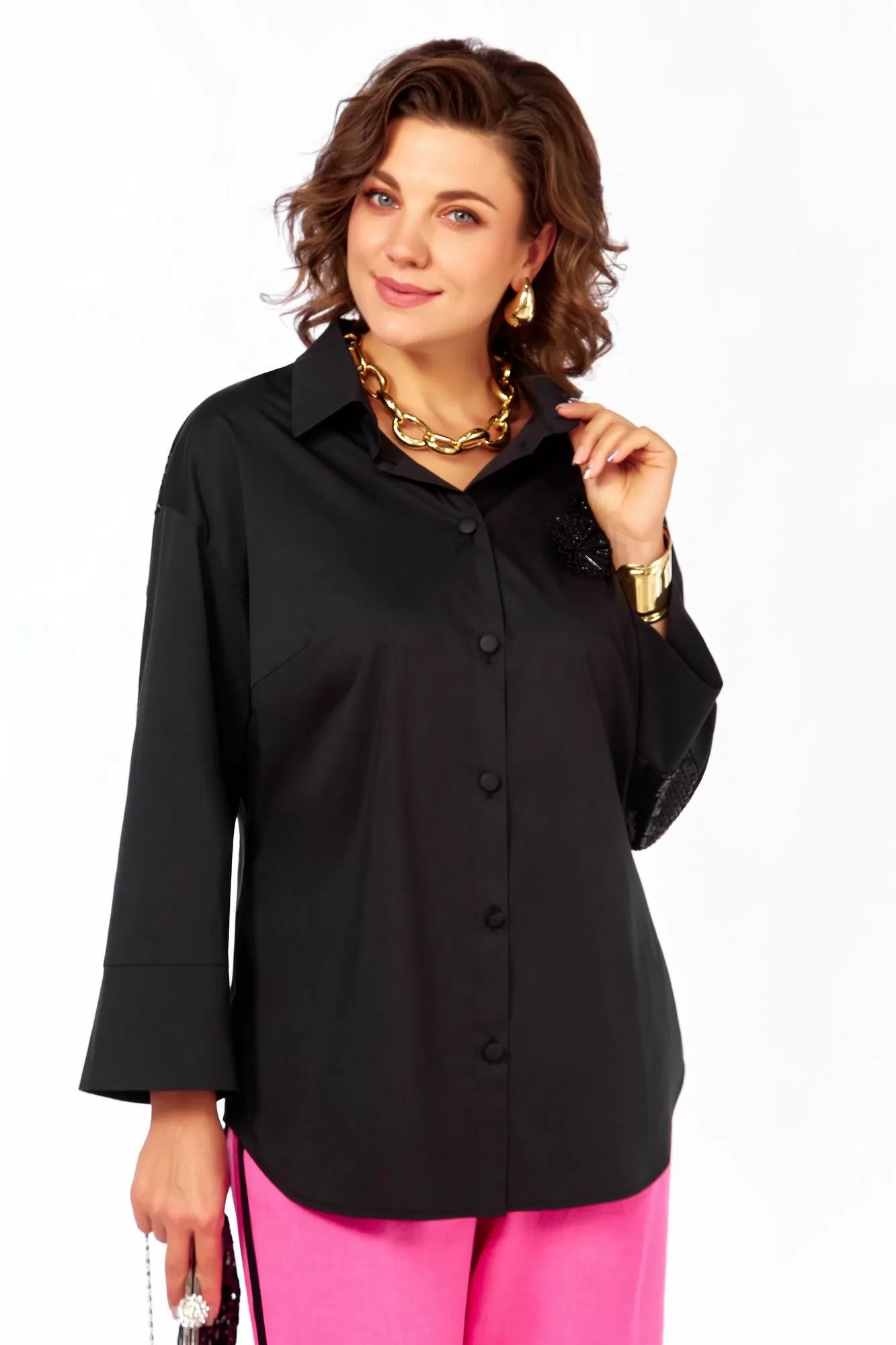 Модная рубашка будет оригинальным нарядом к любому празднику! Рубашка из хлопка, приятная к телу, женская, со спущенным плечом, прямого силуэта, с центральной бортовой застежкой на петли и пуговицы. Перед с нагрудными вытачками, идущими от центра груди к боковым швам. На левой части переда расположено декоративное украшение. Воротник рубашечный стояче-отложной. Рукава длиной 7/8 с притачной манжетой. Сзади рукава расположена отделочная деталь с черными паетками.