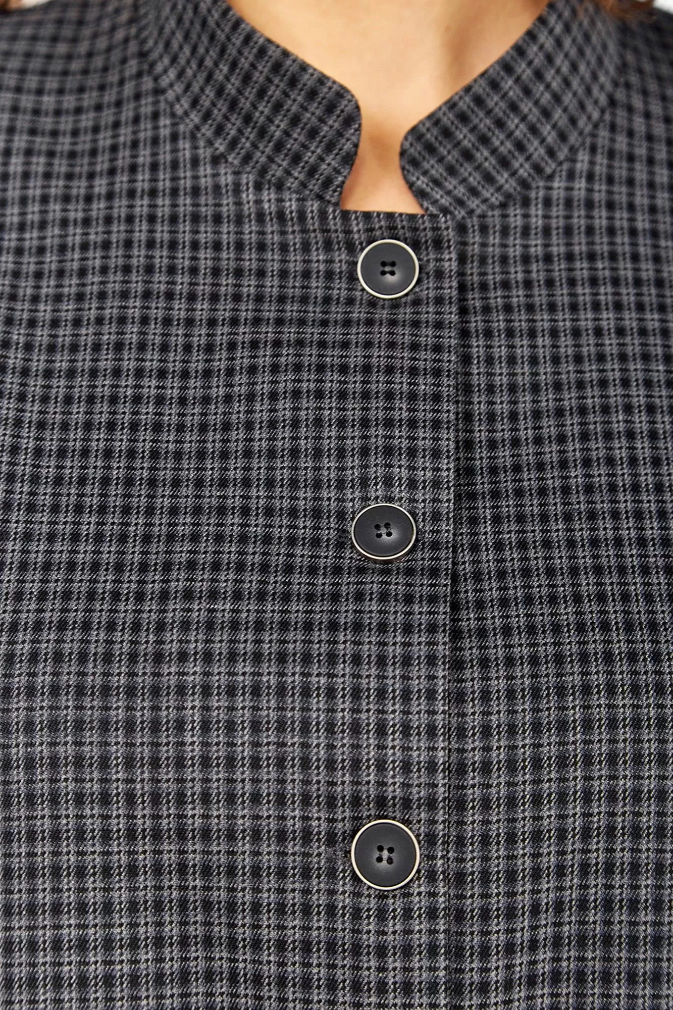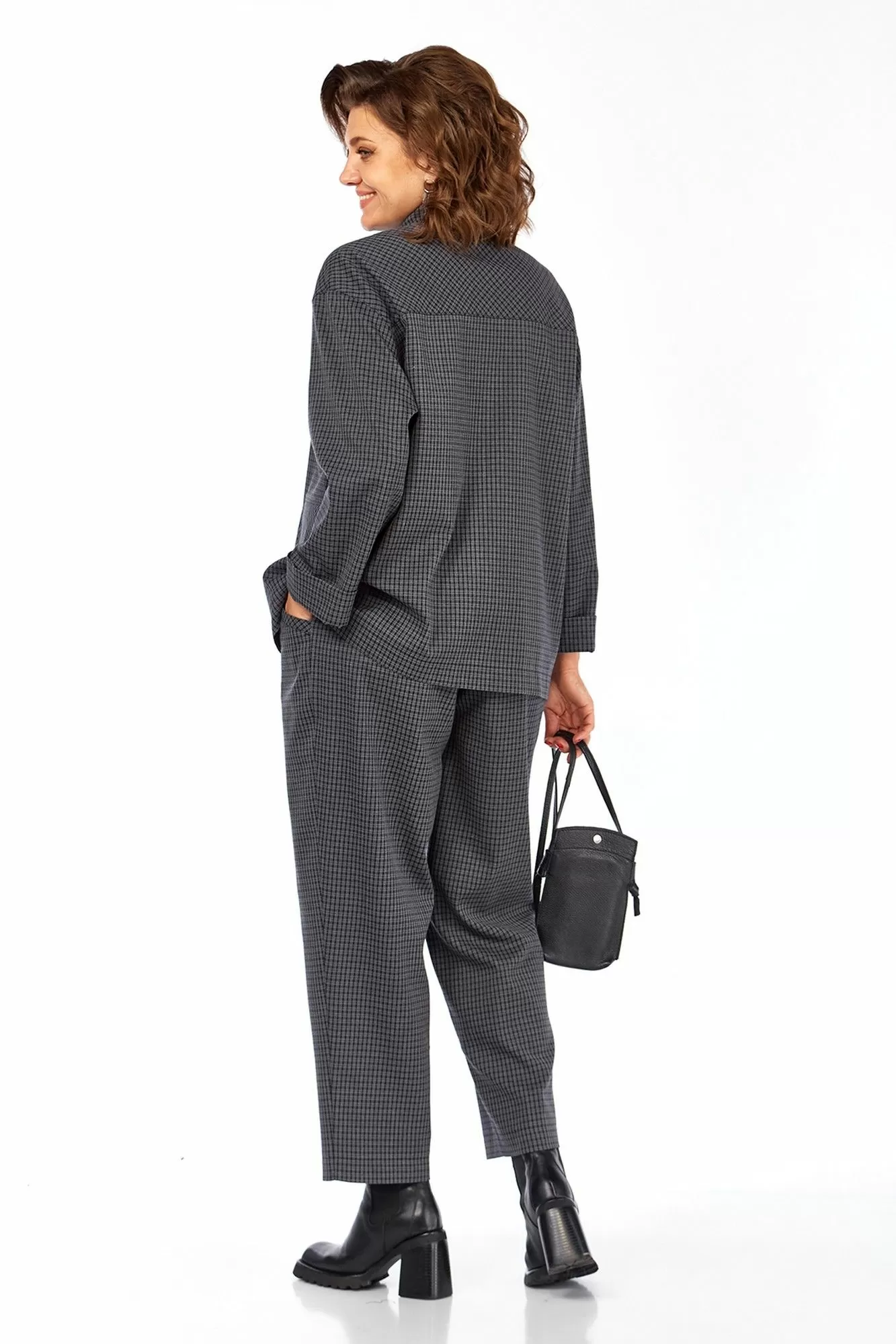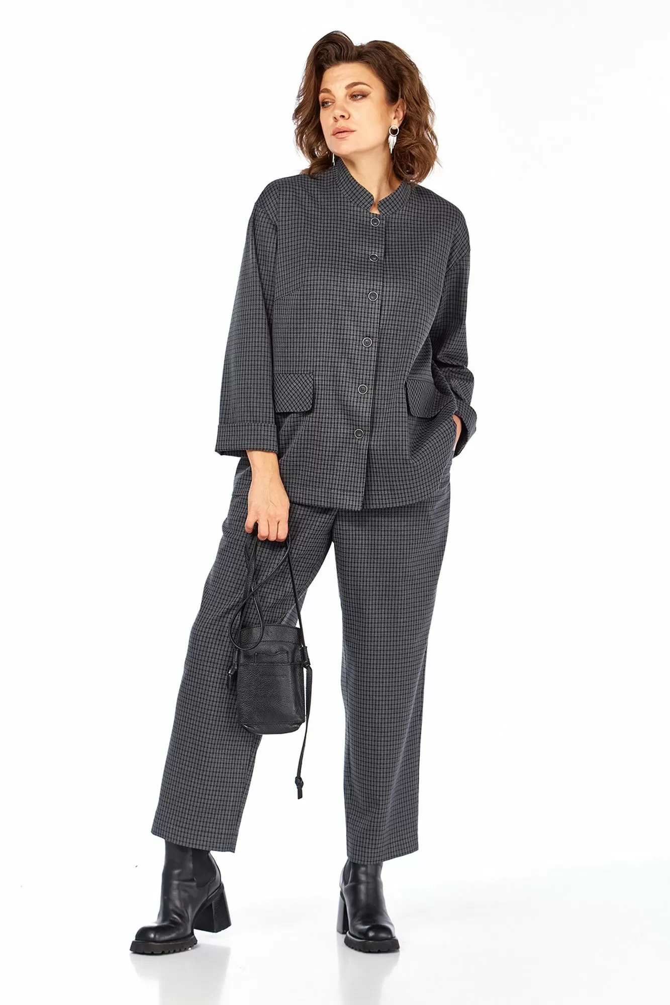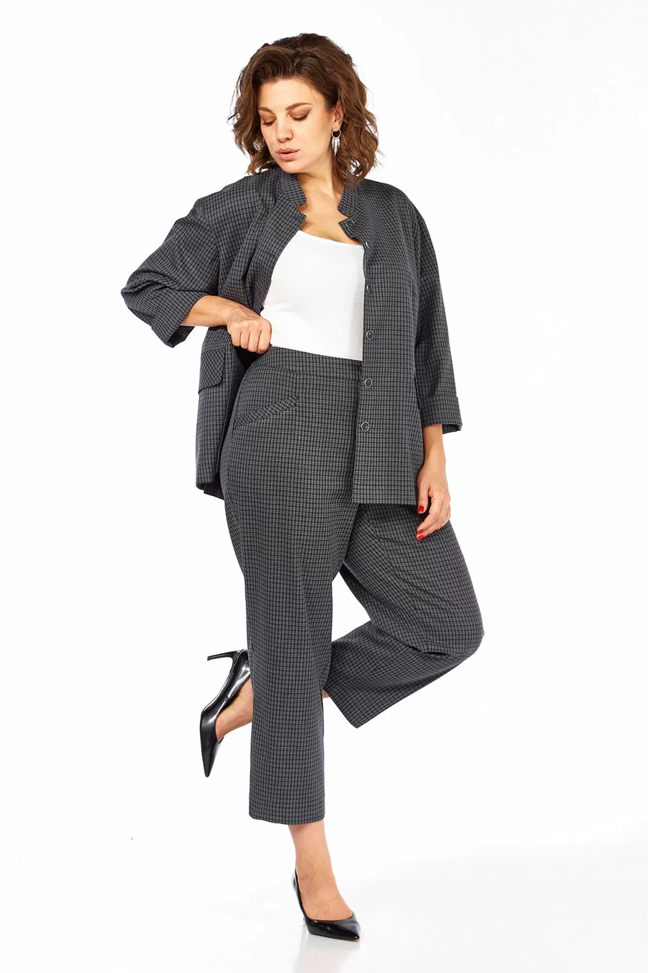 Костюм брючный, изготовлен из костюмной ткани. Жакет прямого силуэта. Горловина обработана воротником-стойкой, застежка центрально-бортовая на петли и пуговицы. На полочке нагрудные вытачки, обработаны карманы. Рукава спущенные, длинные. Брюки свободного кроя, пояс притачной, сзади на резинке. Застежка на тесьму-молнию и петлю пуговицу. На передних частях брюк в подрезных деталях обработаны карманы.