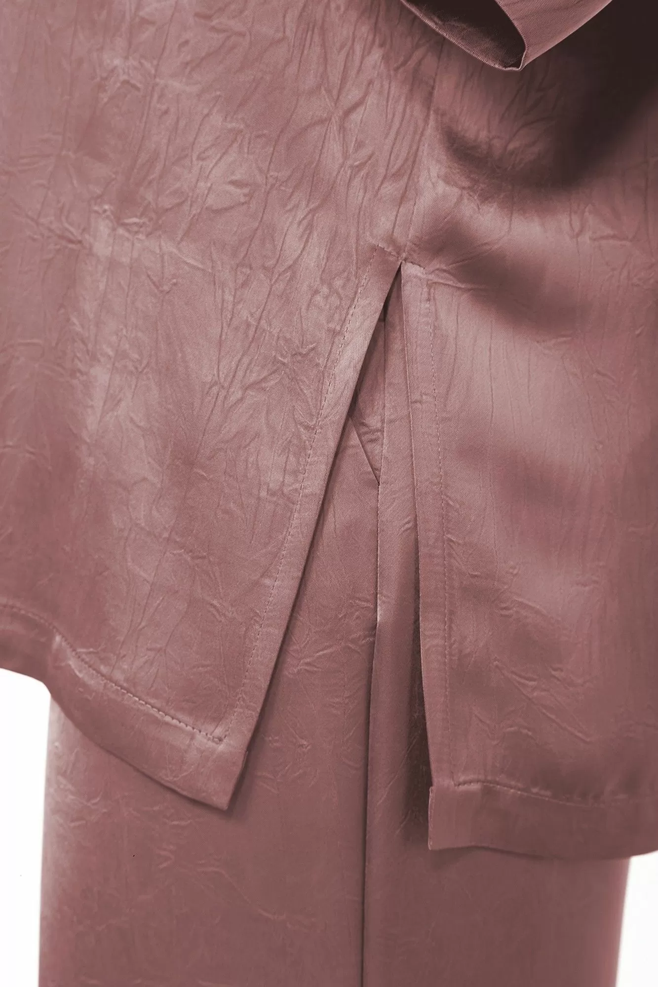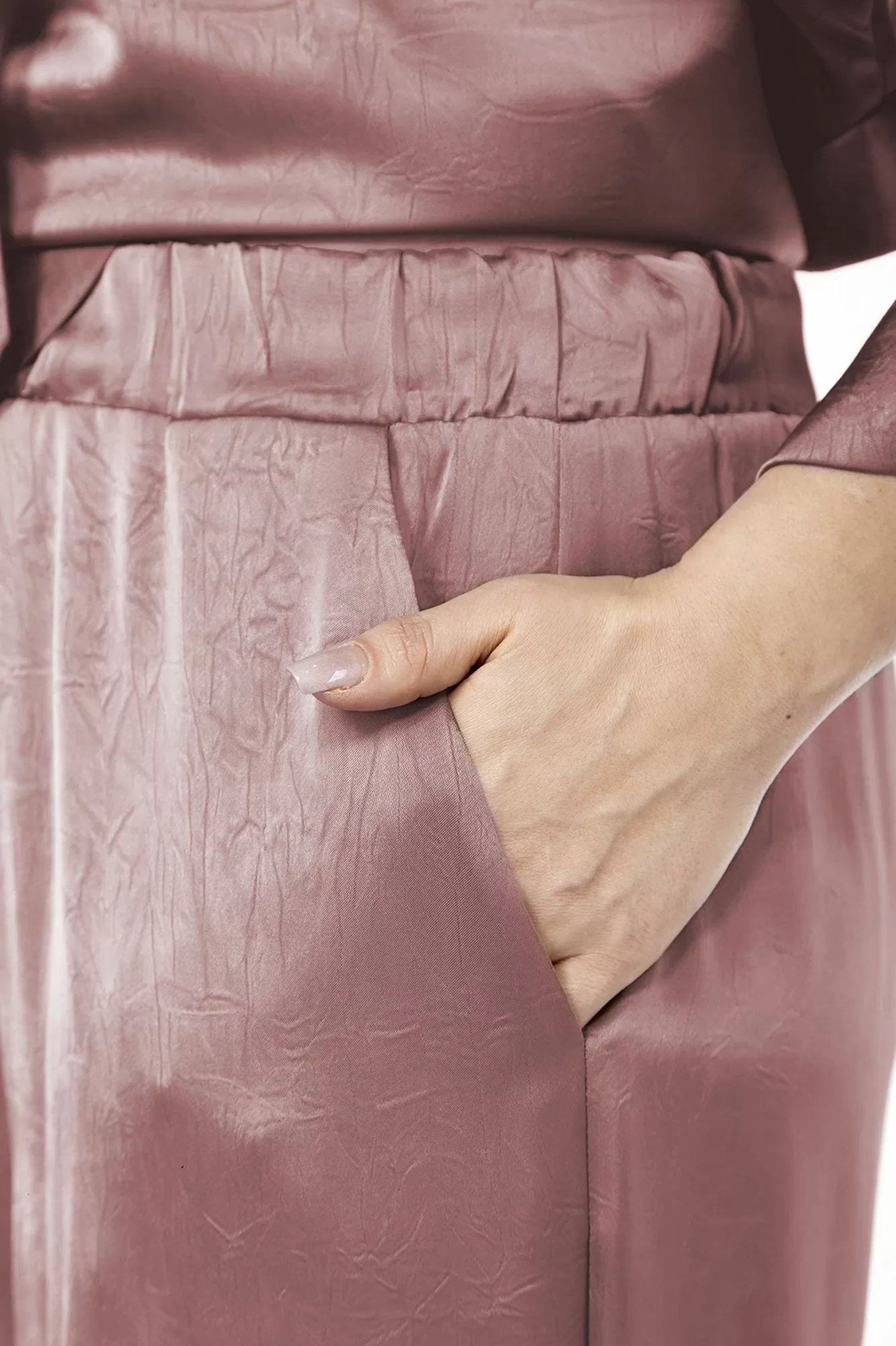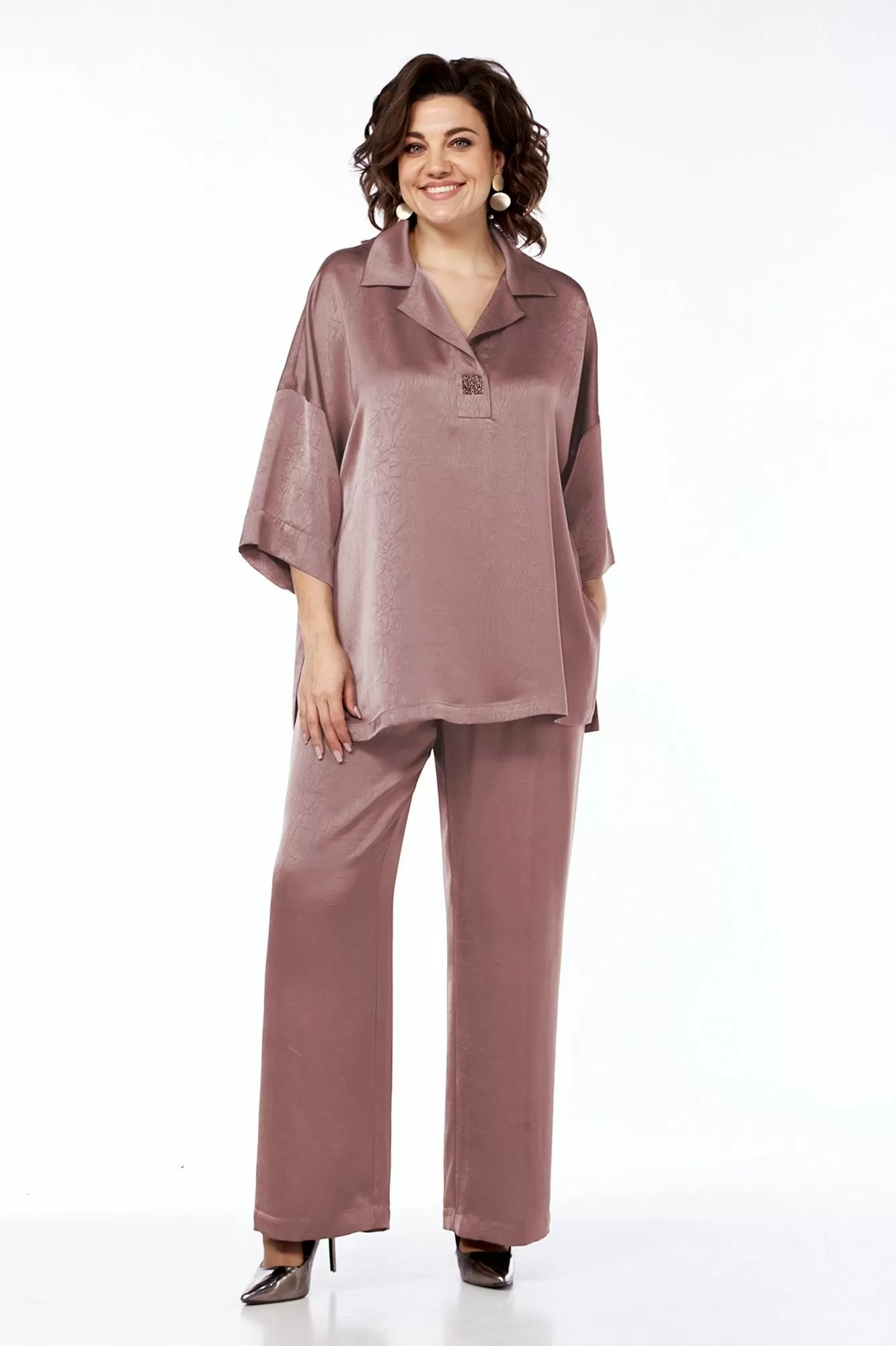 Костюм брючный двухпредметный, выполнен из костюмно-плательной ткани с эффектом легкой мятости. Состоит из блузки и брюк. Блузка свободного силуэта. Воротник стояче-отложной с лацканами переходящими в планку. На спинке кокетка, со встречной складкой. Рукава спущенные. Изделие дополнено съемным декором. Брюки средней посадки, свободного кроя. Пояс притачной на эластичной тесьме. В передних деталях обработаны карманы с подрезным бочком.