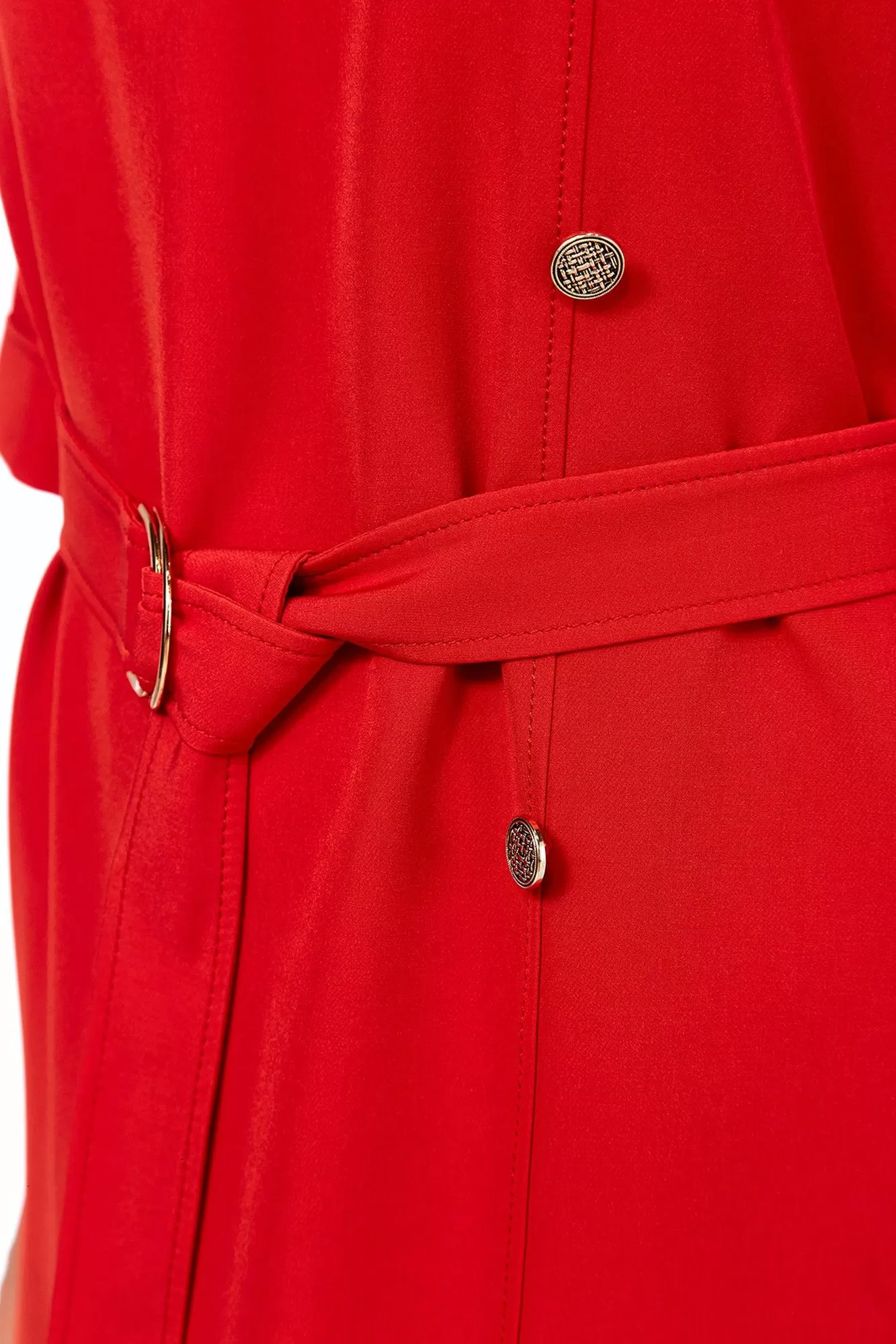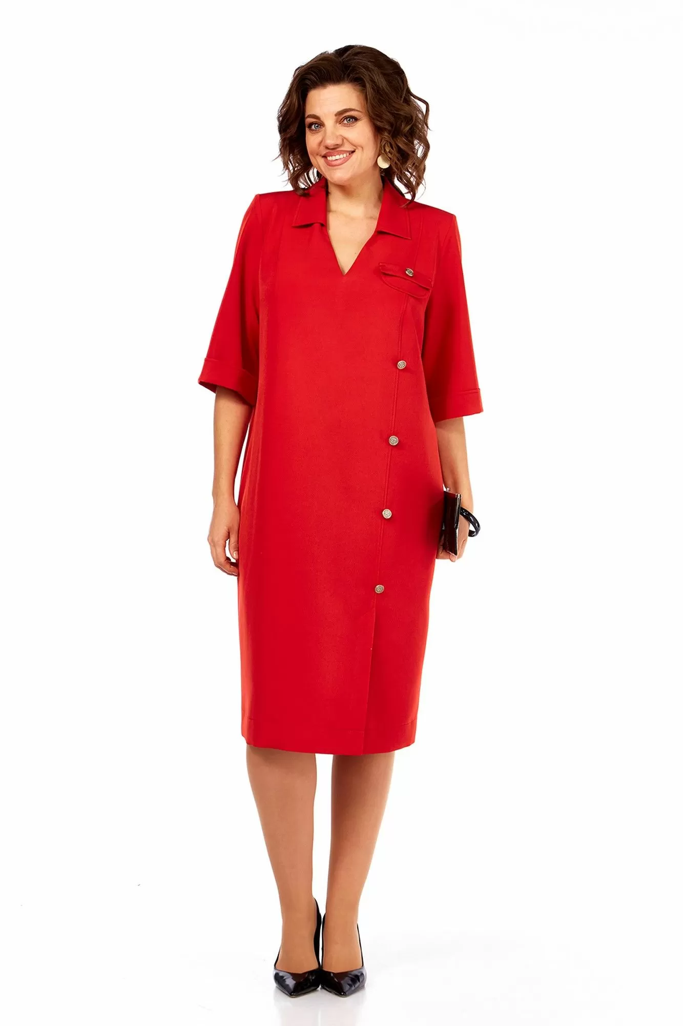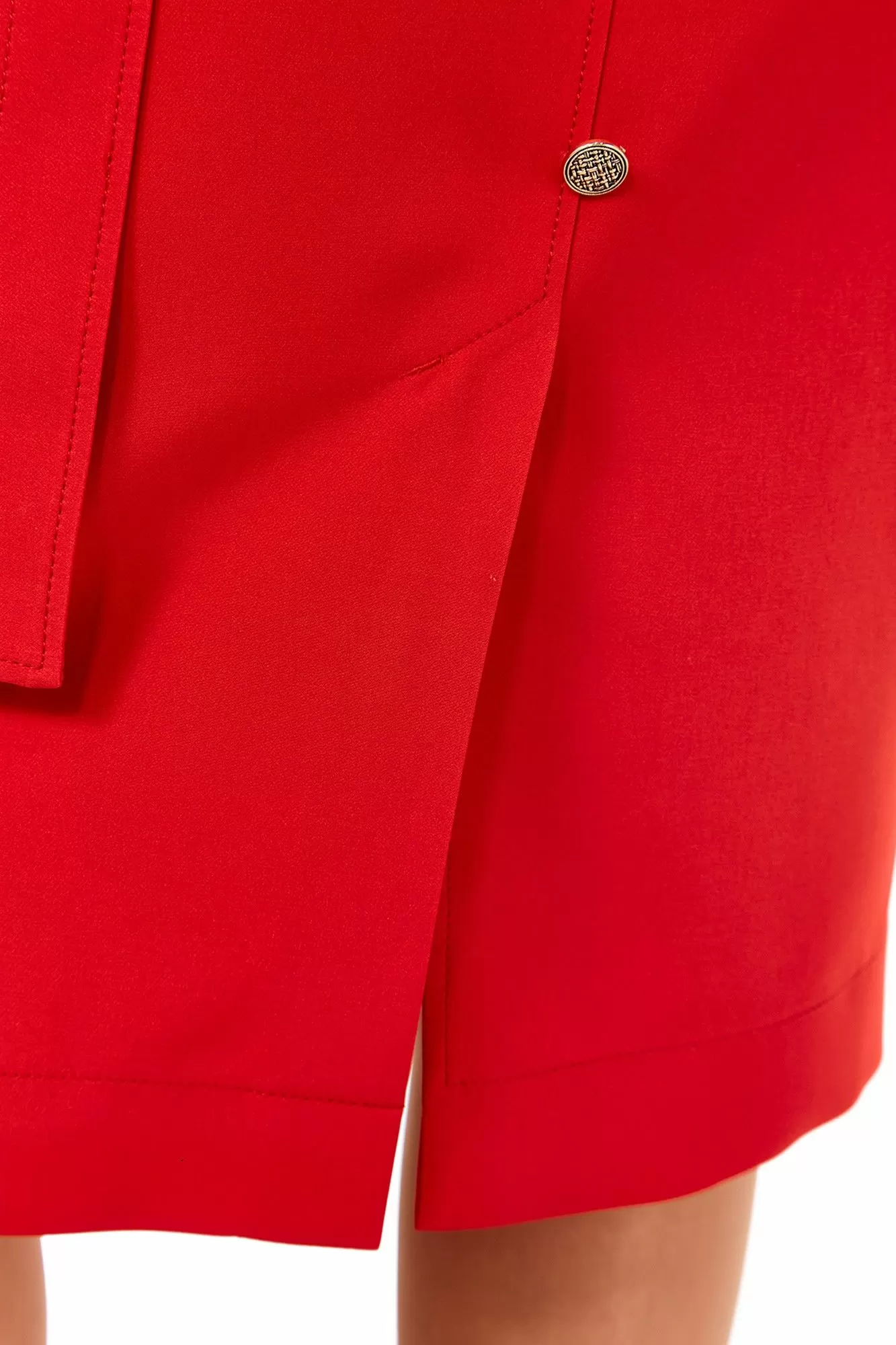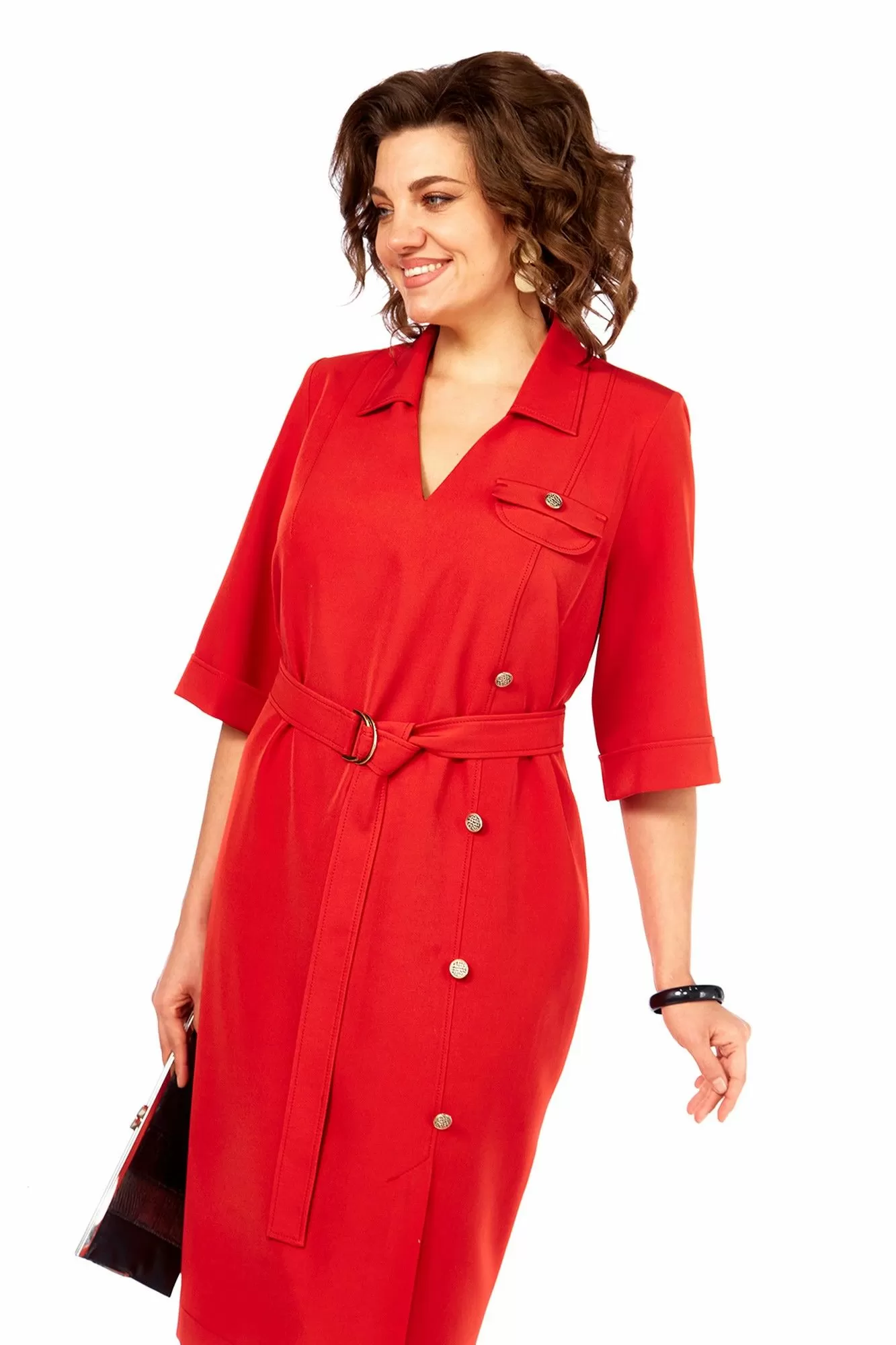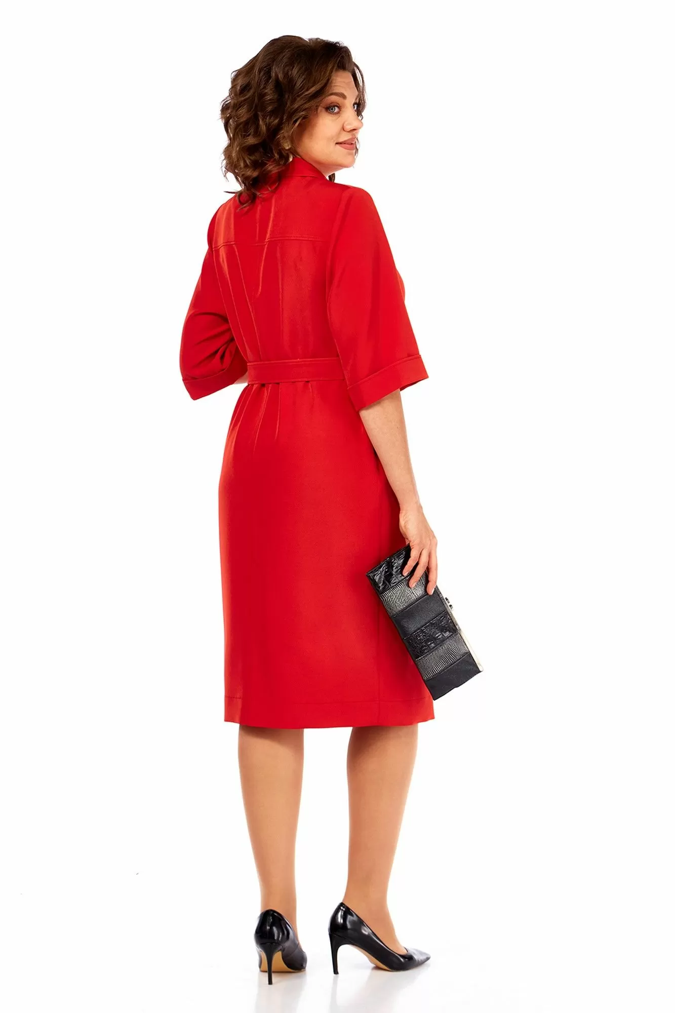 Платье женское прямого силуэта, выполнено из костюмно-плательной ткани. Вырез V-образной формы с отложным воротником. По переду обработан ассиметричный рельеф со шлицей по низу и декоративный клапан на груди. Спинка с кокеткой и средним швом. Рукава втачные, по низу отложные манжеты. Платье дополнено съемным поясом из основной ткани с полукольцами и декоративными пуговицами.