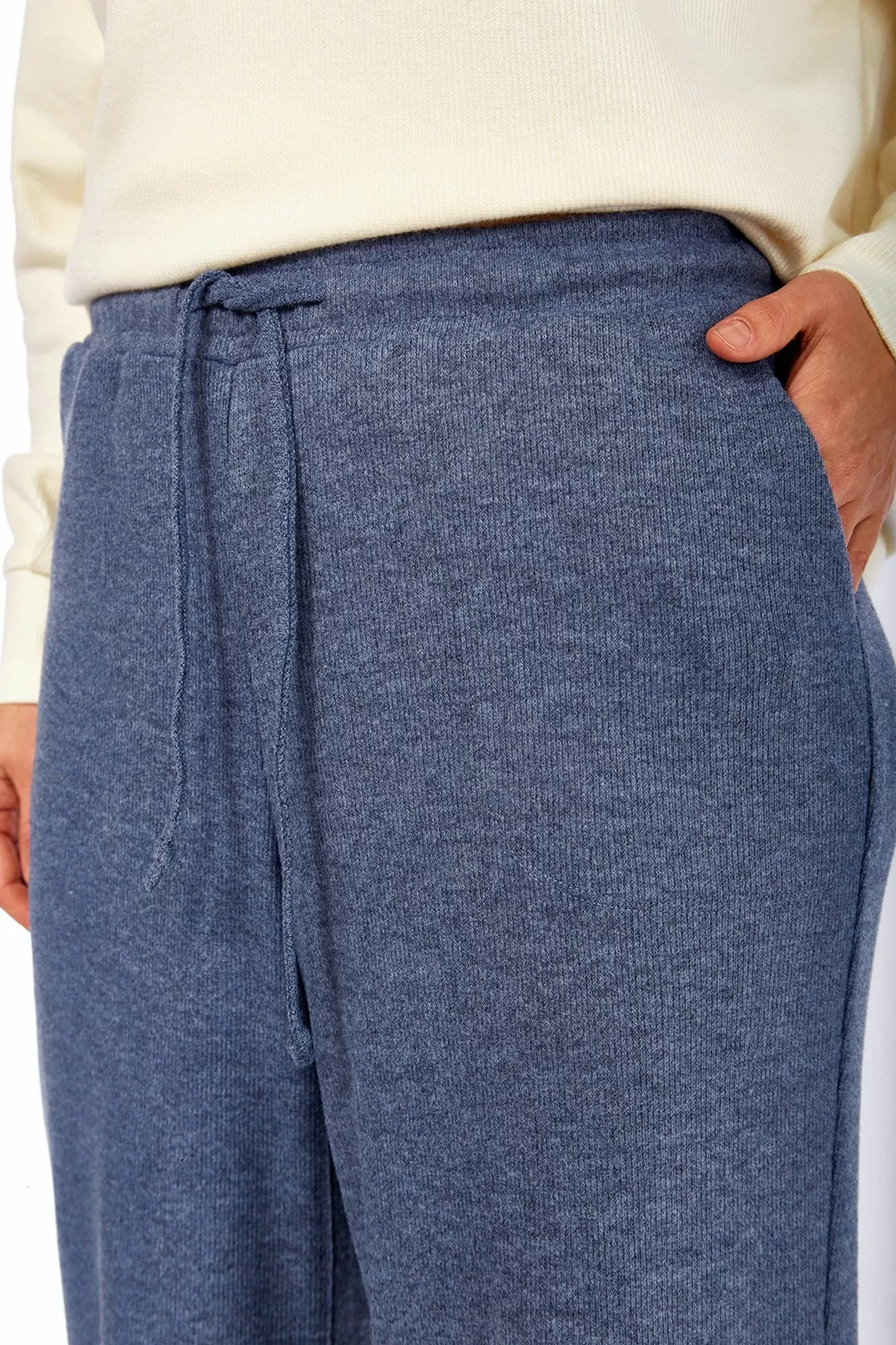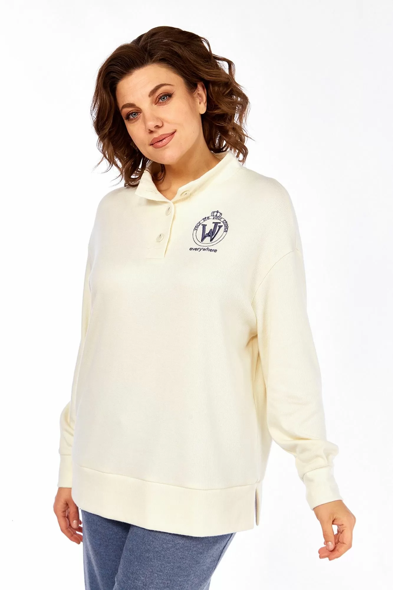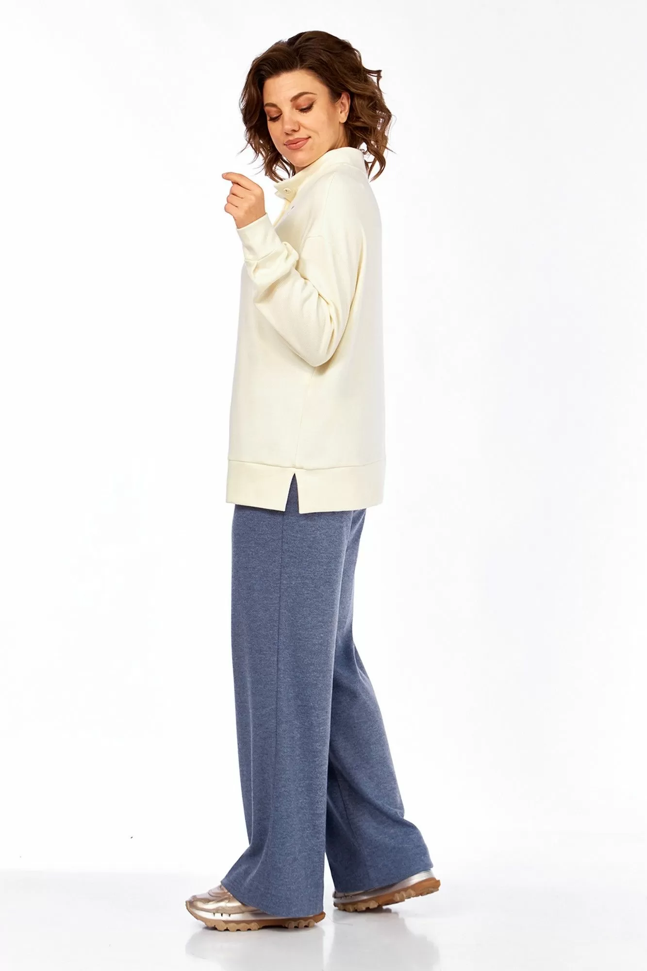 Комплект женский брючный двухпредметный, состоит из джемпера и брюк. Джемпер свободного кроя, изготовлен из трикотажного полотна. Горловина обработана воротником-стойкой и планками с застежкой на петли и пуговицы. Рукава спущенные, с манжетами. По низ изделия притачная деталь с разрезами по бокам. На полочке джемпера расположена вышивка. Брюки прямого силуэта, выполнены из трикотажного полотна. В передних деталях брюк обработаны карманы. Пояс притачной на эластичной тесьме.