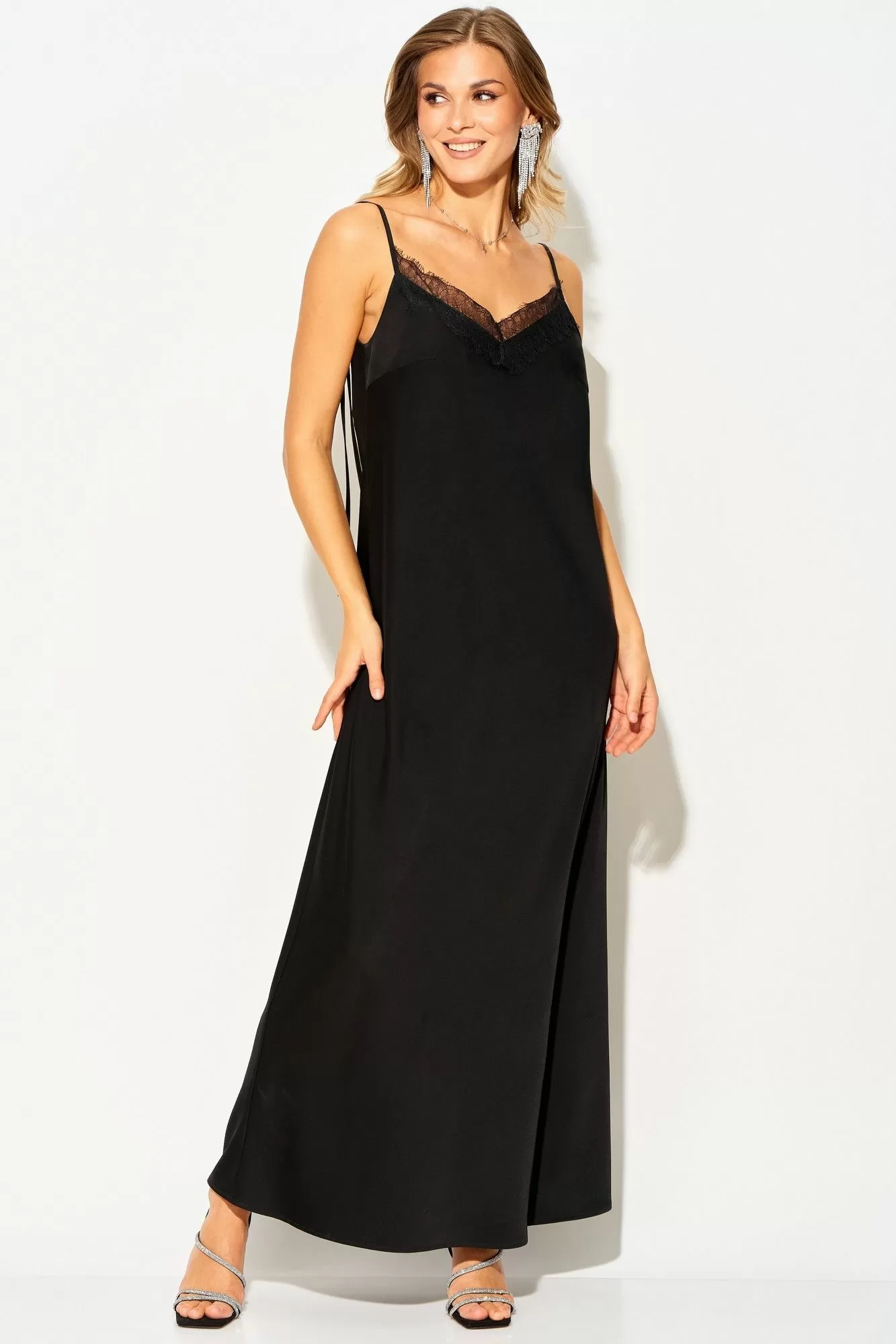Платье полуприлегающего силуэта, длиной «в пол», на бретелях, с «V-образным» вырезом горловины спинки и переда. Деталь переда платья с нагрудными вытачками, горловина оформлена декоративным кружевом.