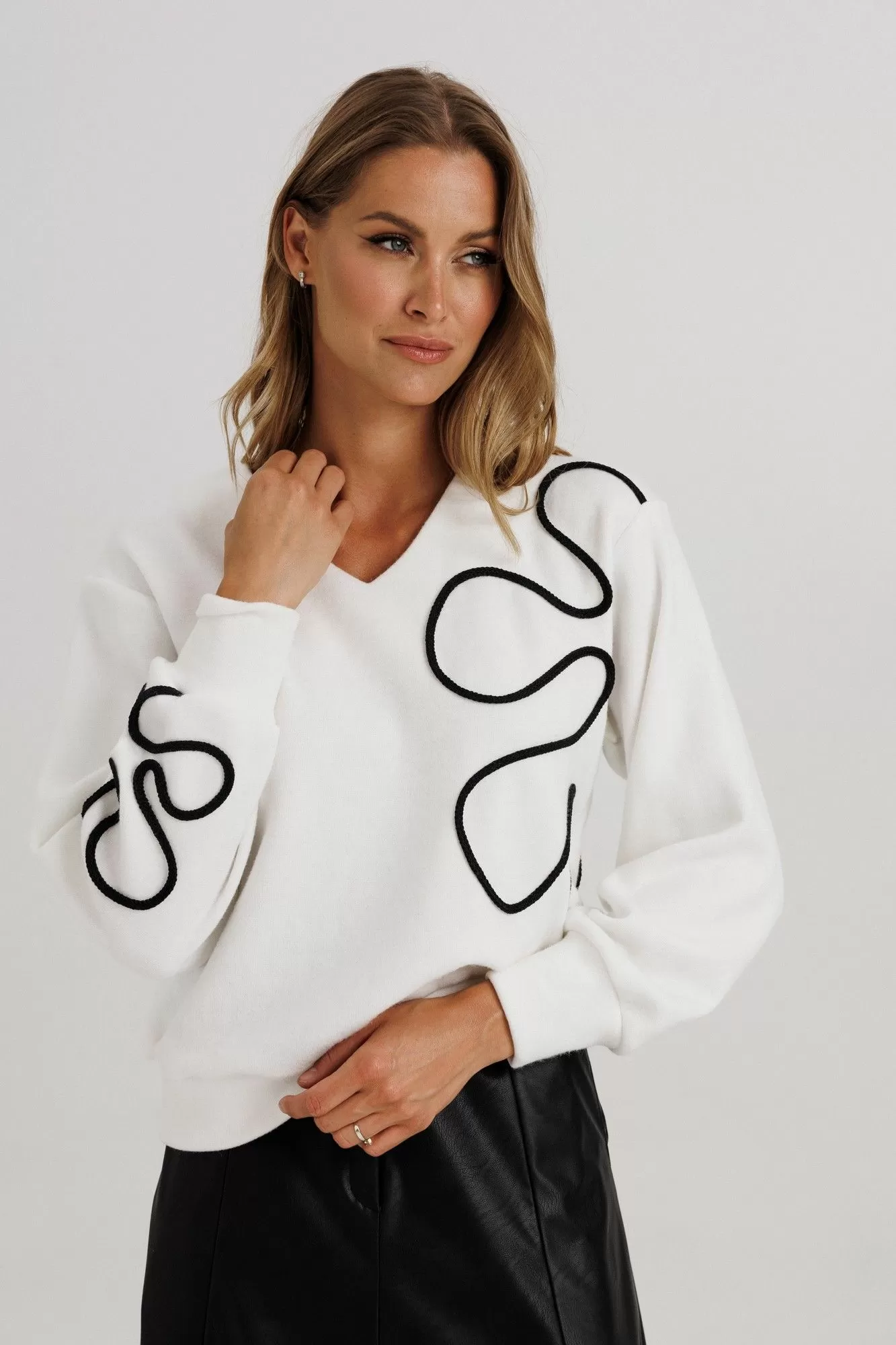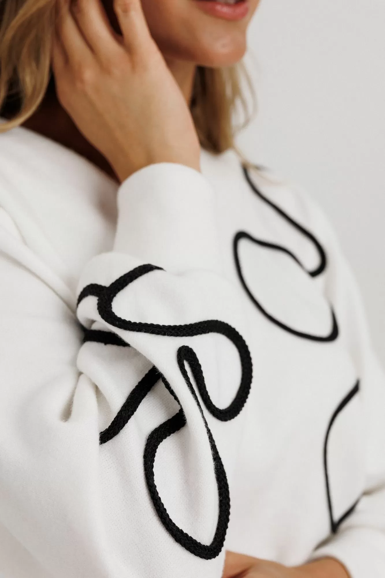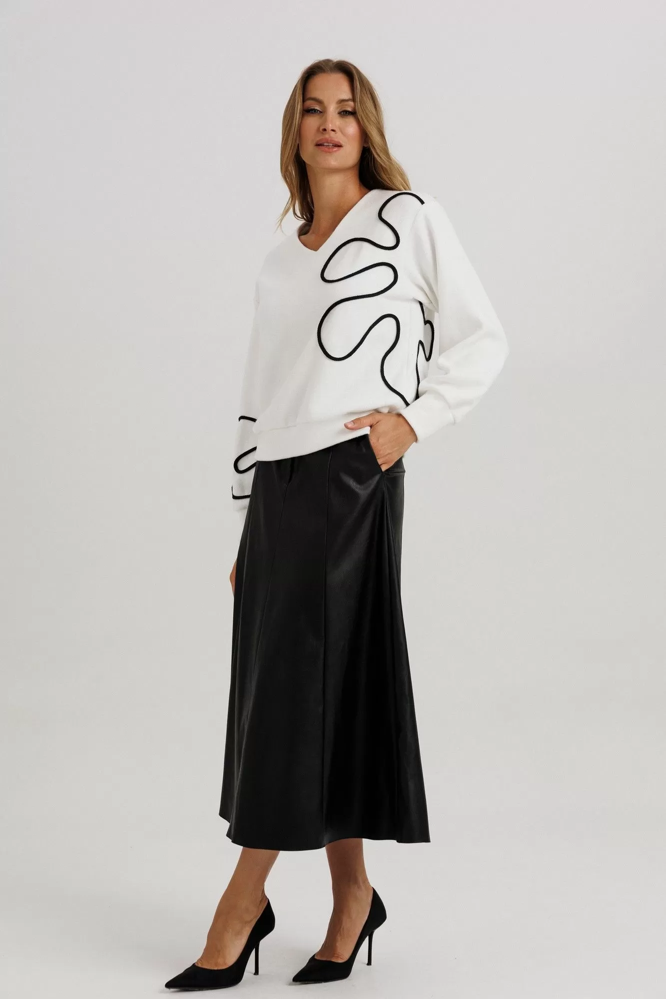 Декоративным элементом блузона выступает контрастный рисунок, напоминающий элементы лепестков цветочного узора. Расположены эти элементы ассиметрично, на одном из рукавов, также полочке и частично в боковом сегменте спинки блузона. Рисунок создан трикотажным кантом. Горловина оформлена угловым вырезом на полочке и оформлена притачным обтачным элементом. Низ блузона оканчивается притачной манжетой, высотой 7,5 см. Длина блузона по спинке изделия 61 см.