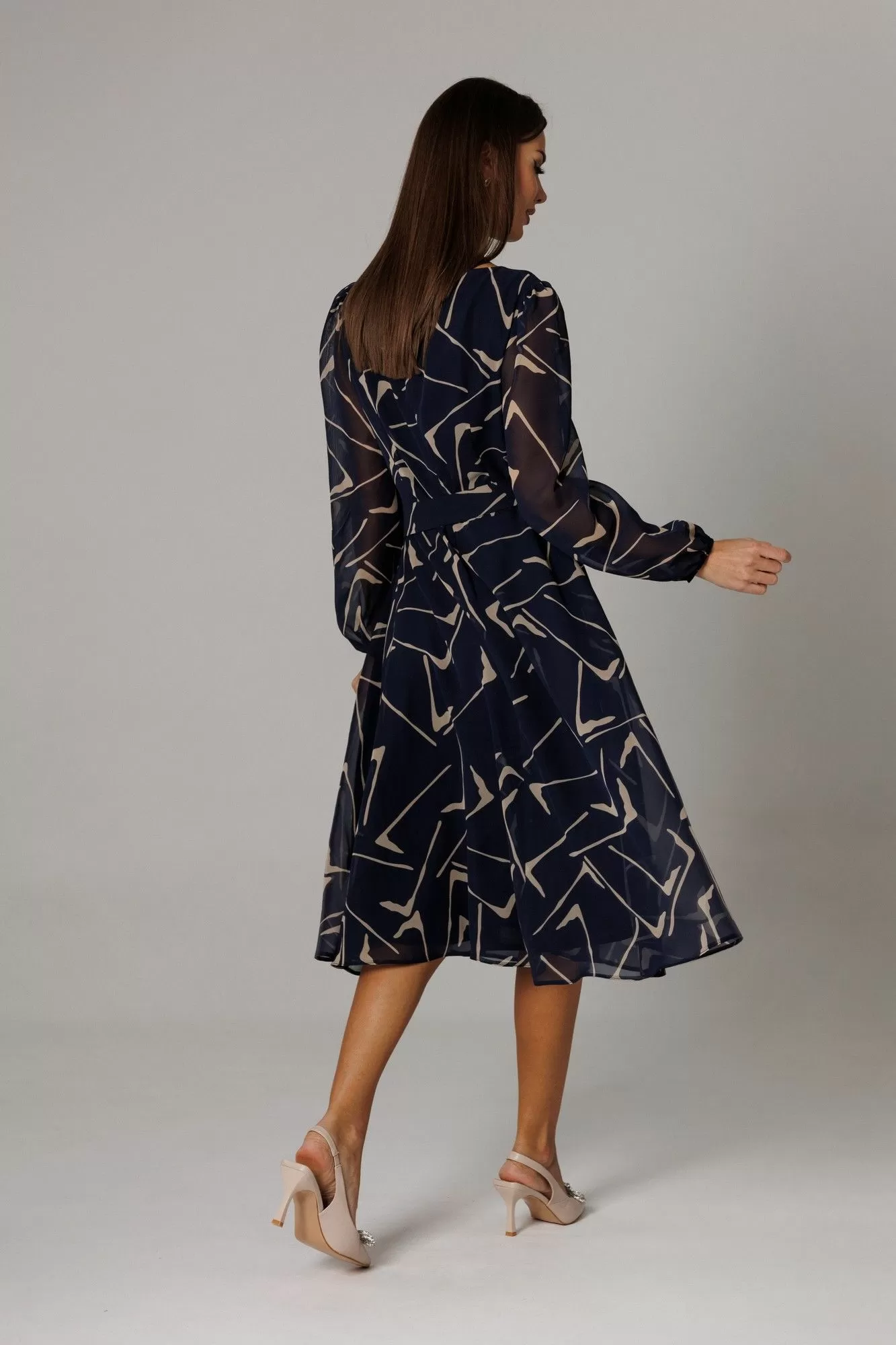 Элегантное платье, отрезное по линии талии из воздушного шифона на подкладке. В верхней части изделия расположены нагрудные горизонтальные вытачки, по спинке и полочке: вертикальные талиевые. Линия горловины оформлена в форме «лодочка». Нижняя часть платья по крою: «полусолнце». В среднем шве спинке потайная застежка-молния. Рукав втачной, одношовный. По окату и низу рукава-сборка. Длина платья по спинке 111 см. Длина рукава 62 см.