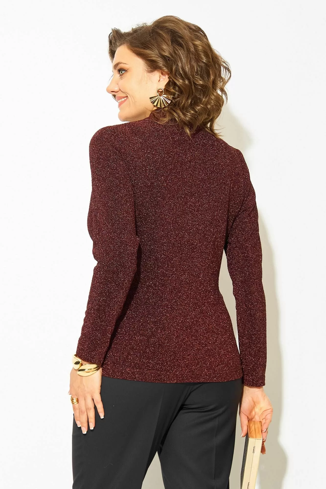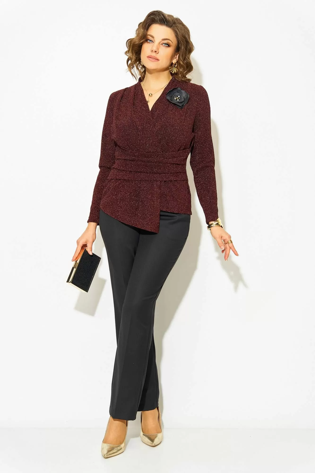 Этот комплект станет отличным выбором для тех, кто хочет выглядеть стильно и ярко, не жертвуя комфортом и удобством. Эффектная нарядная блузка, выполнена из мягкого трикотажа с мерцающим эффектом. Такой дизайн ткани придает необычное переплетение нитей: с изнанки мягкий однотонный трикотаж! Вырез горловины мягкая стойка, переходящая в V-образный вырез с имитацией запаха. По полочке заложены декоративные складки для комфортного прилегания изделия. Низ блузки ассиметричный. Пояс декорирован задрапированным поясом из основной ткани, что зрительно стройнит и скрывает все недостатки фигуры. Рукав в точной, длинный. Спинка приталенная, без особенностей. К блузке предусмотрен съемная брошь, в виде цветка.
