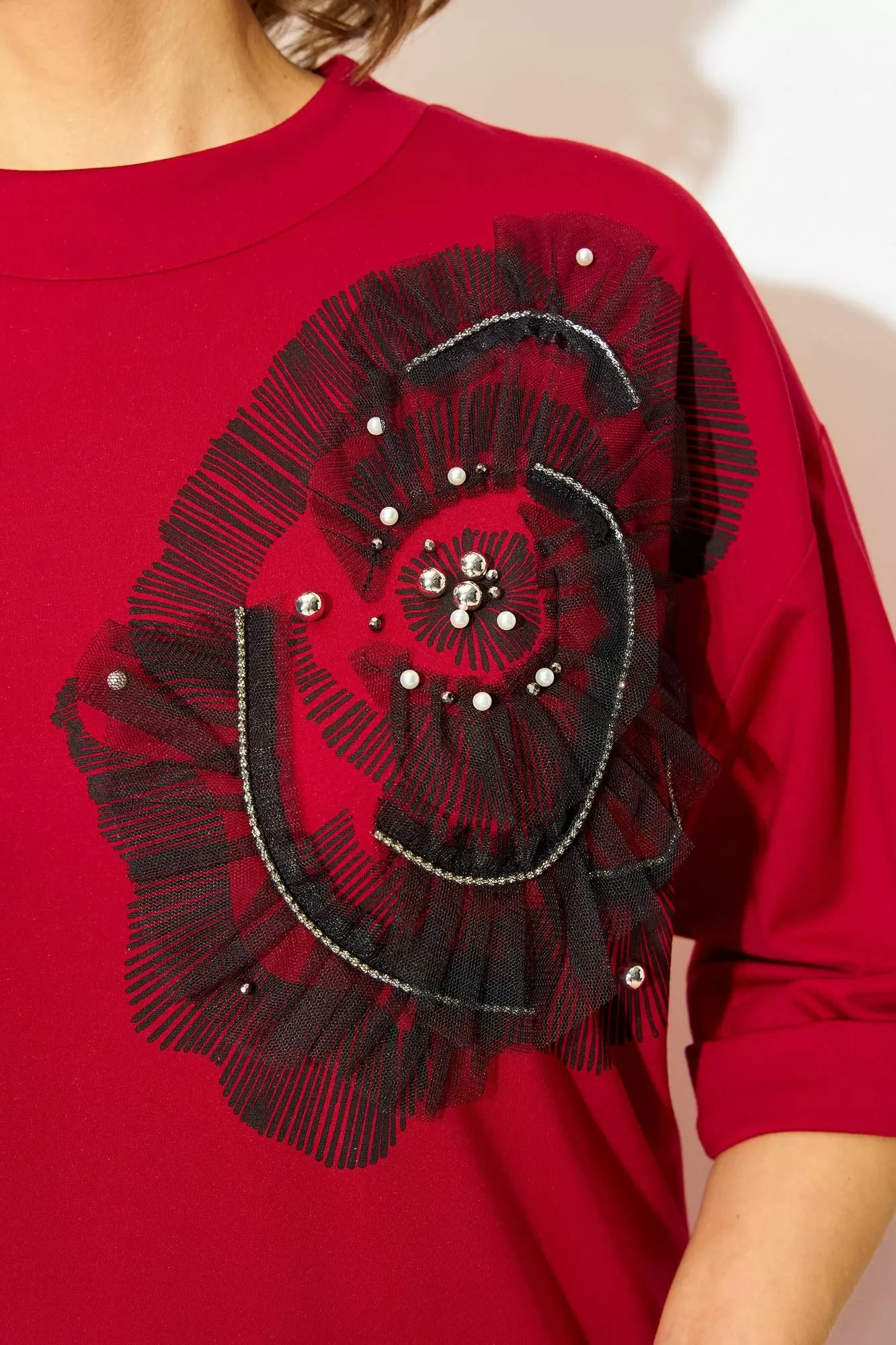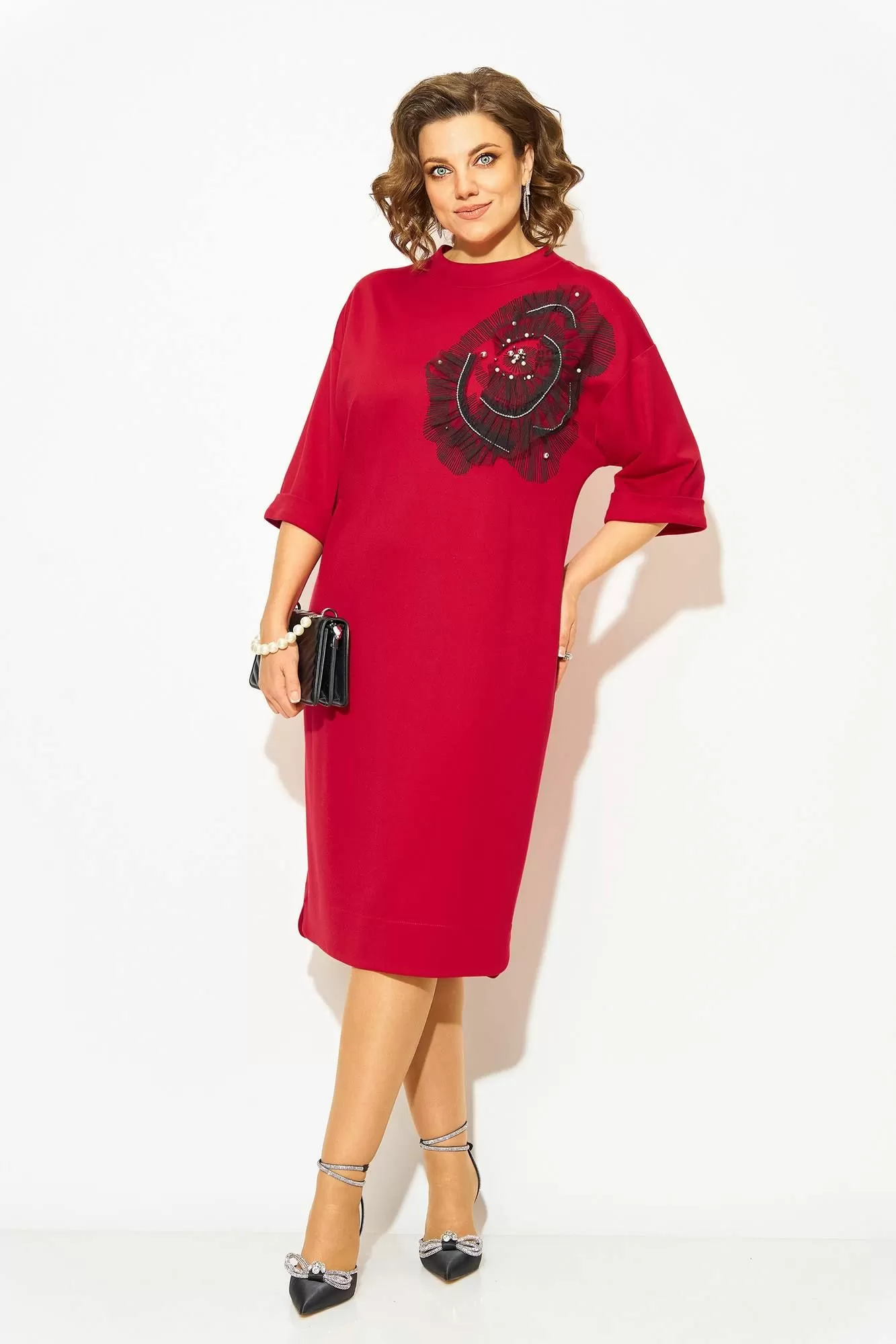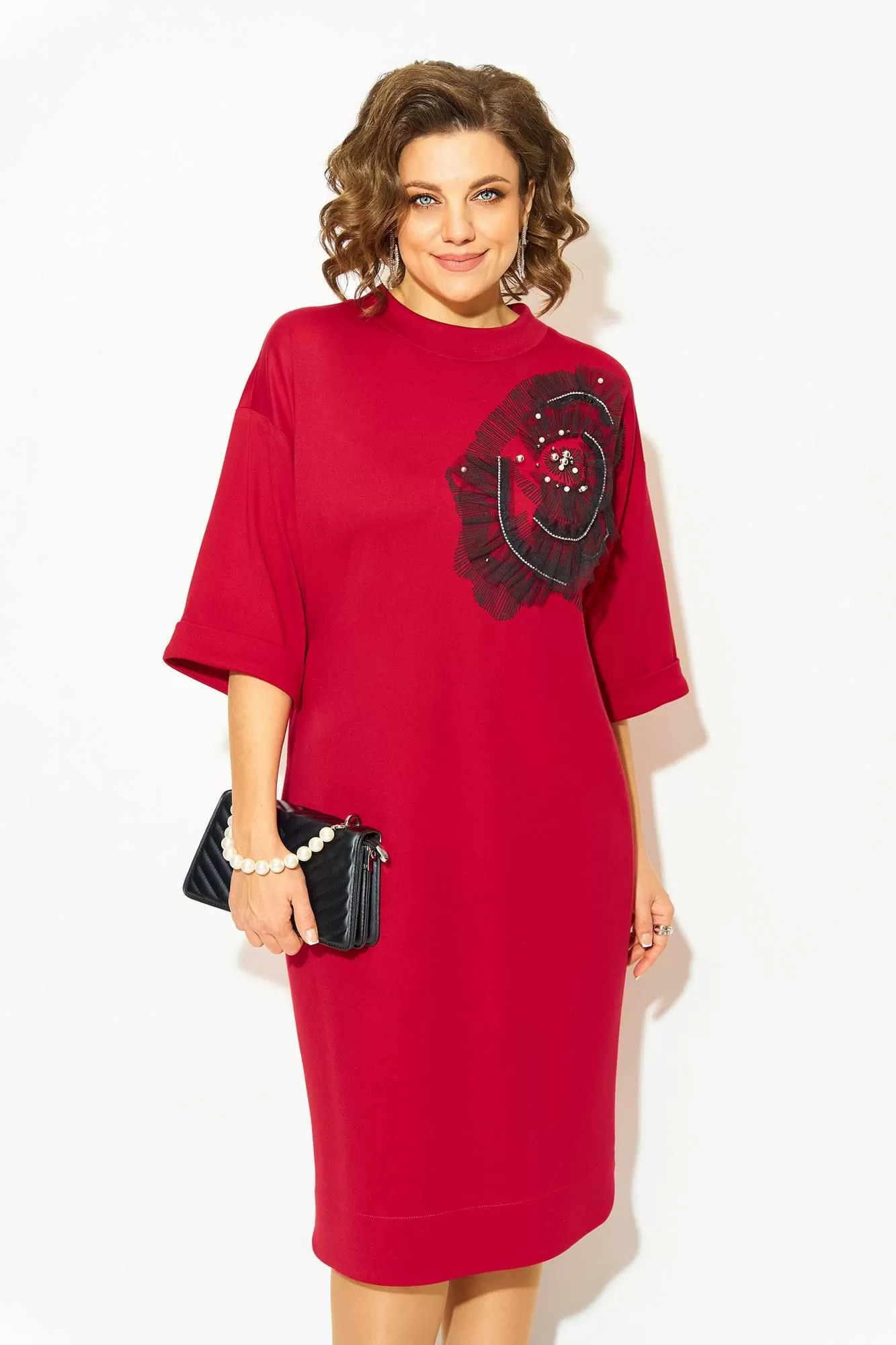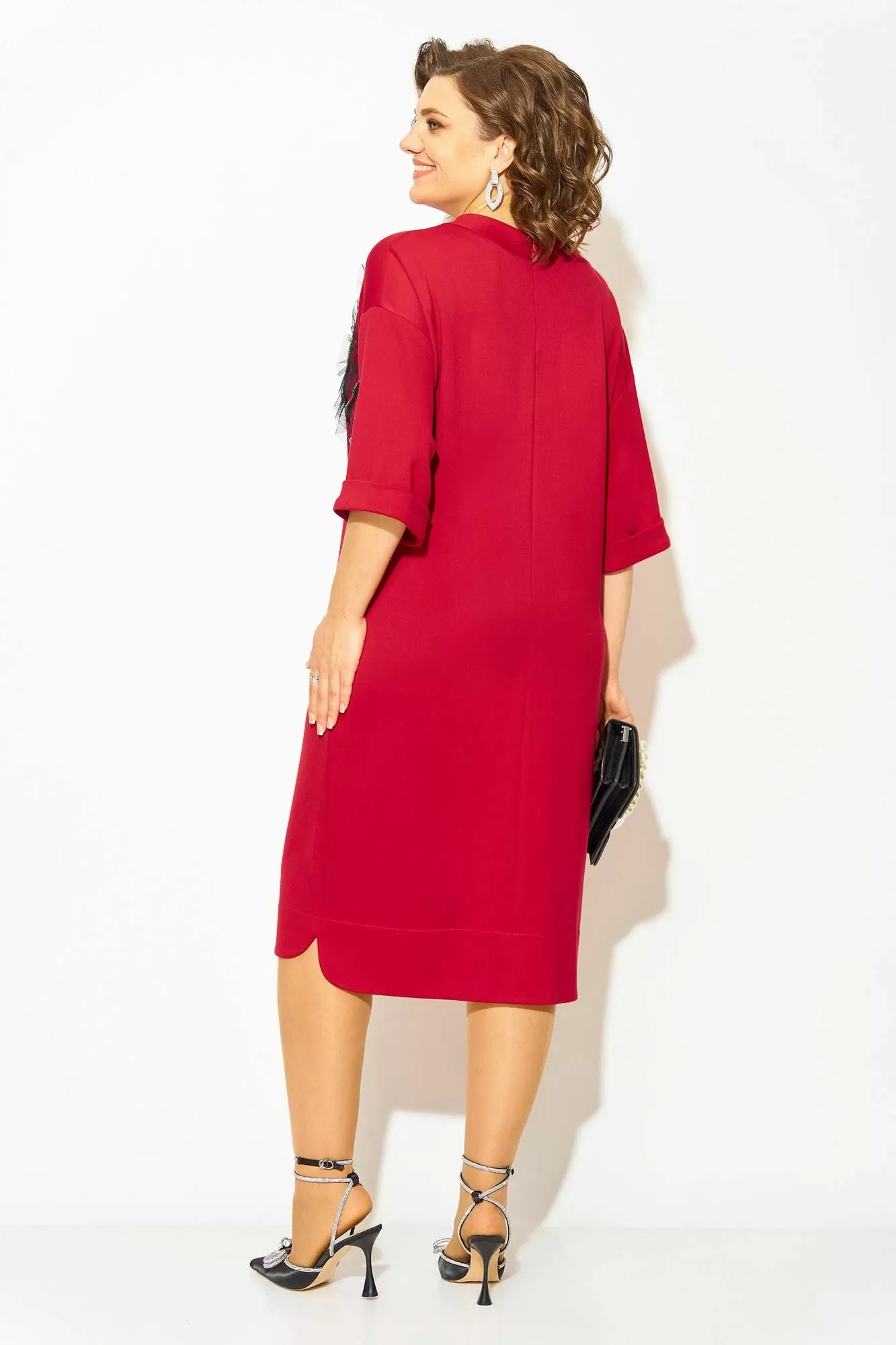 Очень лаконичное и стильное платье определённо привлечёт к себе внимание окружающих. Модель свободного «о»-образного силуэта. Левую часть плеча и груди украшает изысканная печать аппликация в виде цветка с декором из бусин и жемчуга. Платье с мягко лежащей стойкой у горловины. Рукав длиной ¾-ти, на притачной манжете на отворот. Модель слегка заужена к низу, с разно уровневым фигурным низом, оформленный обтачкой. В платье предусмотрены карманы.