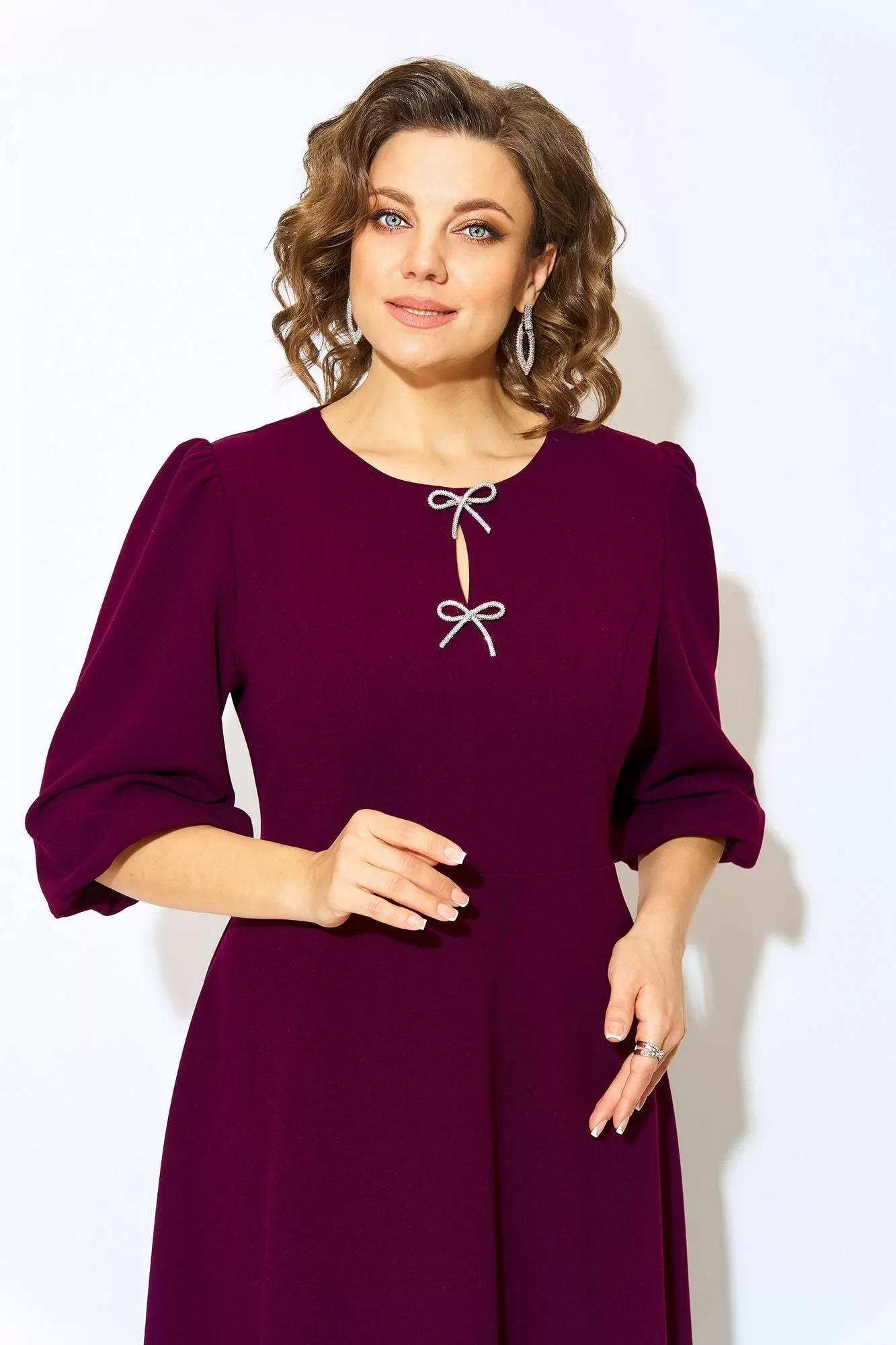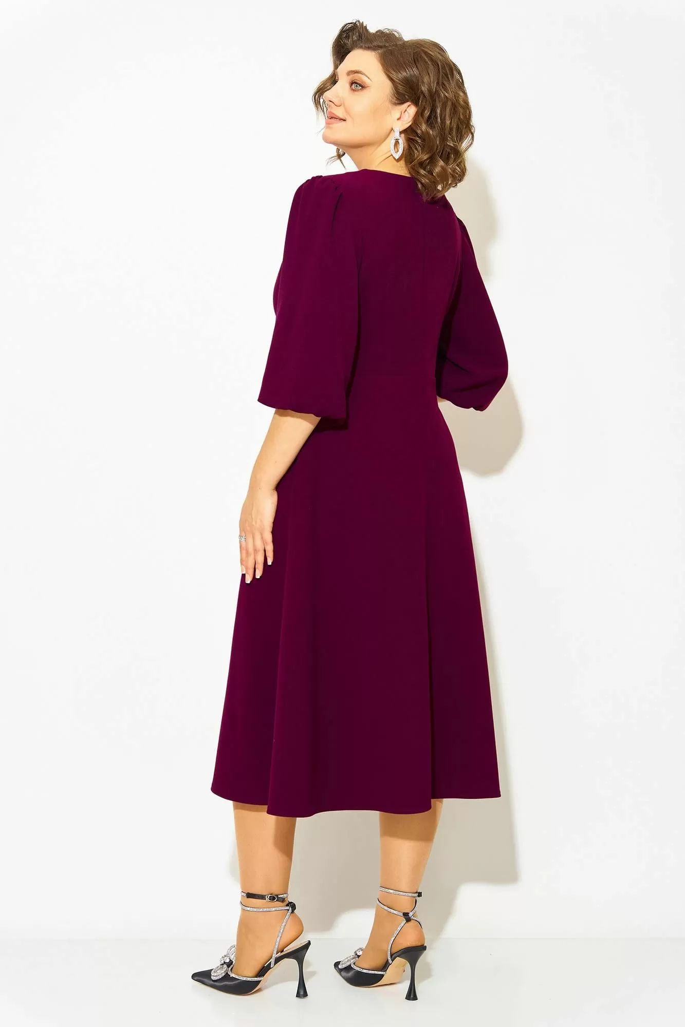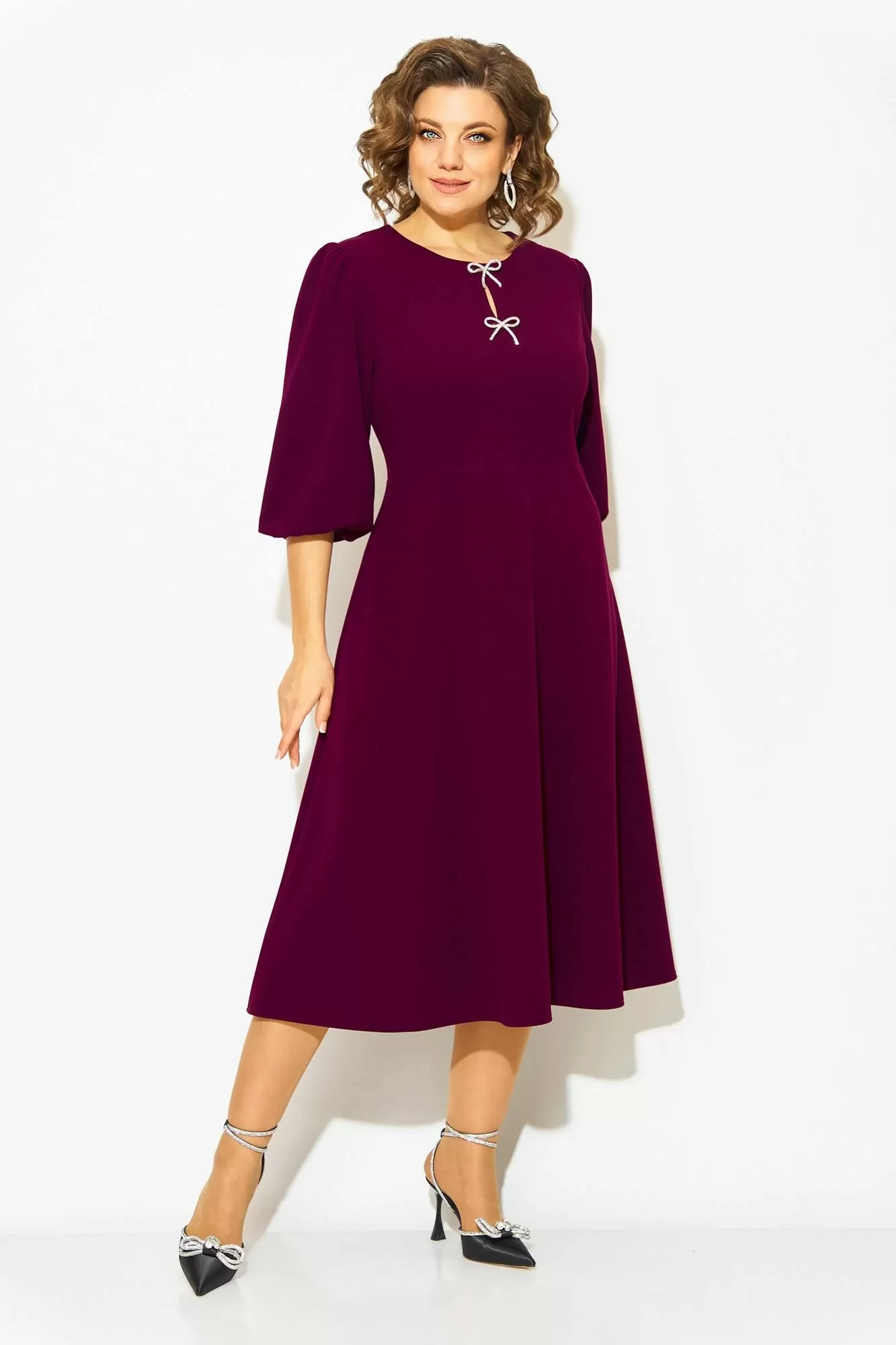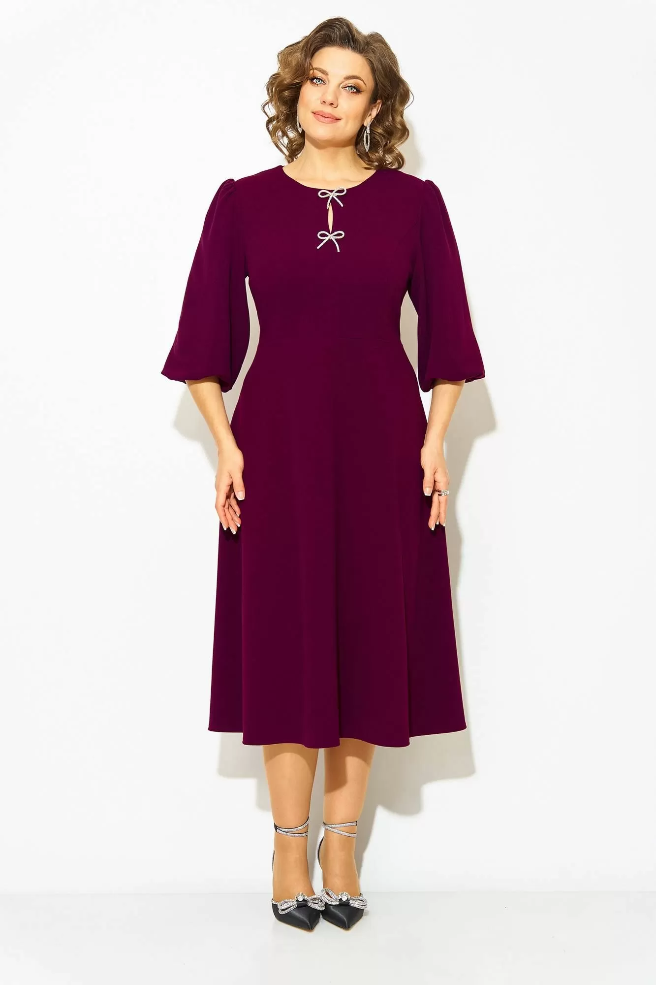 Волшебное и неповторимое - это женское платье с округлым вырезом горловины, созданное талантливым дизайнером олицетворяет элегантность и стиль. Выполненное из трикотажного крепового материала, это платье обеспечивает комфорт и свободу движений. Модель отрезная по линиям талии, с продольными рельефами по полочке. Юбка расклешена к низу – полу солнце. Эффектный рукав-фонарик длиной ¾-ти, присборен по окату и поставлен на трикотажную подкладку. Небольшая капелька по лифу крашена съёмными брошами в виде банта. Застежка – потайная тесьма-молния по спинке. Длина по спинке – 115 см, рукав – 50 см.
