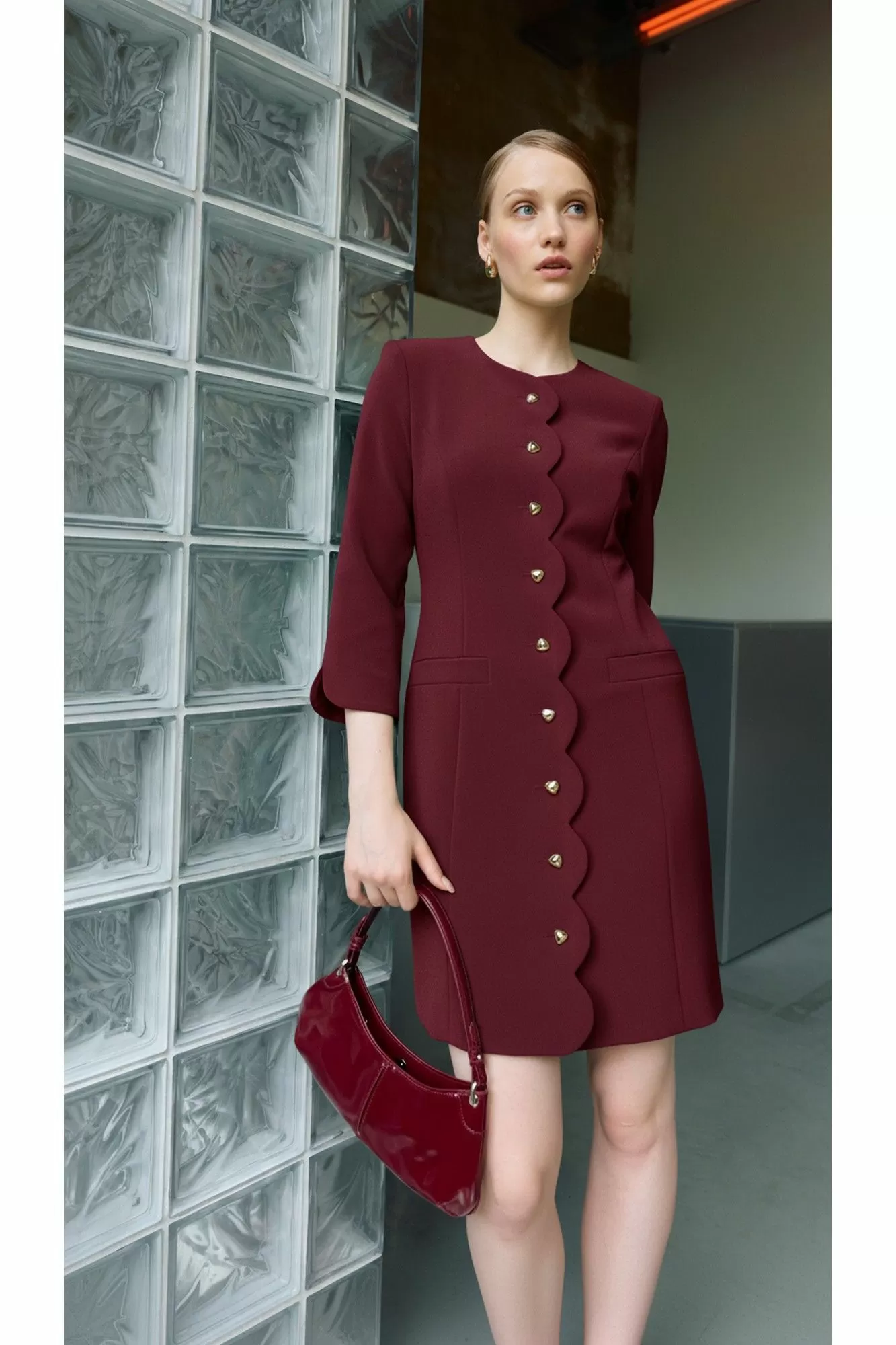 Платье полуприлегающего силуэта, по переду и спинке на подкладке. Рукав втачной ¾, по низу фигурный. Округлый вырез горловины, застежка центральная на петли и пуговицы, борт фигурной формы. По вертикальный рельефы и прорезные карманы. По спинке средний шов и вертикальные рельефы.