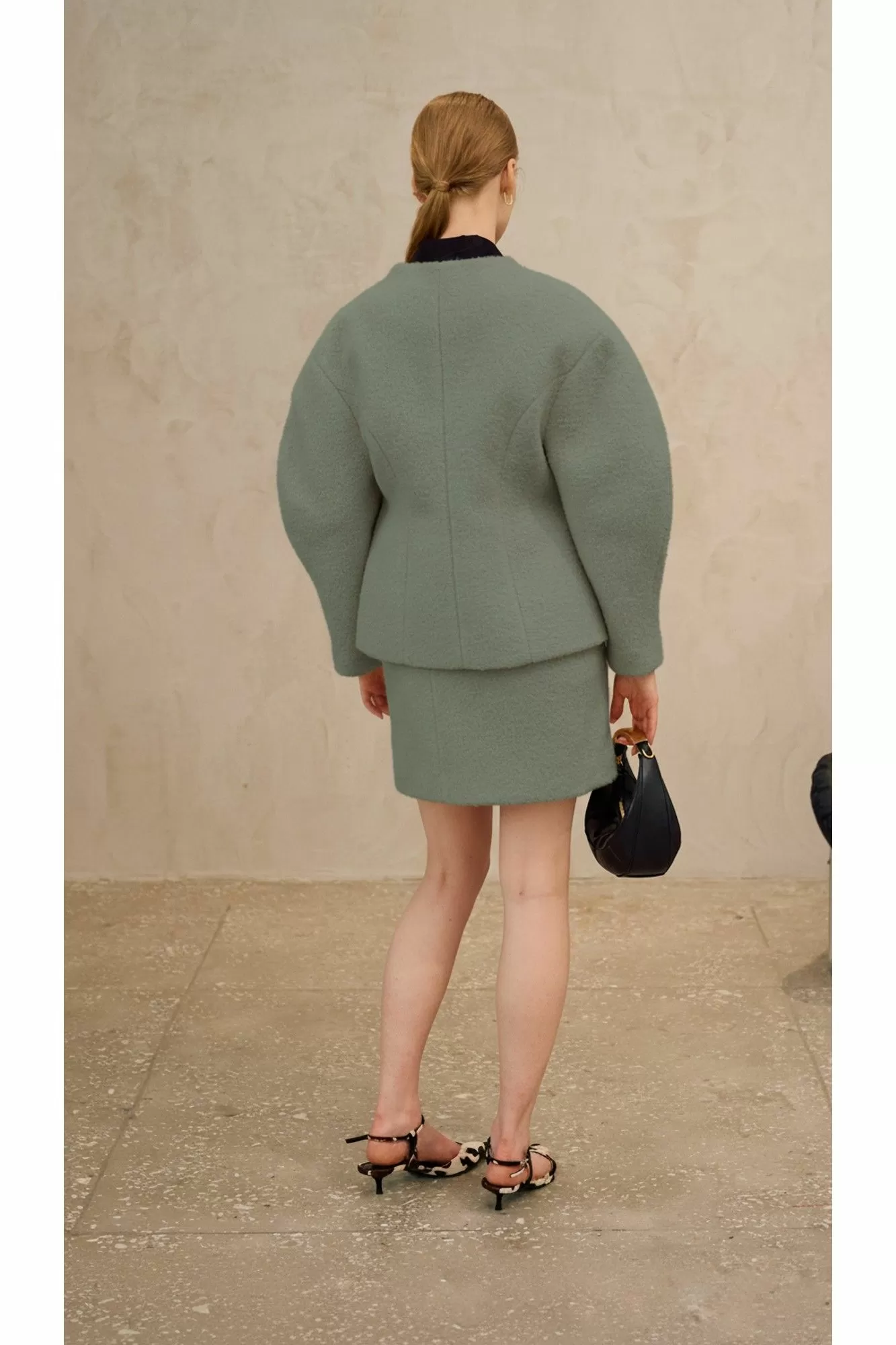 Комплект состоит из полупальто и юбки. Полупальто полуприлегающего силуэта на подкладке. Линия плеча спущена, рукав фигурной формы. Цельнокроеный воротник, переходящий в центральную застежку на потайные кнопки. По переду прорезные карманы с отлетными клапанами. По спинке средний шов и рельефы. Юбка в длине мини, прямого силуэта, на обтачке. По бокам прорезные карманы. По спинке средний шов, переходящий в потайную молнию.