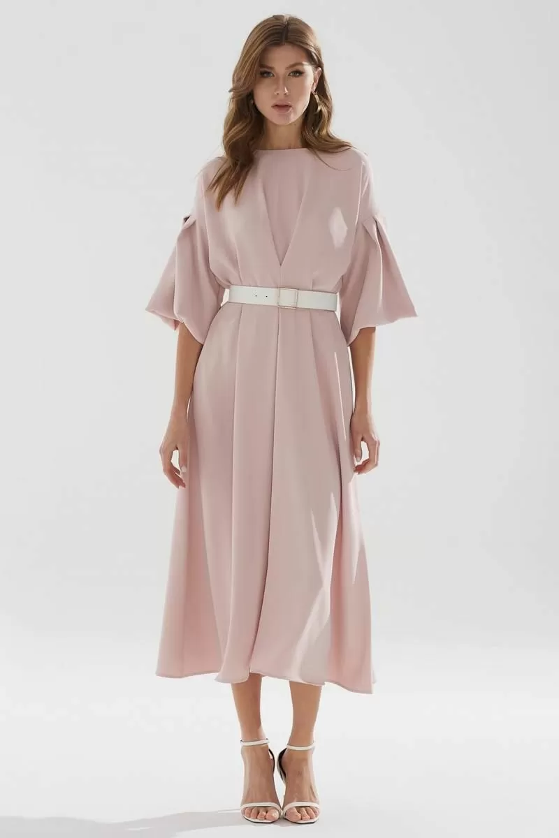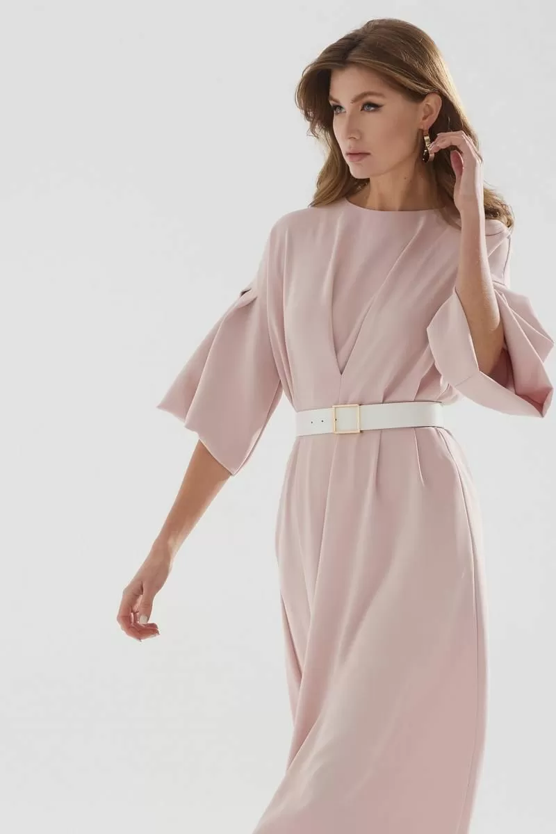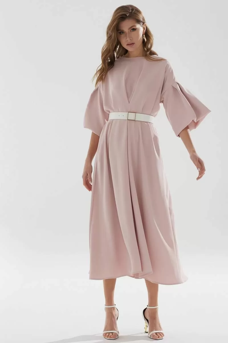 Нарядное платье А-образного силуэта из струящейся ткани. Горловина округлая, на спинке застежка на петлю и пуговицу. По переду и спинке декоративная складка. Рукав со спущенной линией плеча, расклешенный книзу. В боковых швах функциональные карманы. В комплект входит ремень.