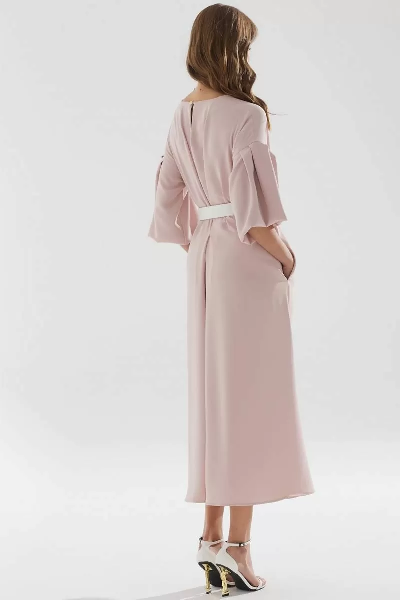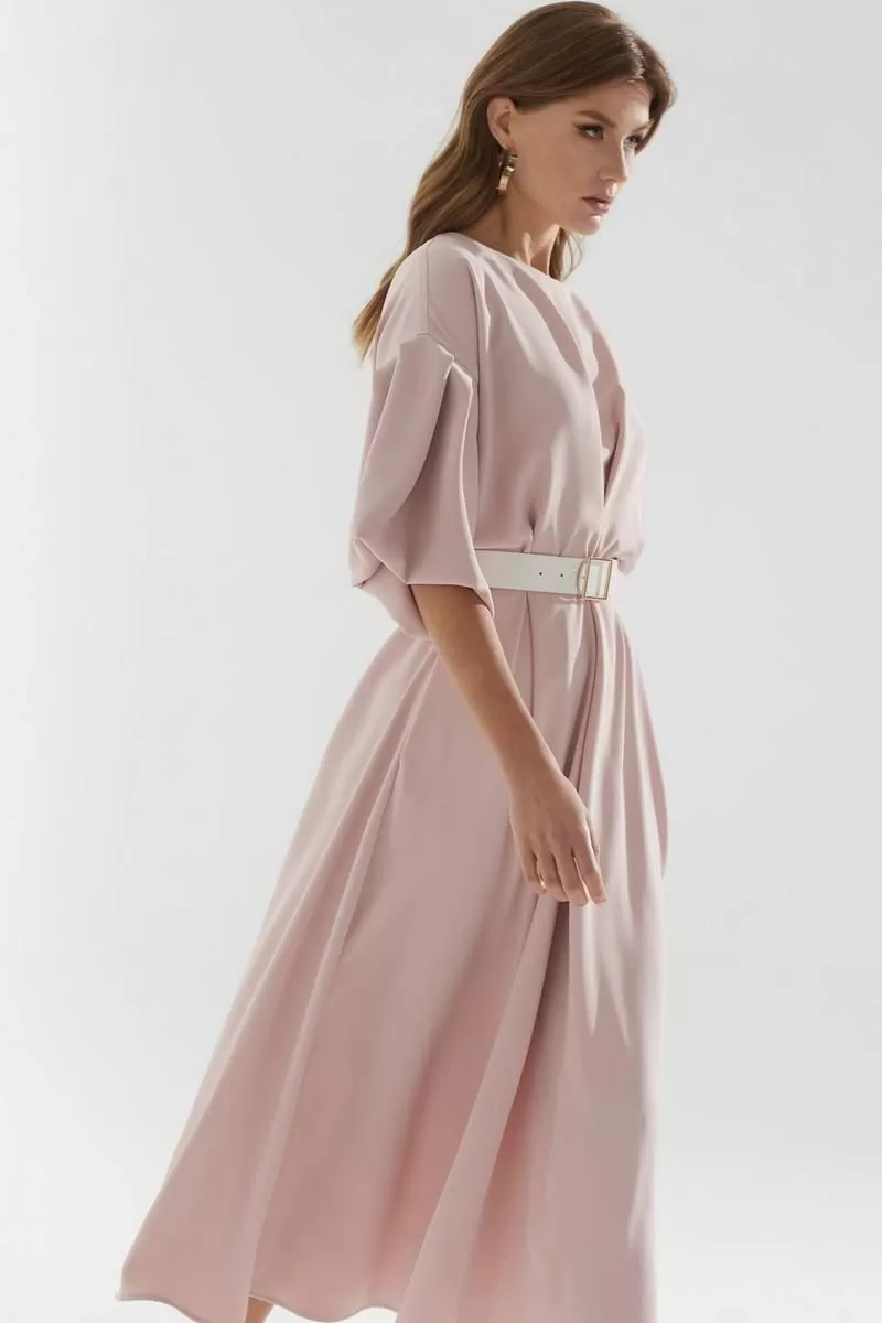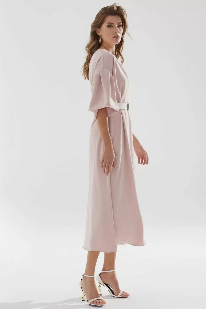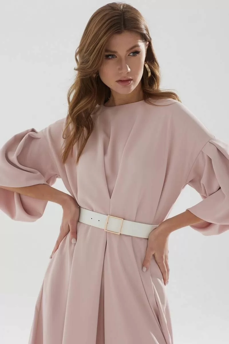 Нарядное платье А-образного силуэта из струящейся ткани. Горловина округлая, на спинке застежка на петлю и пуговицу. По переду и спинке декоративная складка. Рукав со спущенной линией плеча, расклешенный книзу. В боковых швах функциональные карманы. В комплект входит ремень.