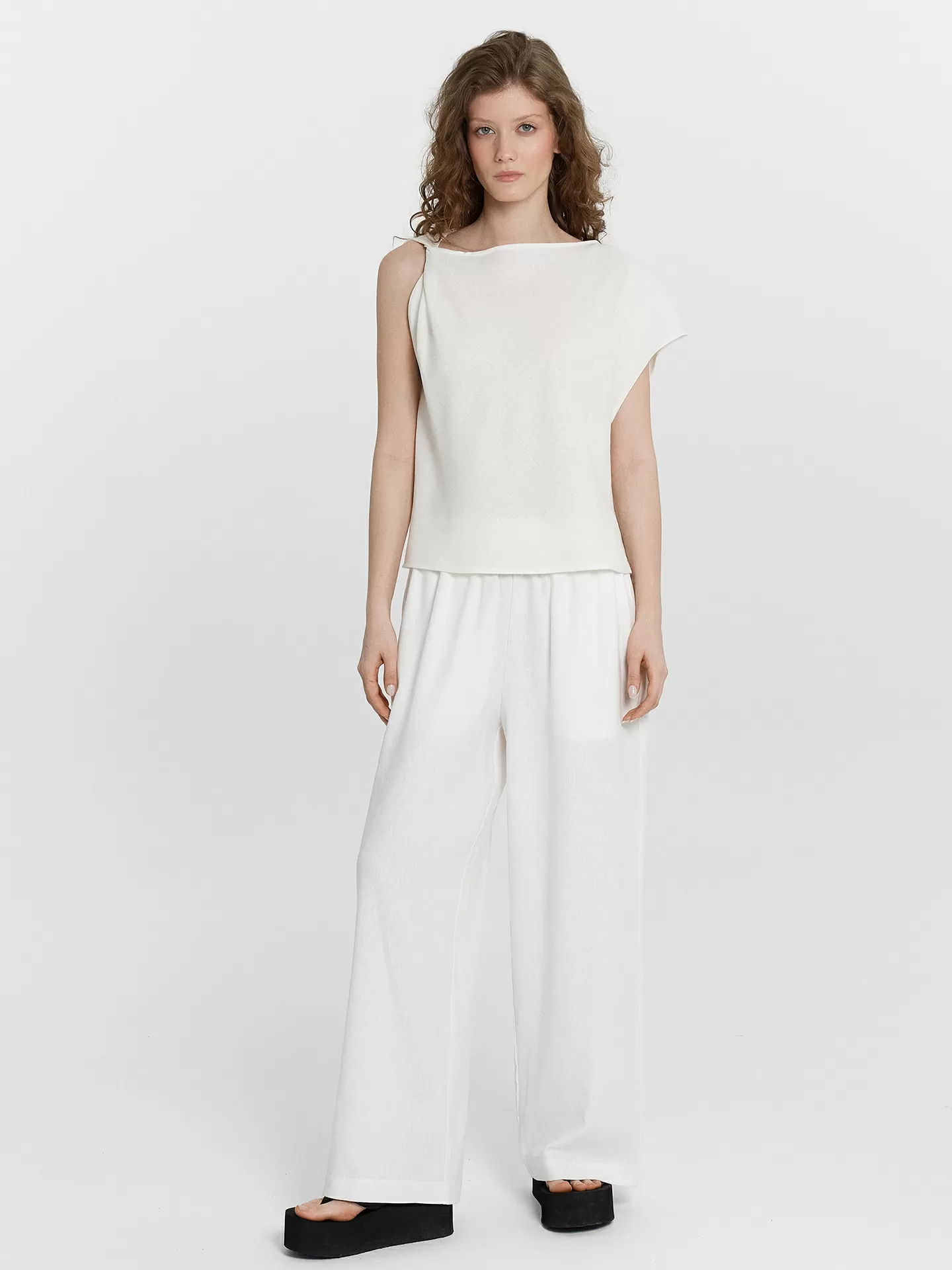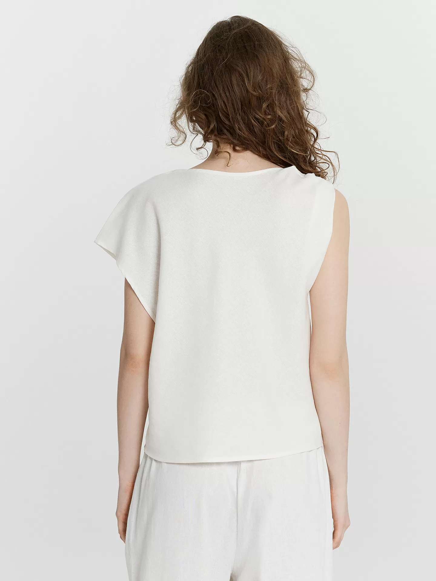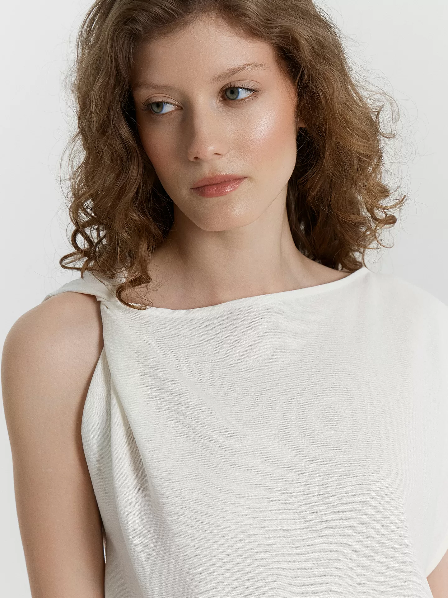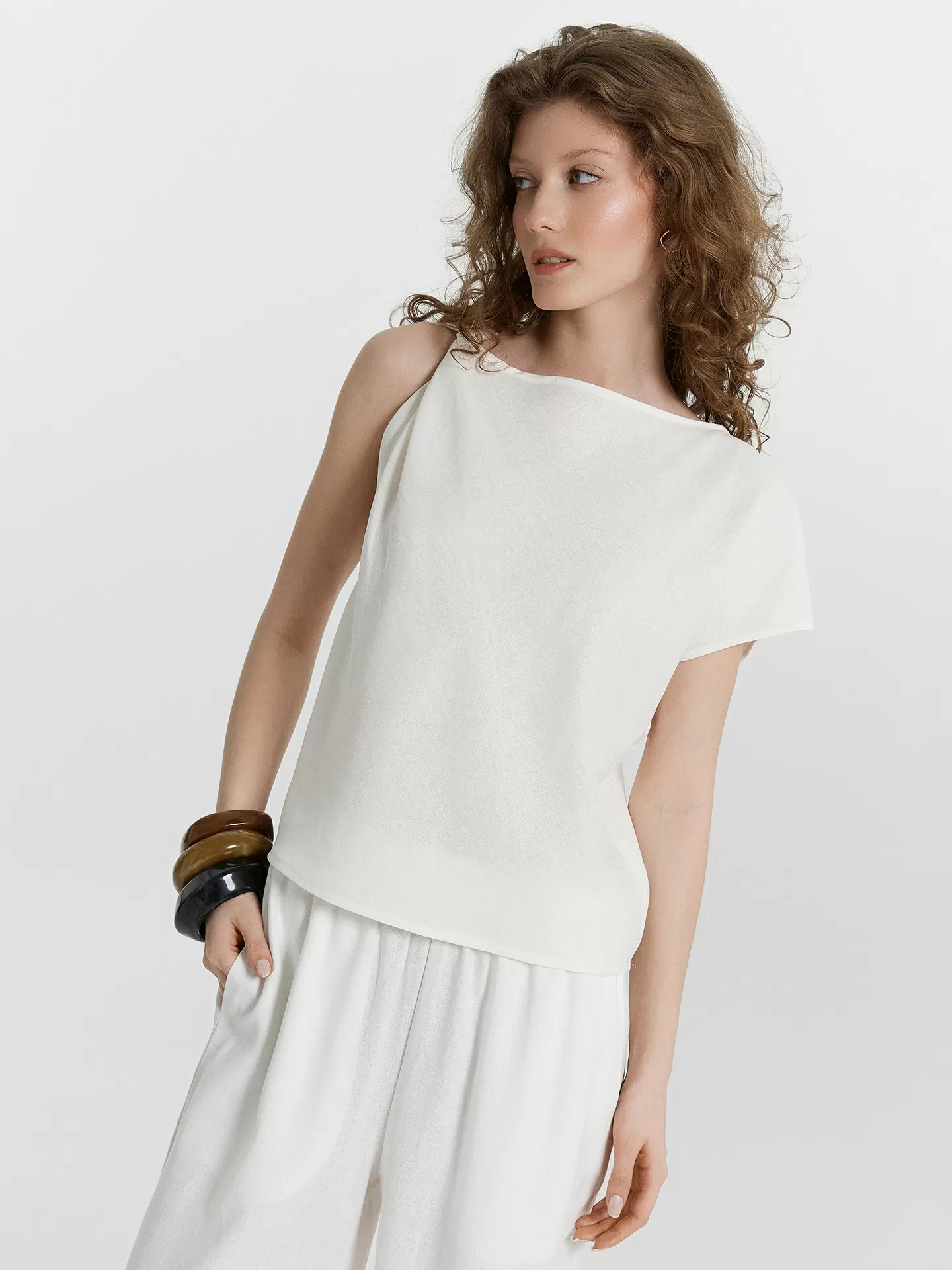 Эта женская блузка свободного силуэта — стильный и оригинальный элемент гардероба, идеально подходящий для создания современных и утонченных образов. Асимметричная форма горловины привносит в модель необычный акцент, делая ее запоминающейся и выразительной. Драпировка с перекрутом на правом плече добавляет изысканности, подчеркивая уникальный дизайн. Срезы горловины и проймы обработаны швом вподгибку, что обеспечивает аккуратный и долговечный внешний вид изделия. Слегка укороченный крой делает блузку особенно подходящей для сочетания с высокими юбками, брюками или джинсами, создавая стильные и гармоничные образы. Материал, состоящий из льна и района, сочетает в себе природную текстуру и мягкость. Лён обеспечивает воздухопроницаемость и комфорт, а район добавляет изделию гладкость и пластичность. Такой материал делает блузку практичной и приятной в носке, особенно в тёплое время года. Эта модель прекрасно подойдёт для повседневных и вечерних образов, подчеркивая индивидуальность и вкуссвоей обладательницы. _x000D_