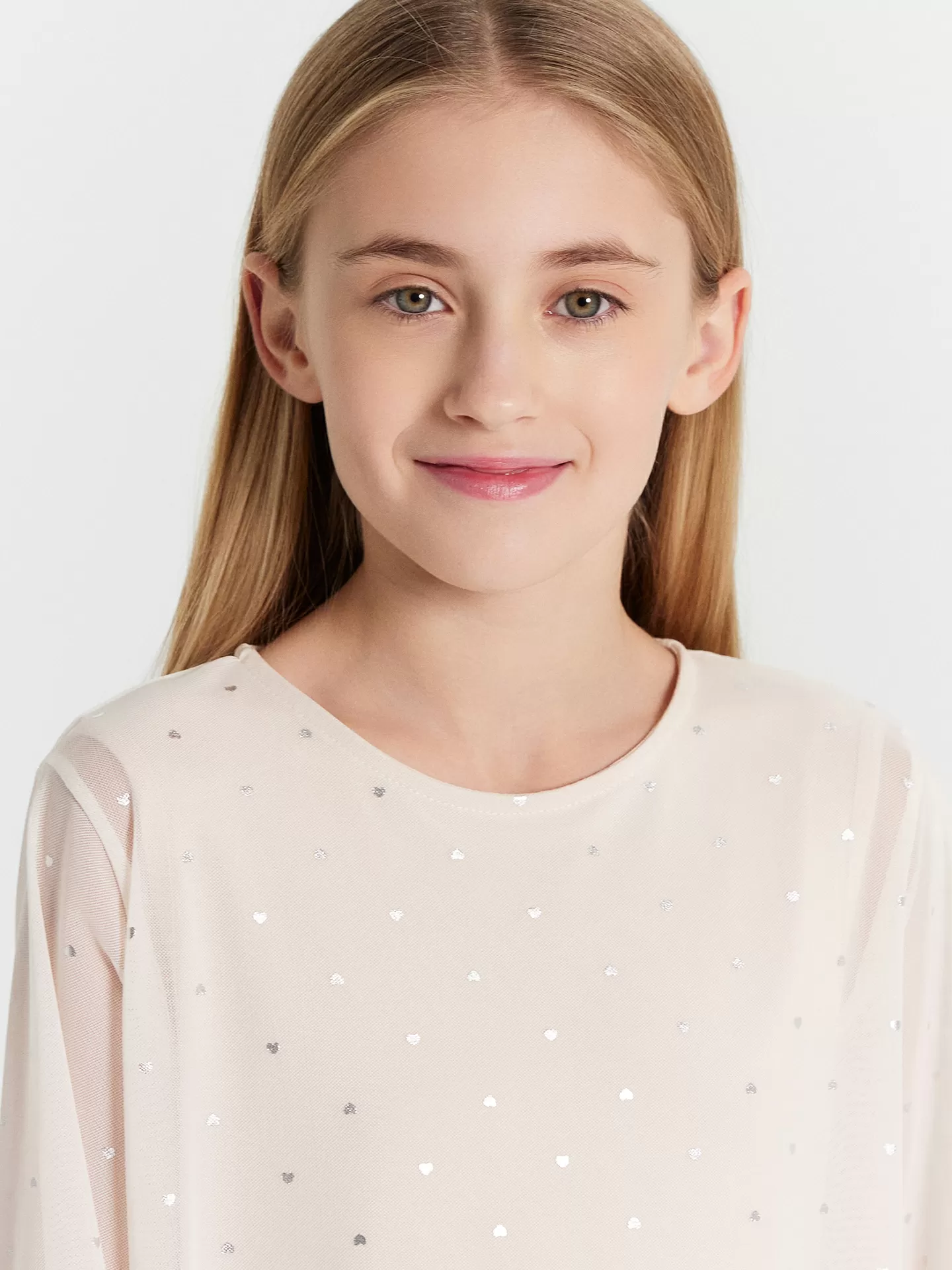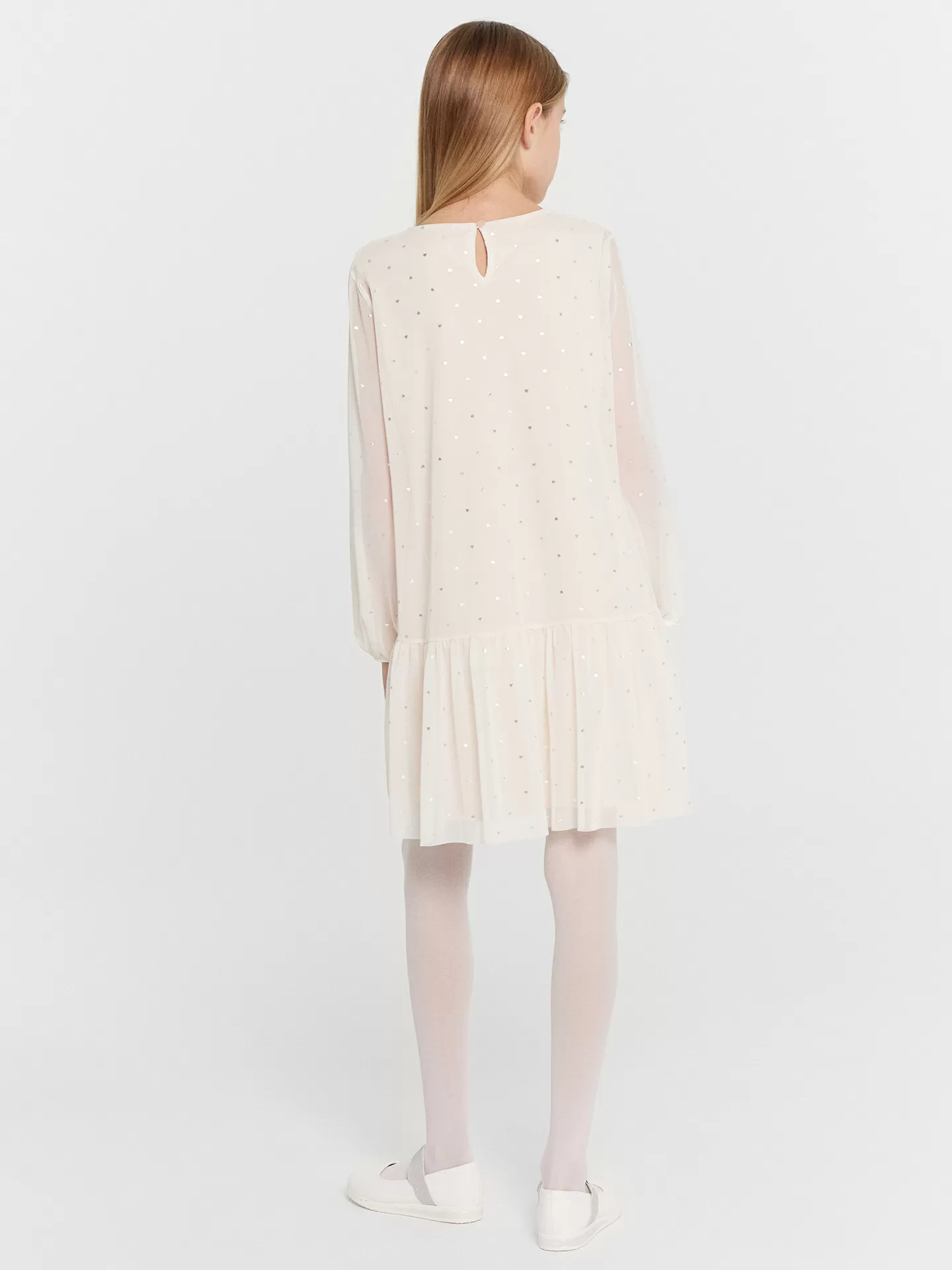 Нарядное платье А-образного силуэта для девочек. Изготовлено из полупрозрачной воздушной сетки с подкладкой из хлопковой кулирки. Вырез круглый, классический. На спинке застегивается на пуговицу. Рукава объемные, длинные. Отличный вариант для утренников и праздников!