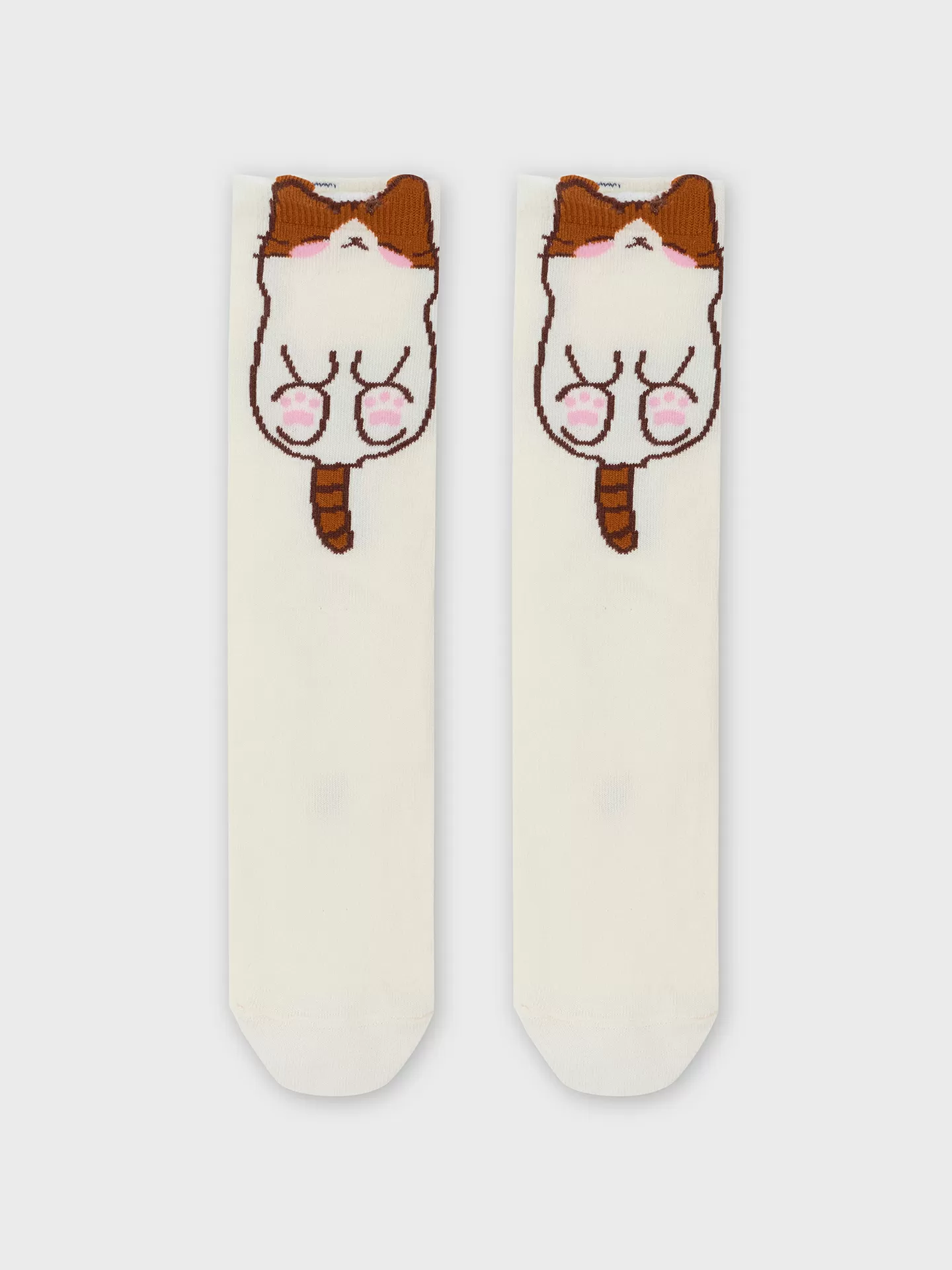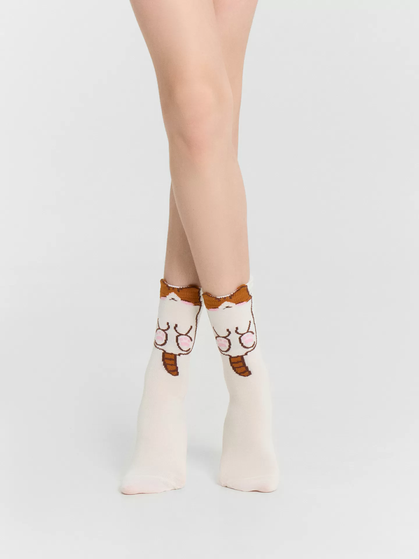 рис.3190 Детские классические носки с рисунком в виде котиков с пикотом-ушками на бортике.