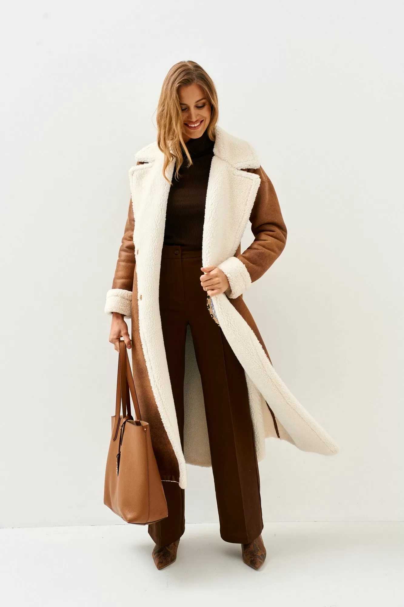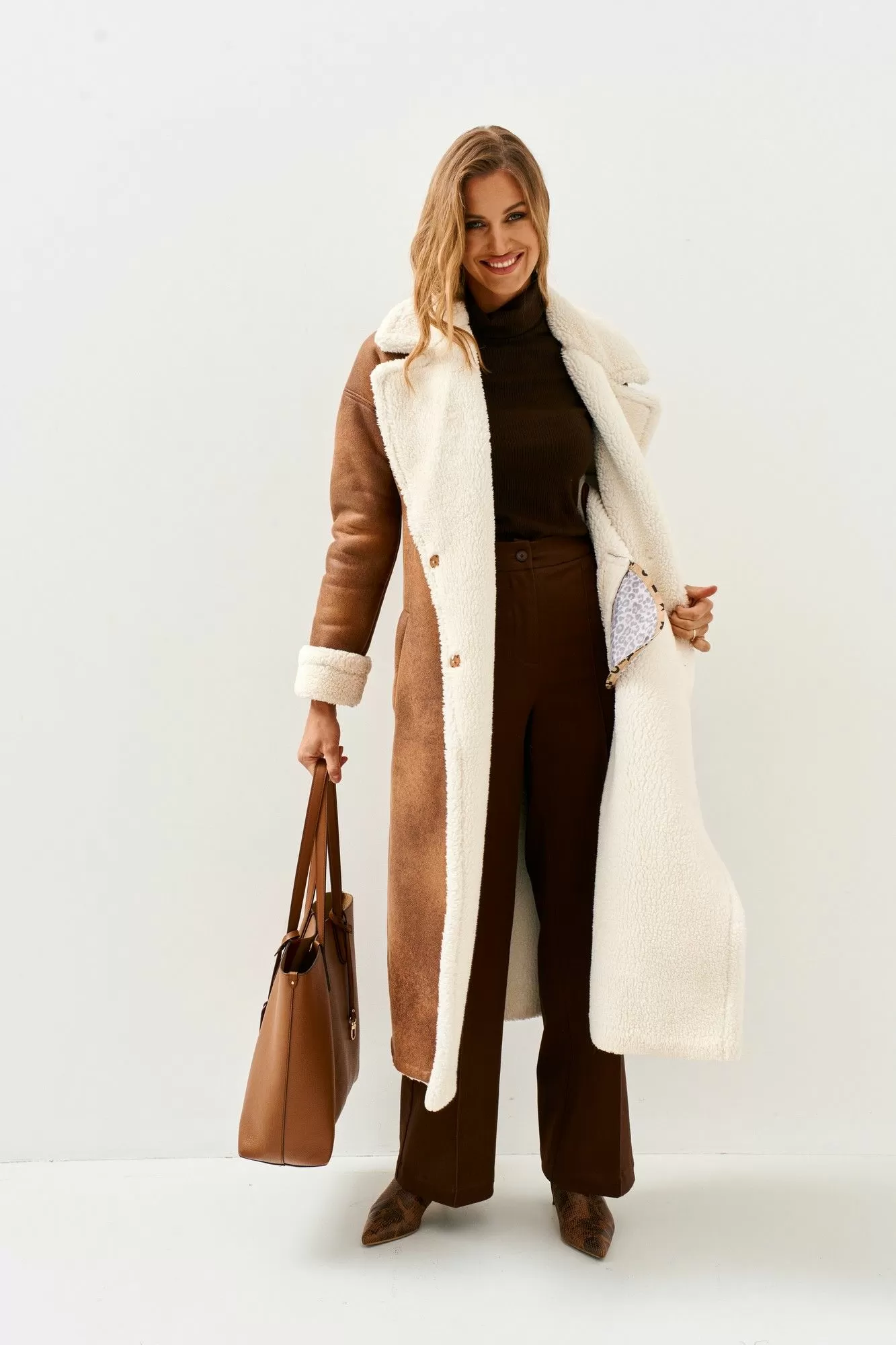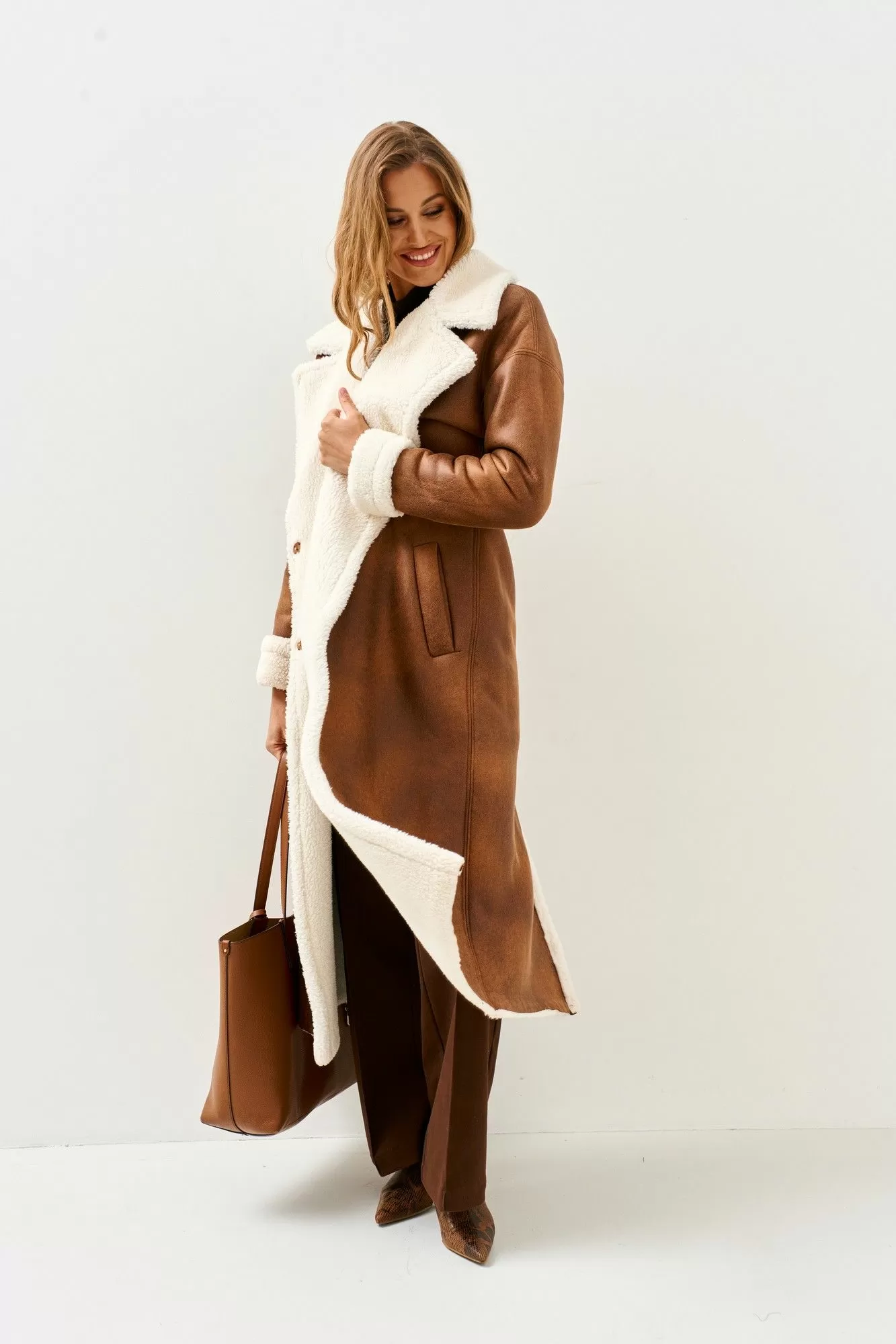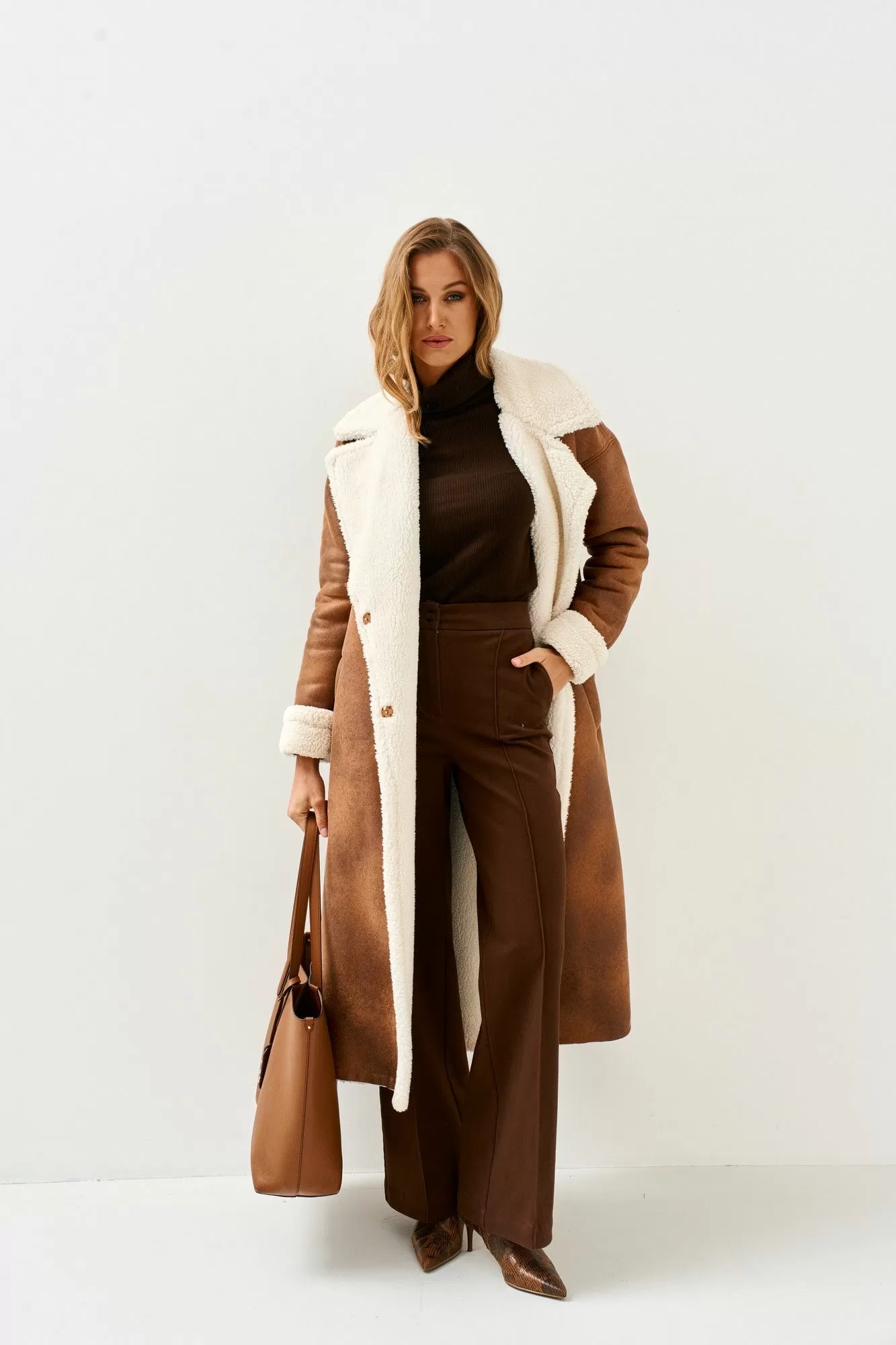 Пальто женское полуприлегающего силуэта, со смещенной бортовой застежкой на пришивные кнопки. Рукав втачной спущенный с цельнокроеной манжетой . На деталях переда обработаны боковые прорезные карманы с листочками. Спинка разрезная, в среднем шве обработана шлица.