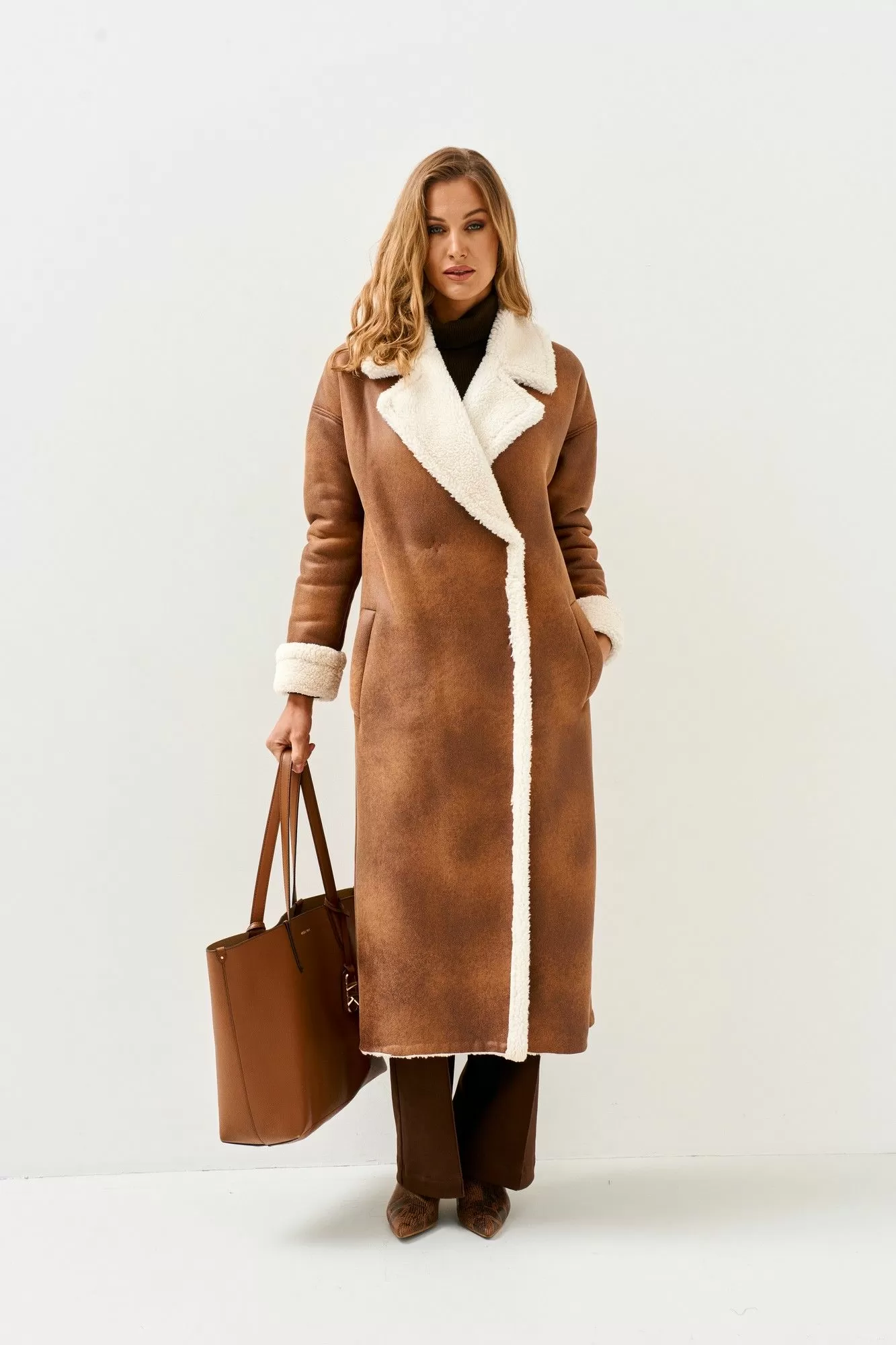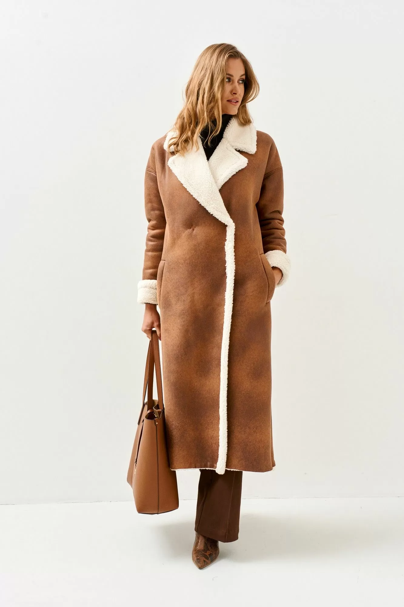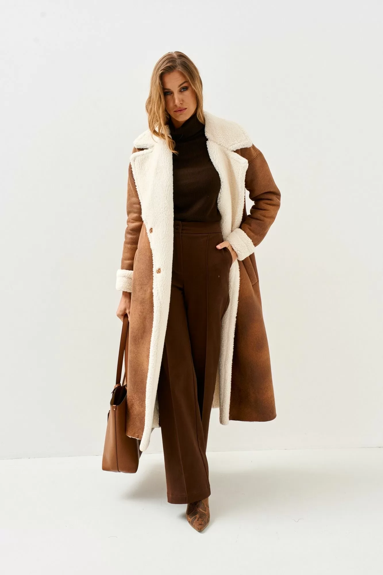 Пальто женское полуприлегающего силуэта, со смещенной бортовой застежкой на пришивные кнопки. Рукав втачной спущенный с цельнокроеной манжетой . На деталях переда обработаны боковые прорезные карманы с листочками. Спинка разрезная, в среднем шве обработана шлица.