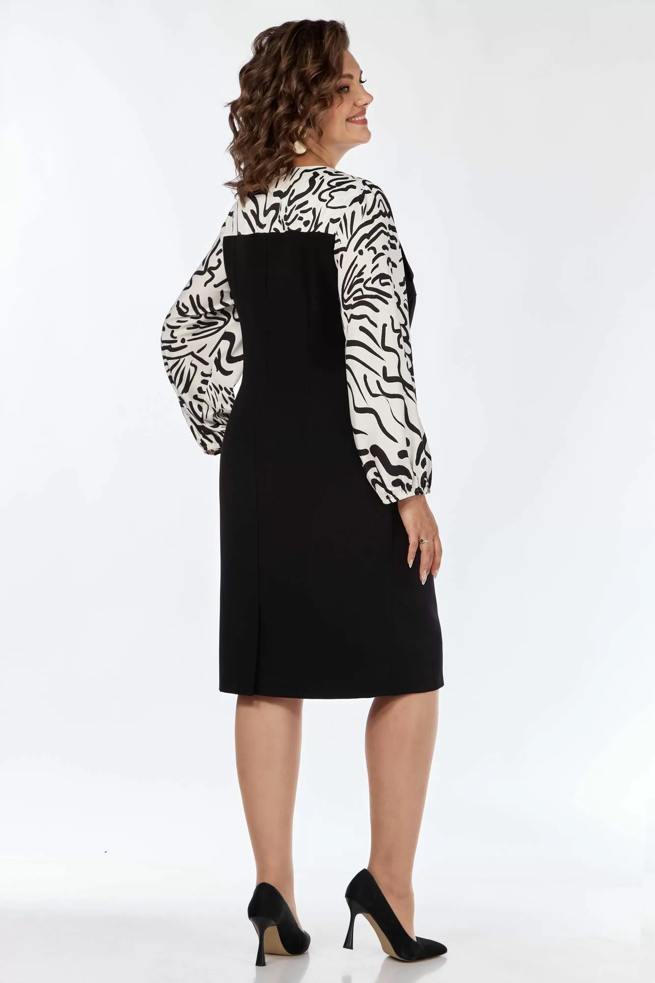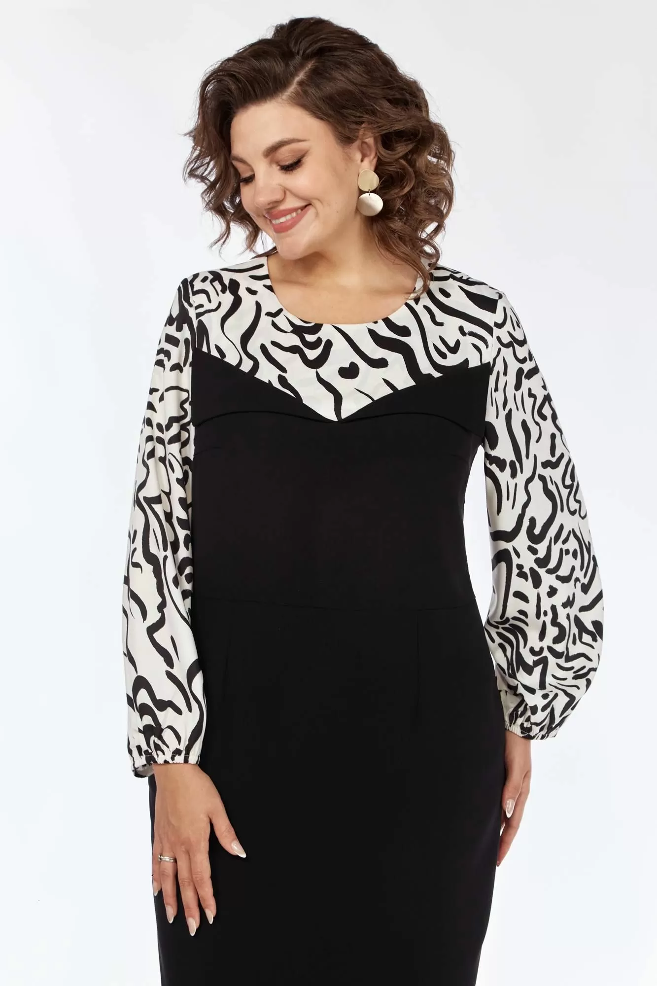 Платье женское, полуприлегающего силуэта, выполнено из 2х видов ткани: из блузочного атласа и основной плательной с легким стрейчем. Перед отрезной по линии талии с нагрудными и талиевыми вытачками. Карманы функциональные от подреза с отрезными бочками. Отлетные детали верхней части лифа от кокетки заутюжены в низ. Спинка со шлицей в среднем шве и талиевыми вытачками. Рукав втачной одношовный с резинкой и сборкой по низу. В левом боковом шве тесьма-молния, потайная.