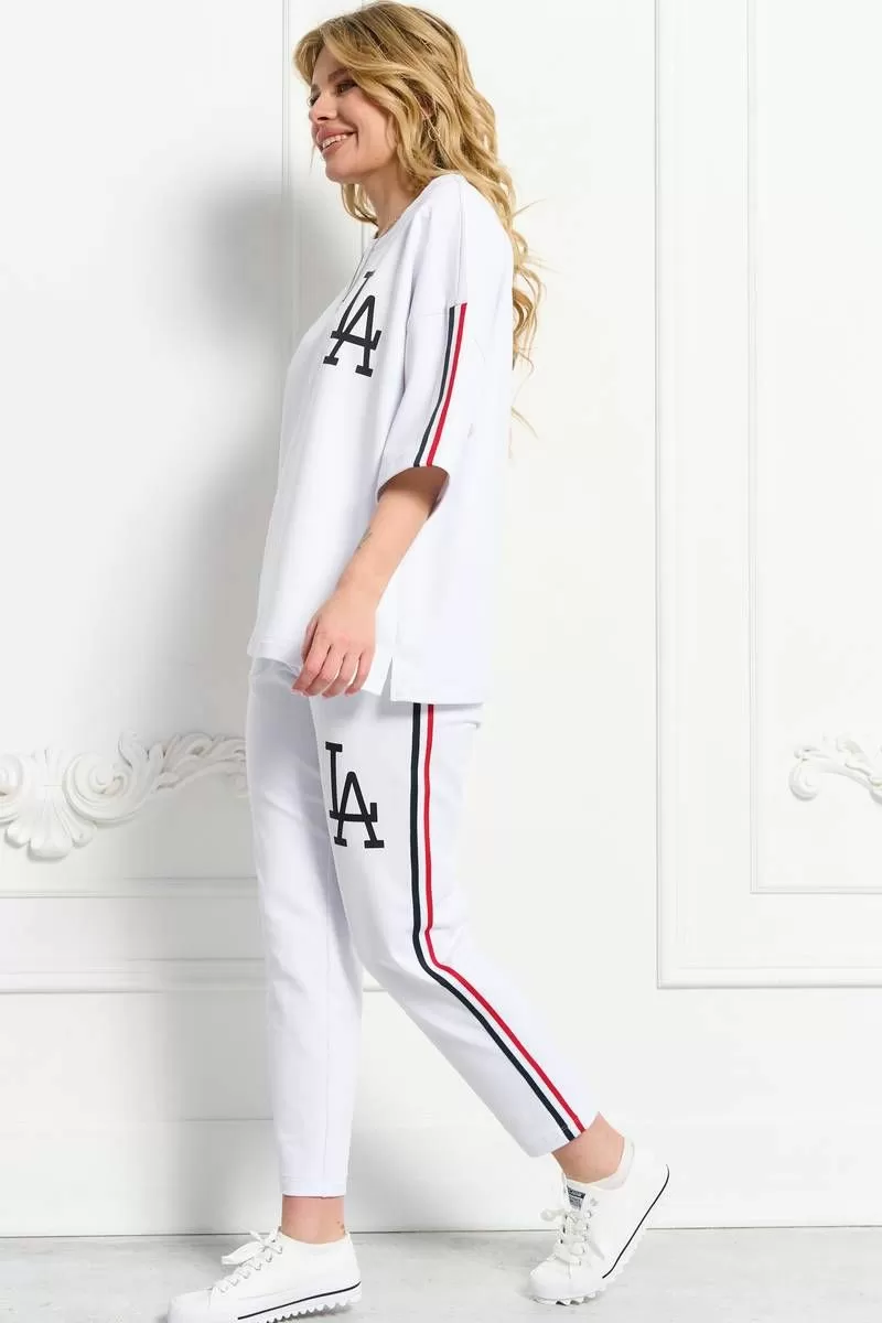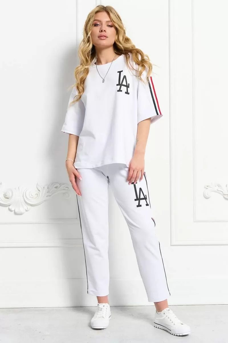 Джемпер прямого силуэта со спущенным плечом и втачным рукавом. Горловина на планке. Низ на широкой подгибке с разрезами по боковым швам. Спереди на полочке и на брюках декоративная печать.