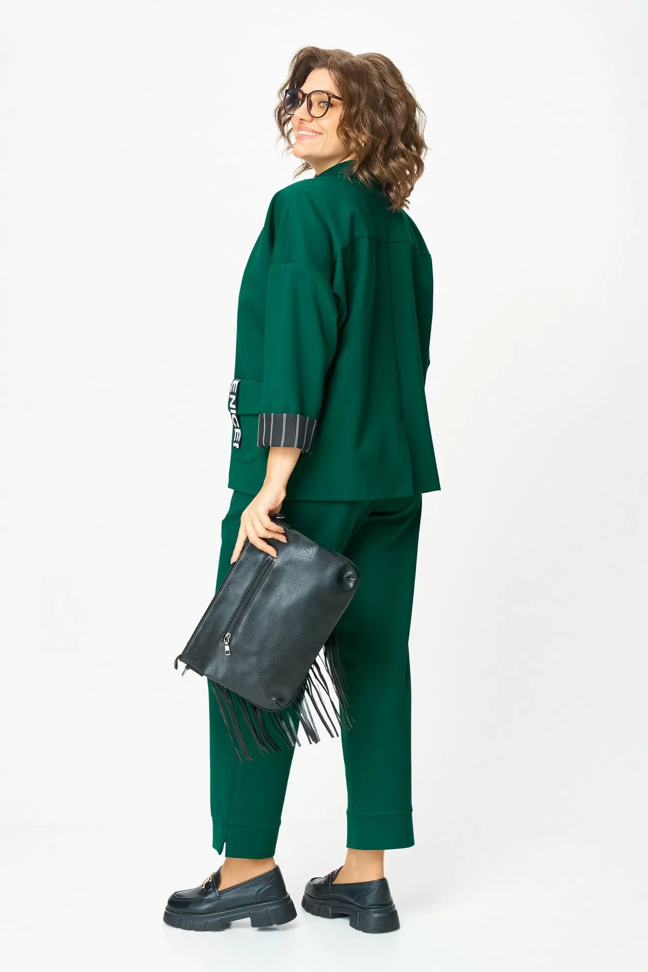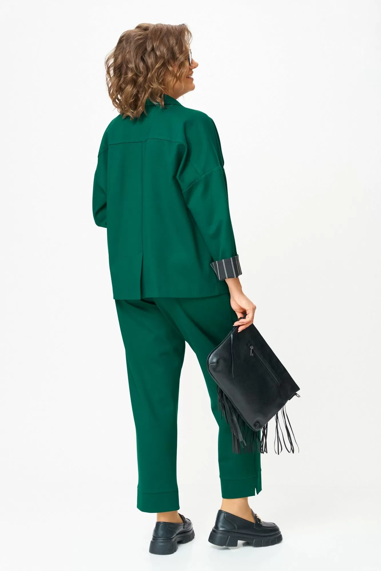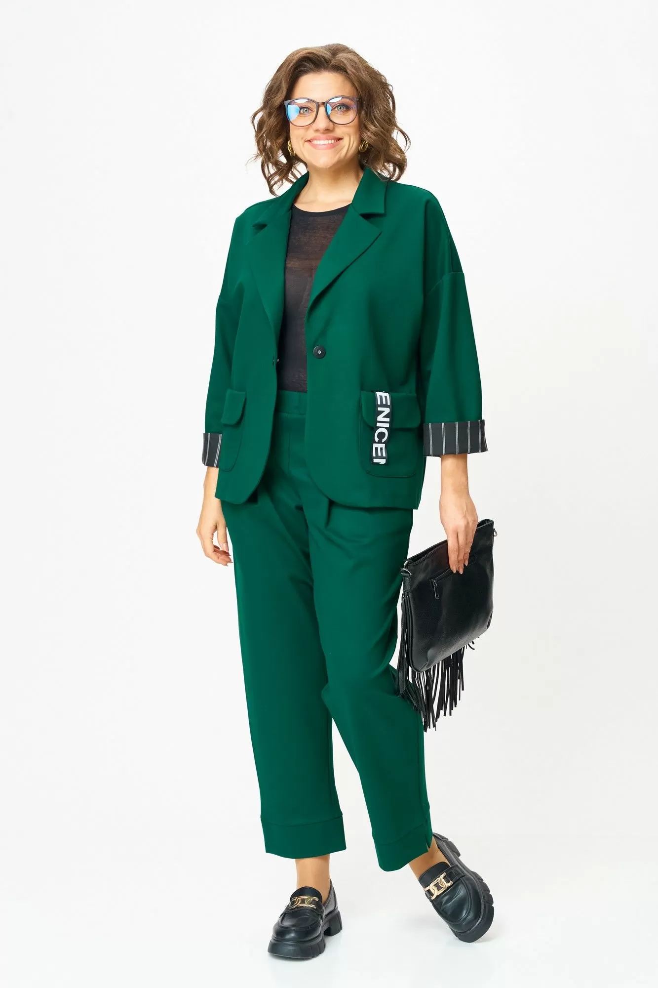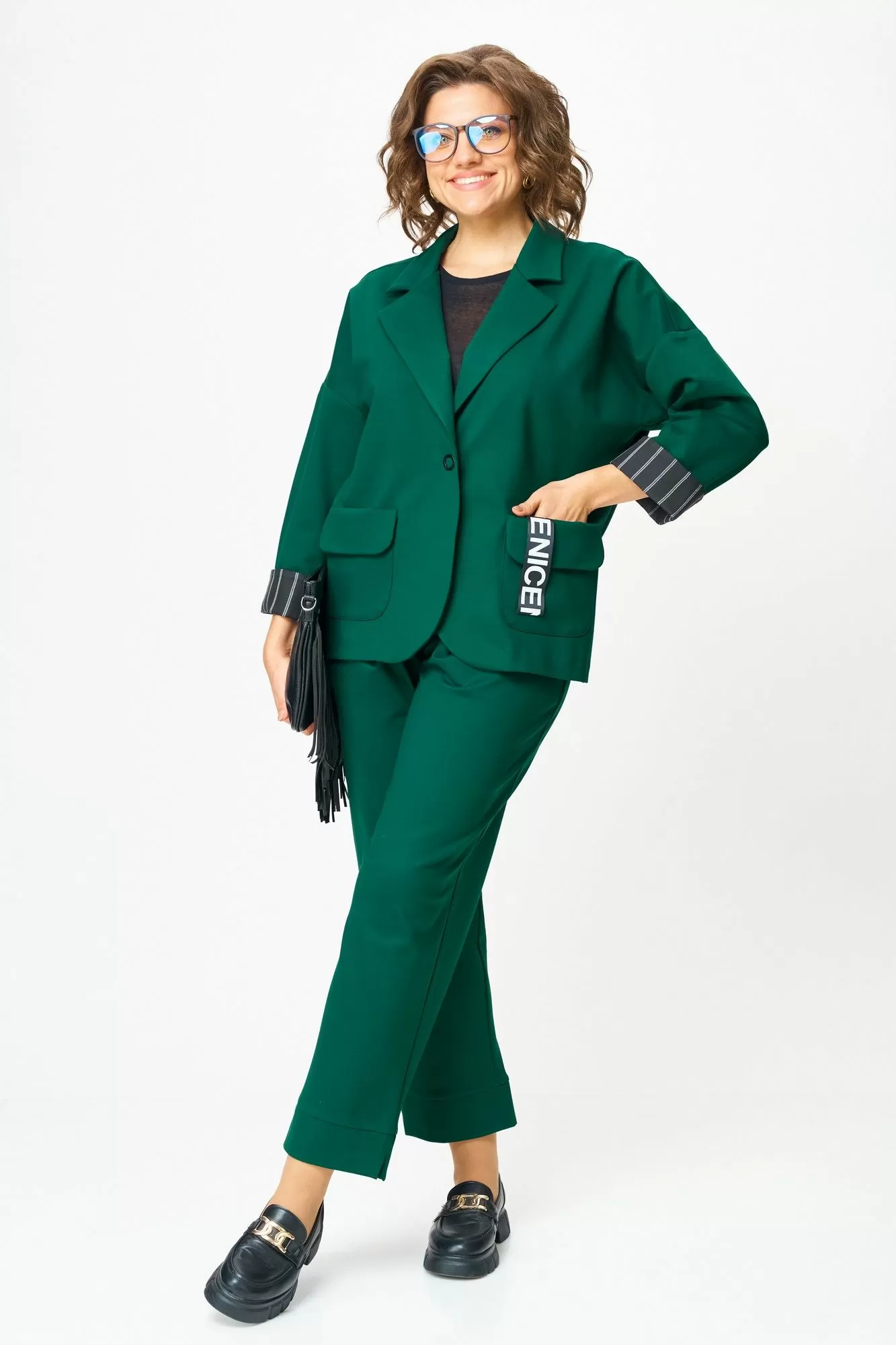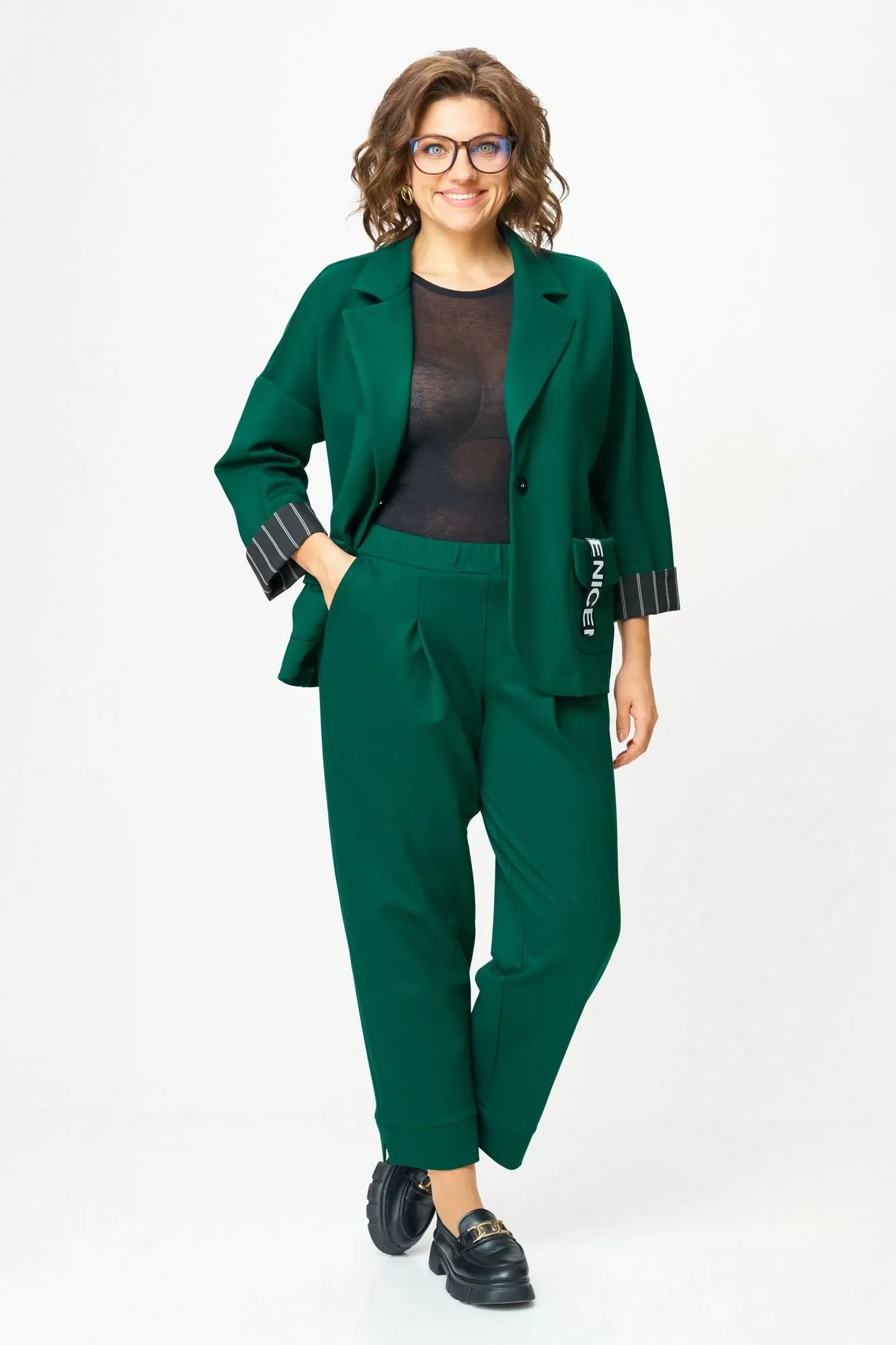 Костюм, который подчеркивает вашу уверенность и женственность. Плотный трикотаж с добавлением нейлона делает его пластичным и износостойким — он держит форму и смотрится дорого в любой ситуации. Богатый изумрудный оттенок словно создан, чтобы добавить тепла и выразительности в повседневность, а изящная отделка текстилем и контрастные детали на лацкане и манжетах превращают образ в по-настоящему уникальный.