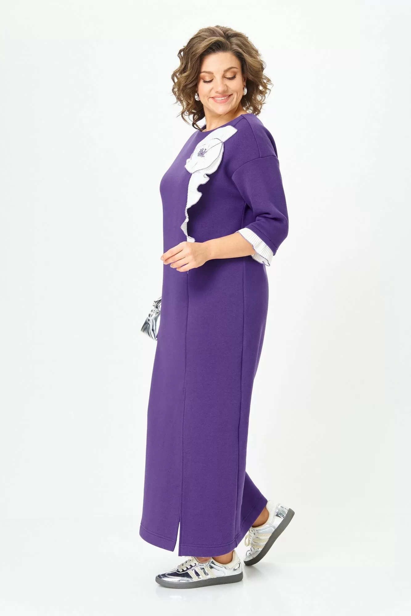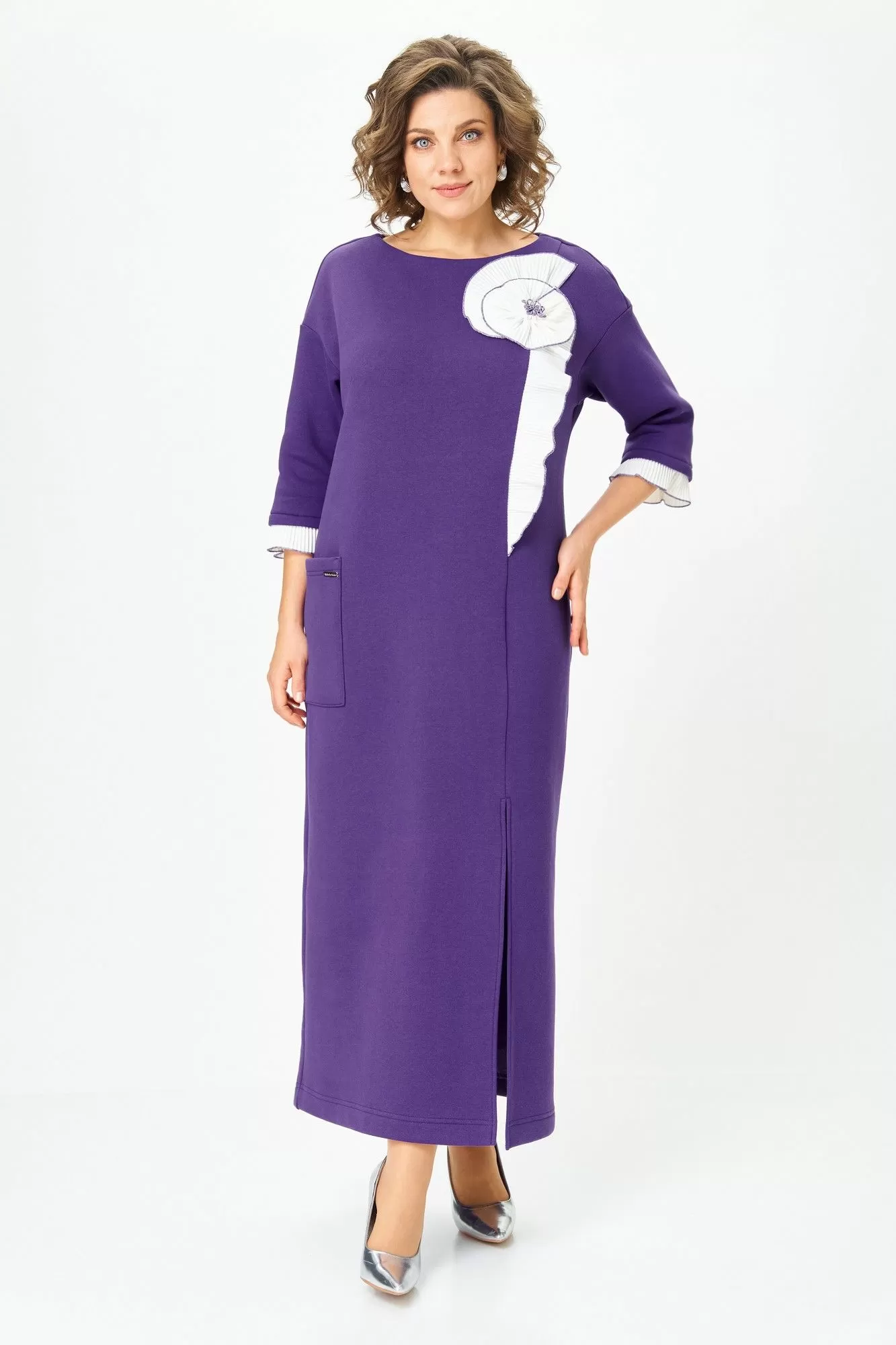 Спинка цельная, а передняя часть украшена нагрудными вытачками и левым рельефом с разрезом внизу. В рельеф вставлен декоративный волан-цветок из отделочной плиссеровки, который служит ярким акцентом и добавляет модели оригинальности. Длина платья — 7/8, что делает его универсальным для различных сезонов и ситуаций. По правой стороне расположен накладной карман — практичный элемент, дополняющий дизайн и удобство.