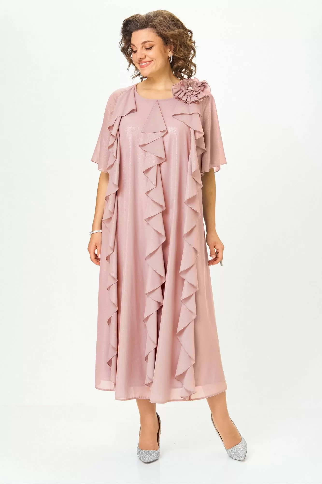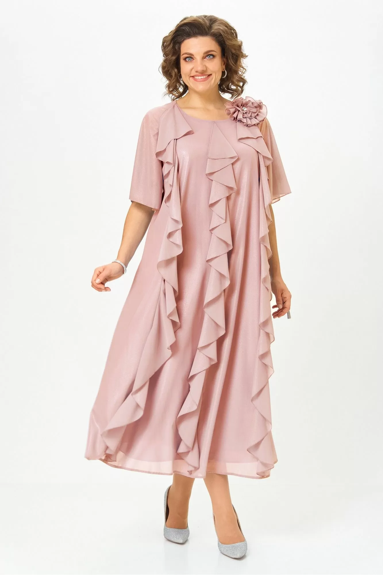 Эффектное платье для обладательниц роскошных форм, свободного покроя, выполнено из шифона, на трикотажной подкладке. Горловина платья округлой формы, на обтачке, на переднем полотнище выполнены вертикальные подрезы с воланами. Спинка со средним швом, рукав покроя реглан, расклешенного покроя, по горловине декор в виде съемного цветка. Легкое, нарядное платье отличный вариант для любительниц комфортных и изящных нарядов!