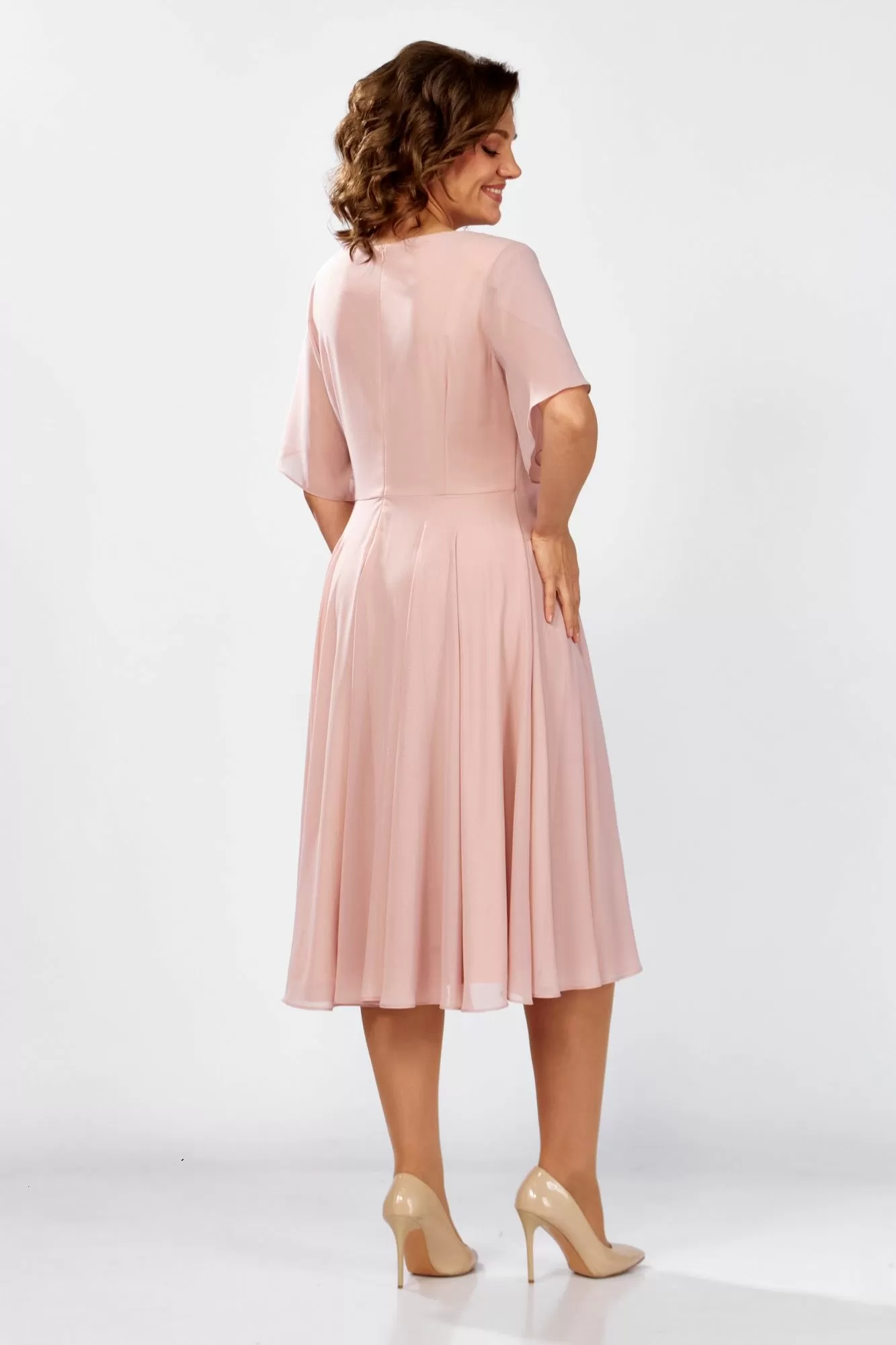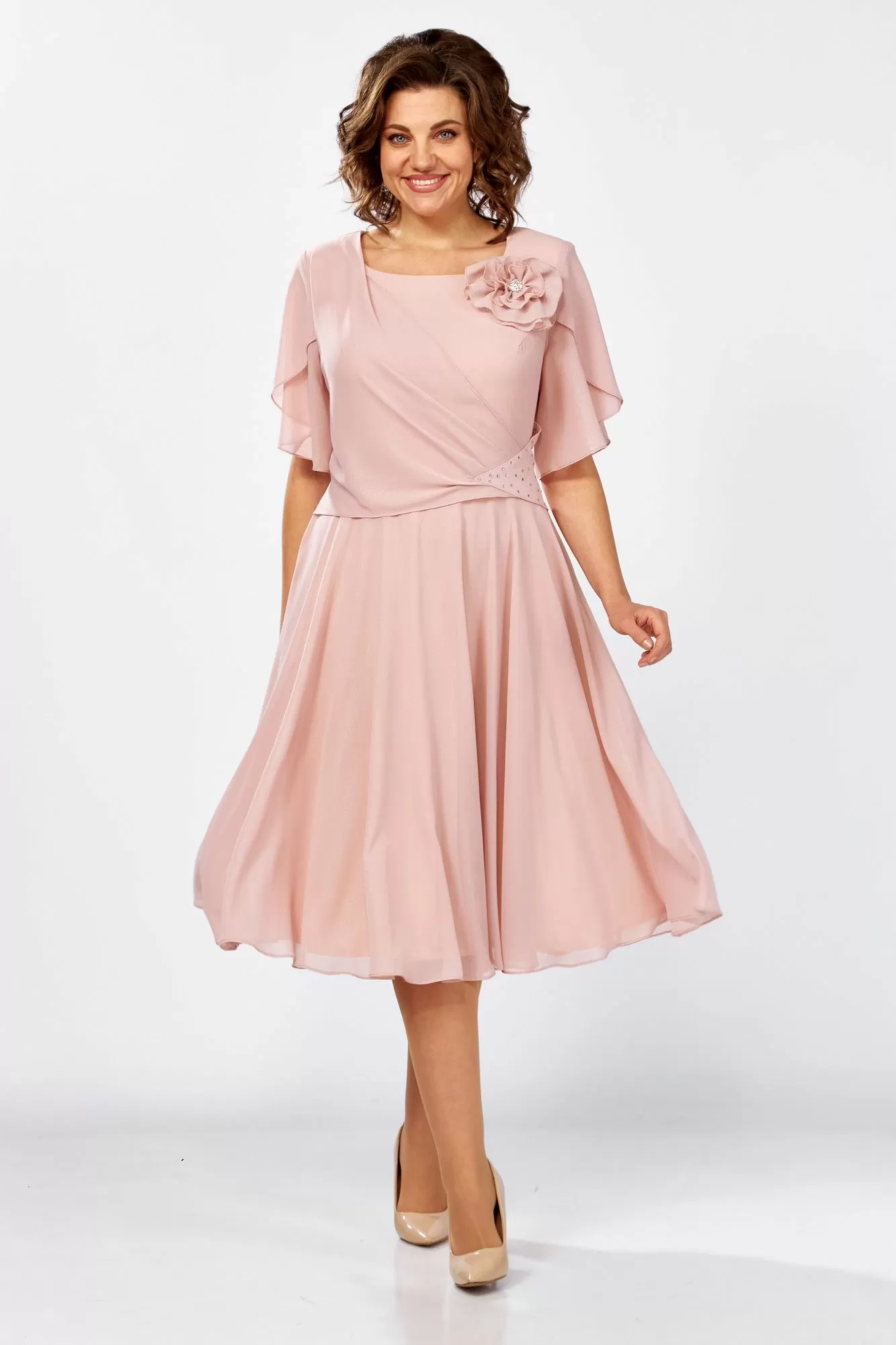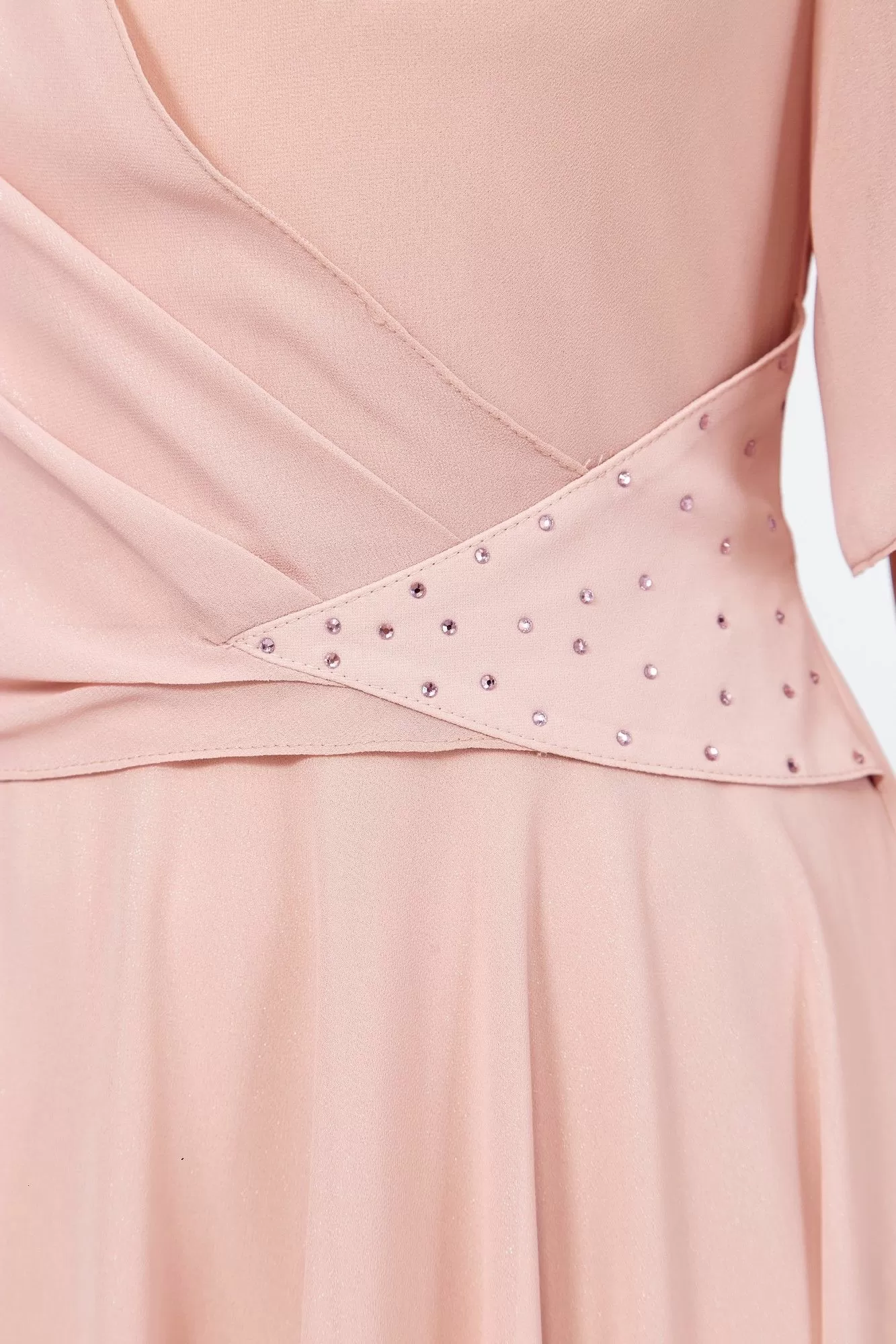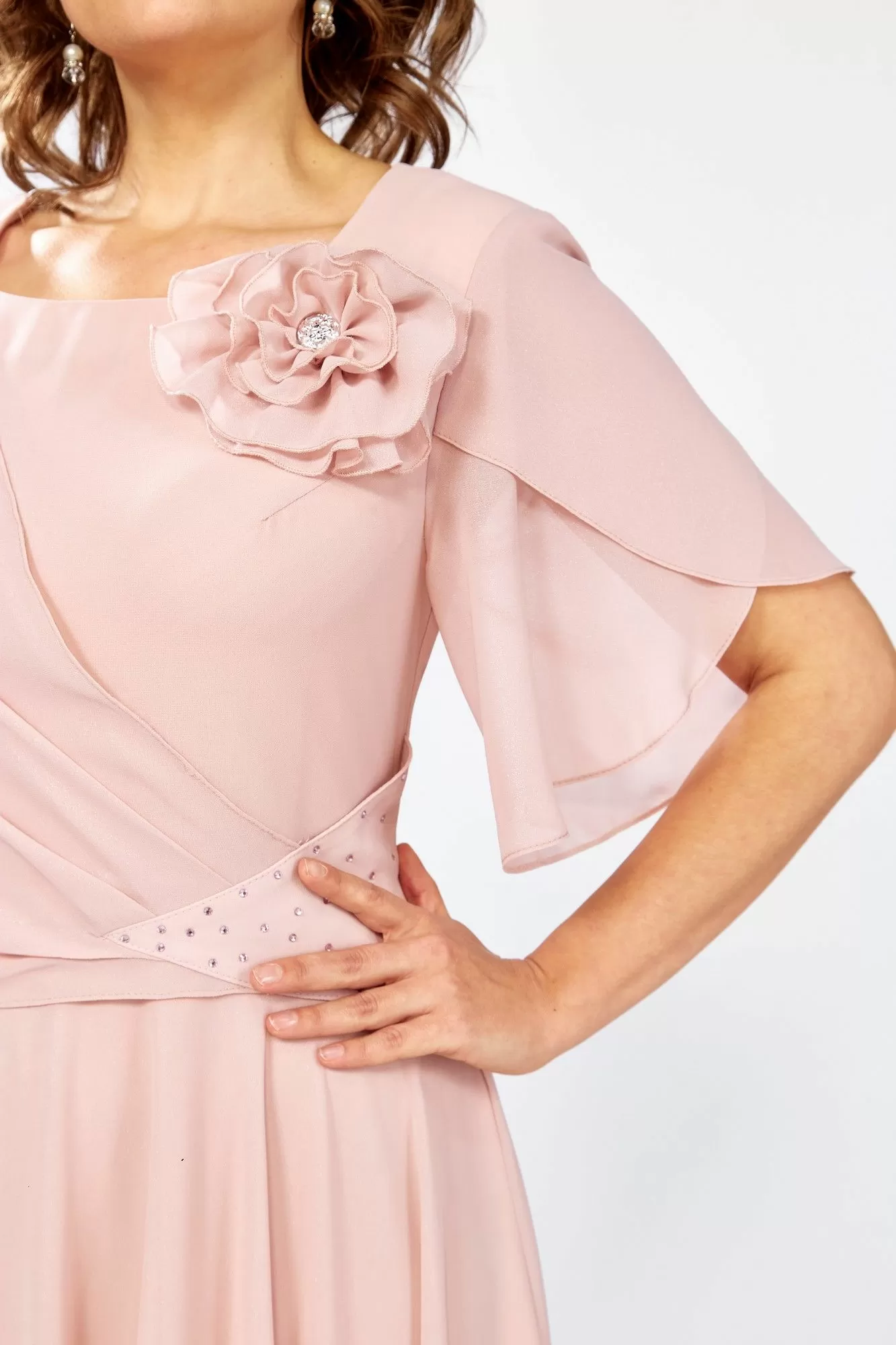Женское платье полуприлегающего силуэта, выполнено из шифона, на трикотажной подкладке. Лиф платья отрезной по линии талии, горловина округлой формы, на обтачке, также на лифе обработана ассиметричная, отлетная деталь со складками с одной стороны, которая уходит в боковой шов и декорирована стразами. Юбка расклешенная, выполнена из шифона, спинка со средним швом и рельефами, в среднем шве потайная молния. Рукав втачной, из шифона, расклешенный, укороченный. Нарядное платье из шифона, декорированное съемным цветком, отлично подойдет для торжественных мероприятий!