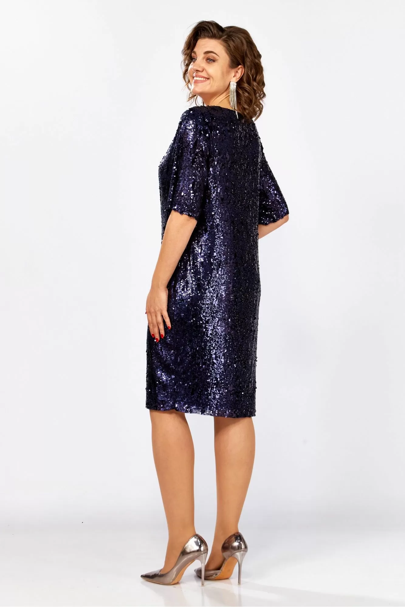 Нарядное платье из пайеток, свободного покроя. Горловина платья округлой формы на обтачке, полочка и спинка свободного покроя. Рукав втачной, укороченный, выполнен из пайеток. Простое в исполнении, но выполненное из эффектной ткани прекрасно дополнит ваш образ!