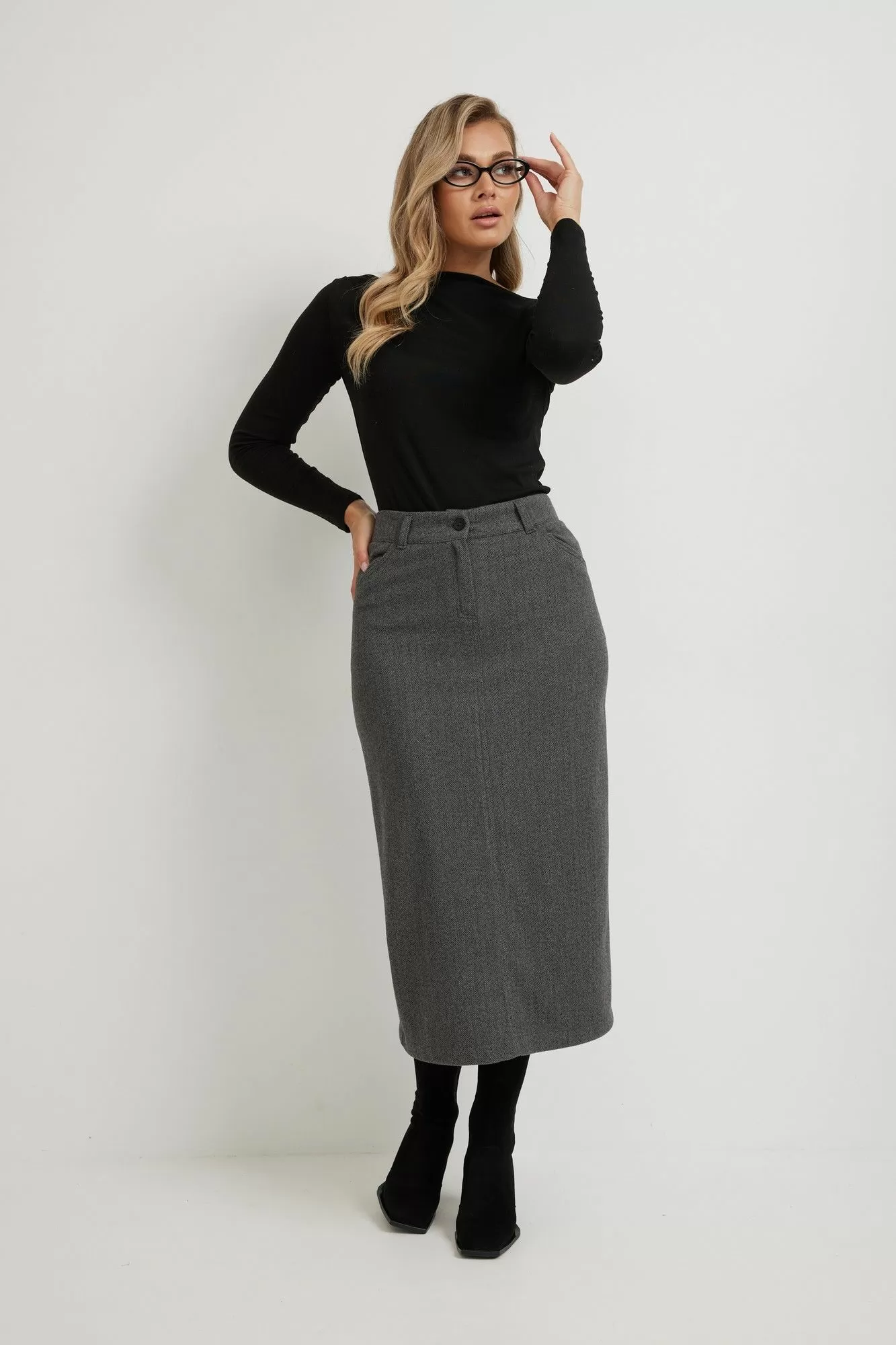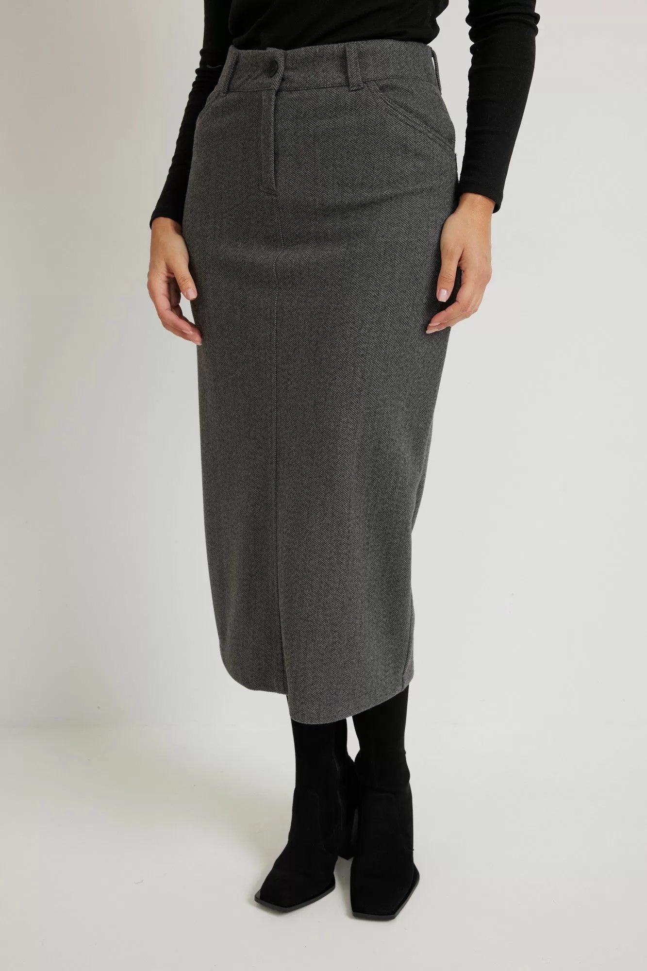 Тёплая юбка с рисунком " ёлочка" полуприлегающего силуэта длиной миди зимнего ассортимента от белорусского производителя. Ткань мягкая и очень приятная к телу. Юбка с притачным поясом, с застёжкой на тесьму-молнию и пуговицу на поясе. На передней половинке внутренние карманы, на задней половинке расположены кокетка и накладные карманы . Для выбора нужного размера воспользуйтесь размерной сеткой