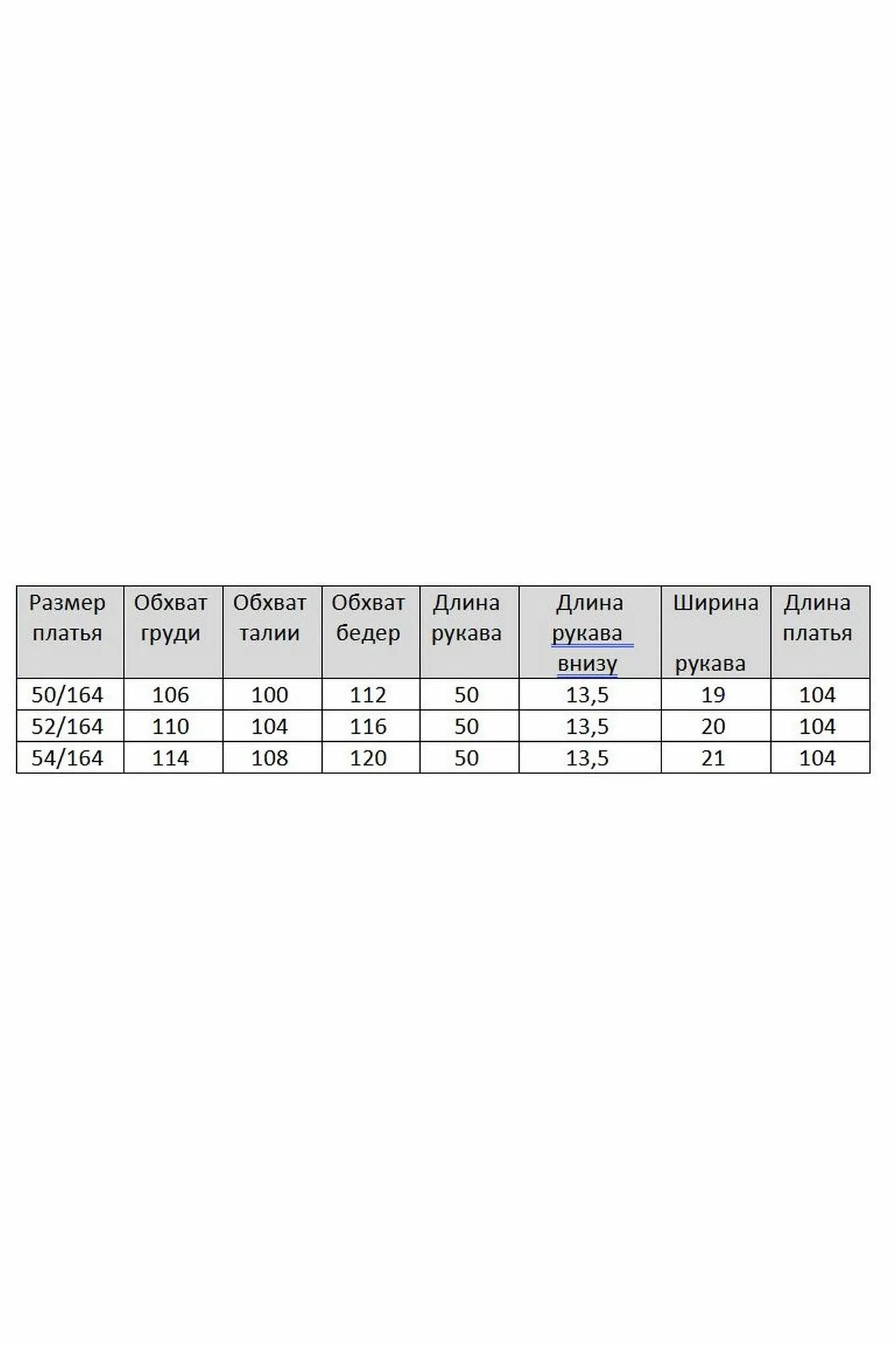 Нарядное платье А- силуэта, без подкладки. Округлый вырез горловины обработан бейкой. Перед с фигурным подрезом и разрезом по низу. По правой стороне переда легкая драпировка с декоративной пряжкой и двумя вырезами. Рукав втачной, двухшовный с вертикальным разрезом в локтевом шве. Спинка со средним швом и застежкой сзади на потайную тесьму-молнию. Длина рукава от горловины- 50 см, длина по синке-104 см.