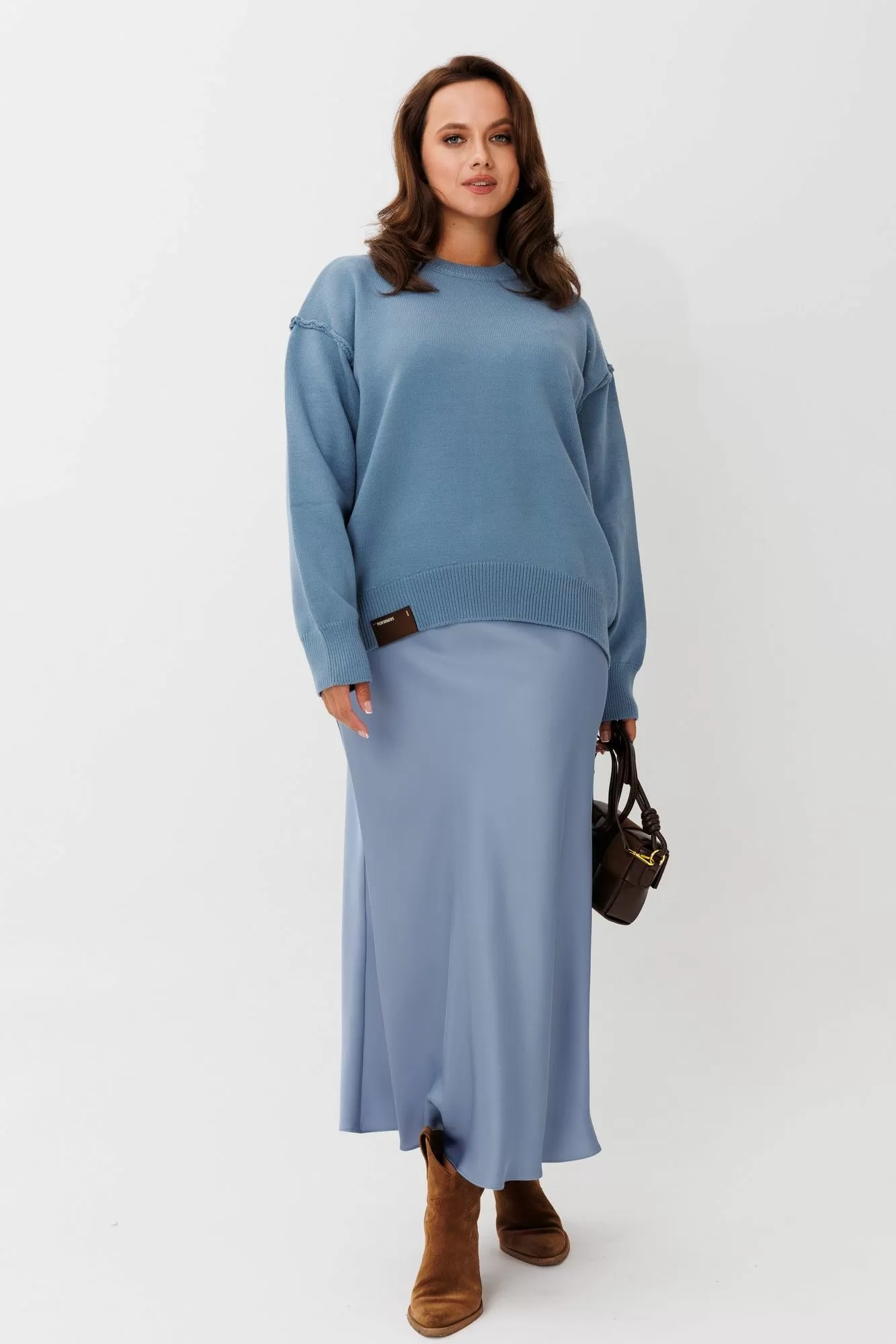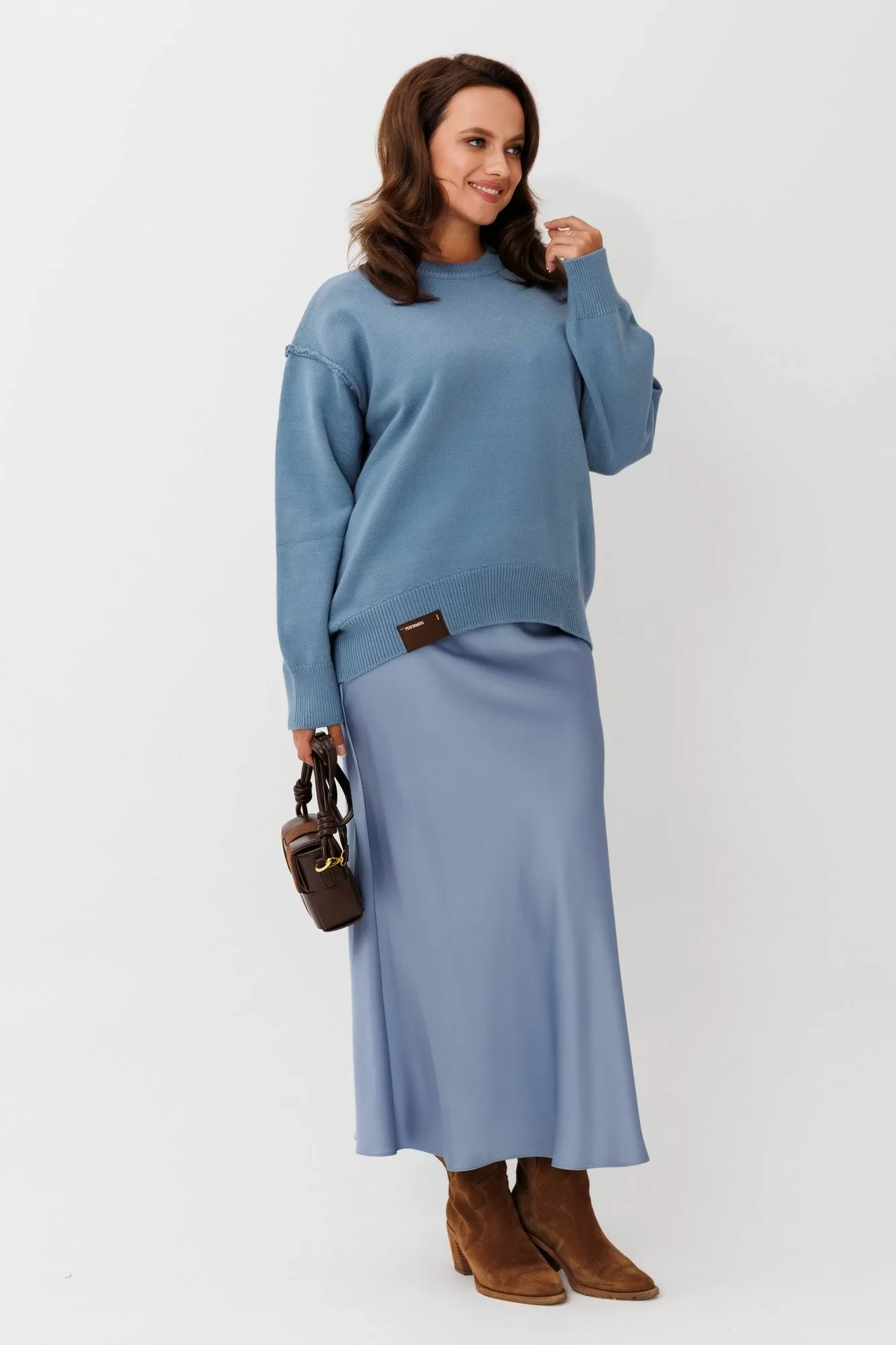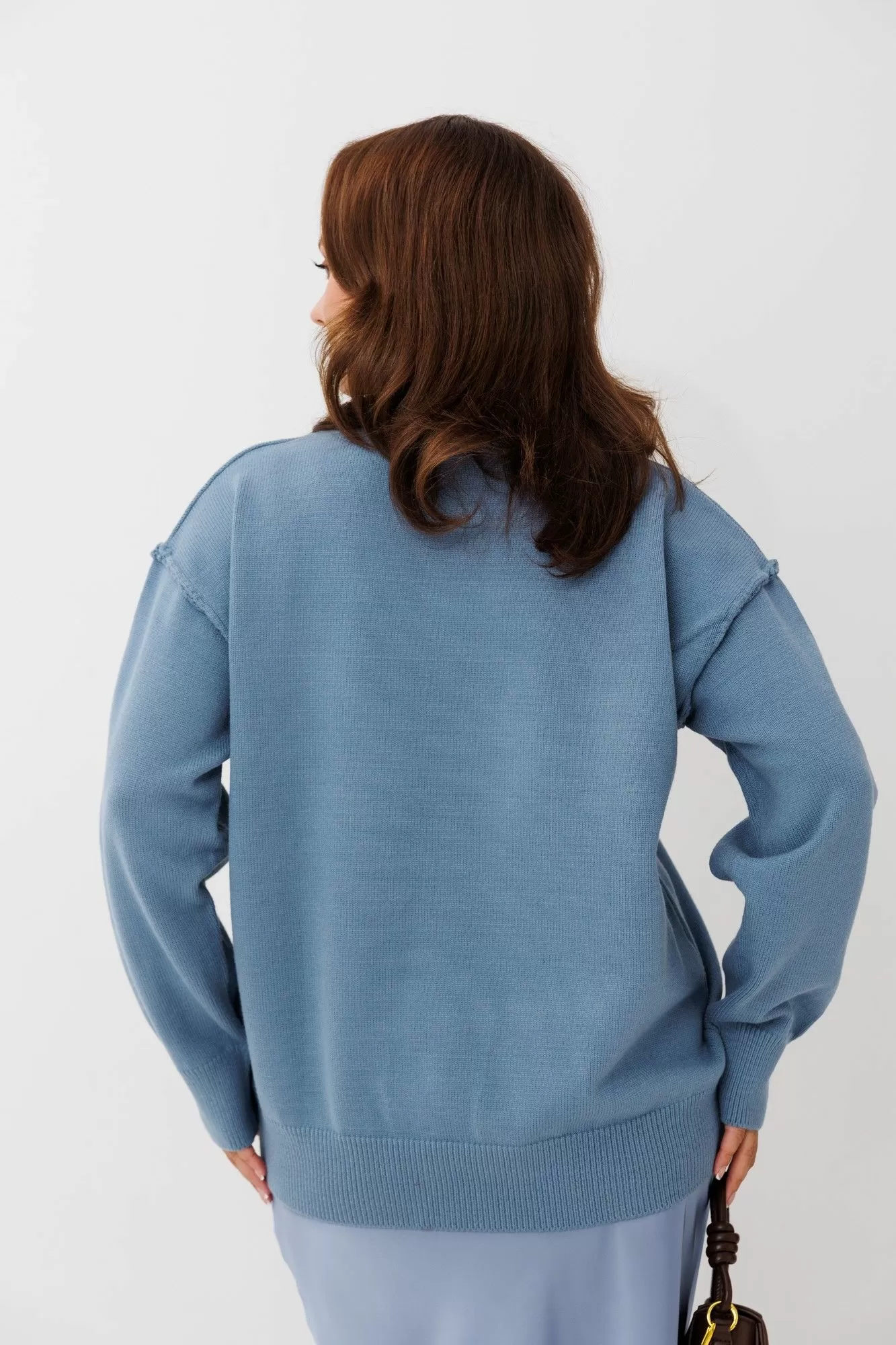 Джемпер свободного силуэта. Горловина круглая, рукава спущенные, плечевые швы специально вывернуты на лицо изделия. Ткань мягкая, плотная, хорошшо держит форму.рукава и низ изделия на свободной вязанной резинке. По низу изделия декоративная нашивка.