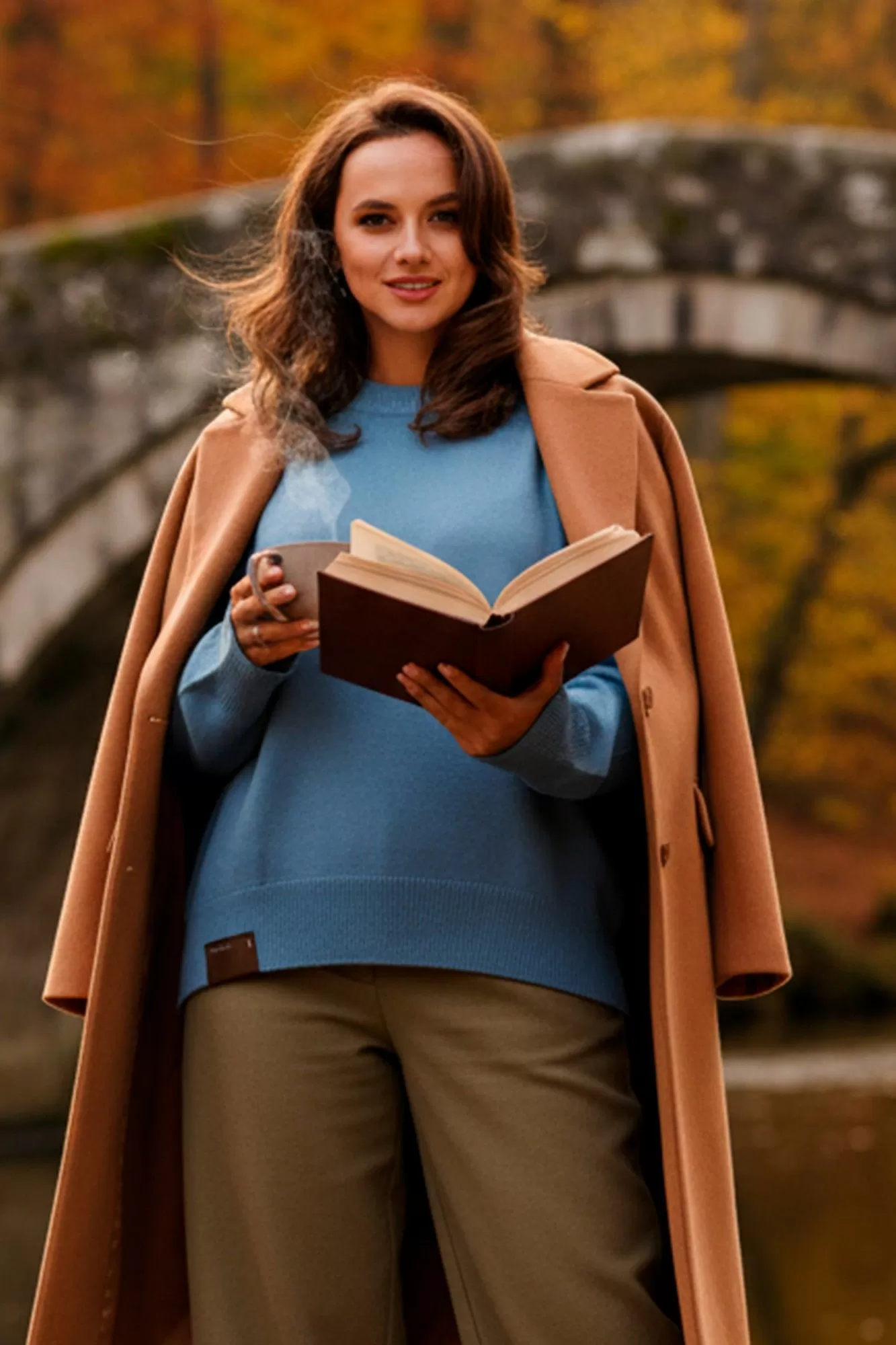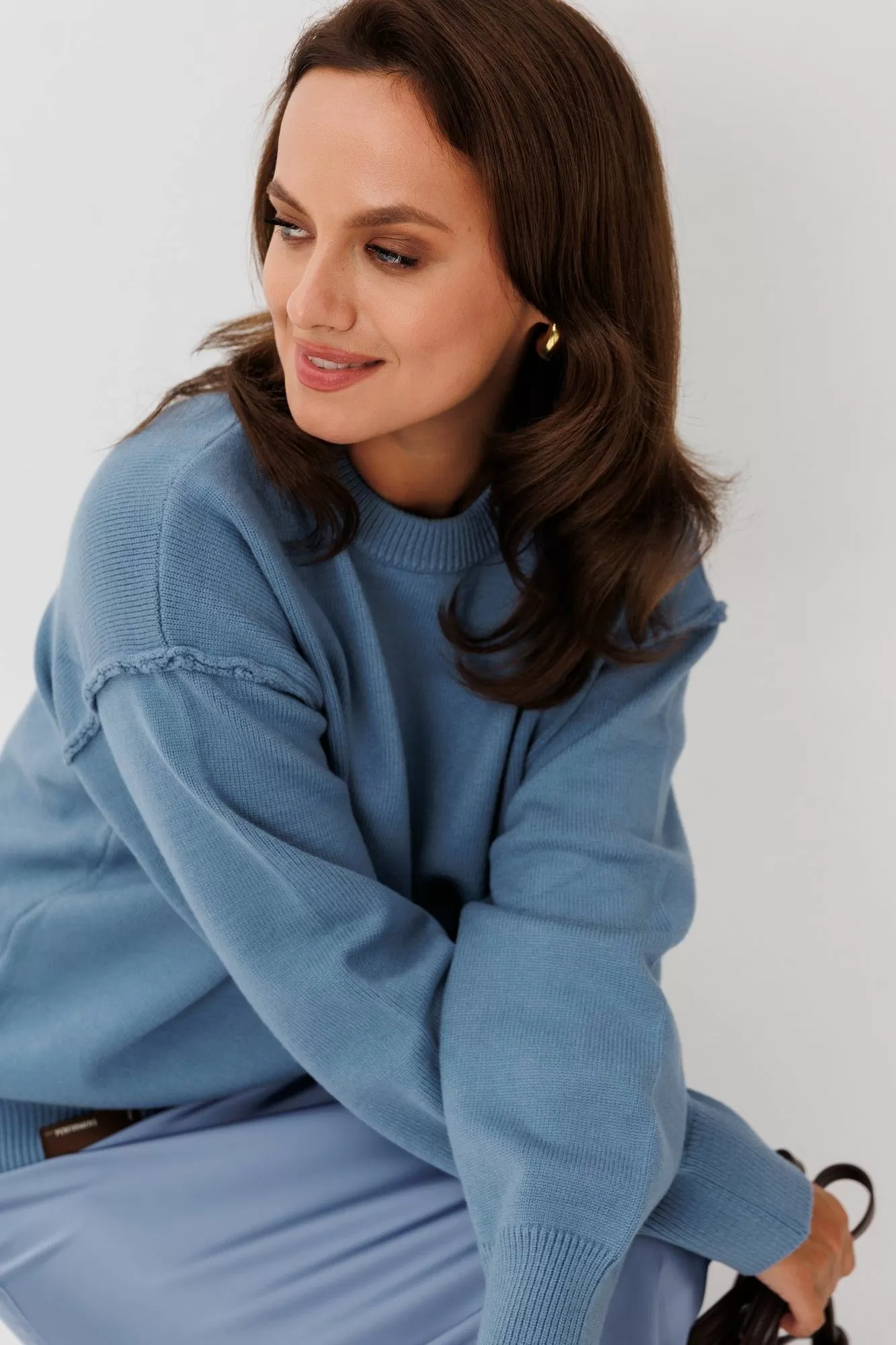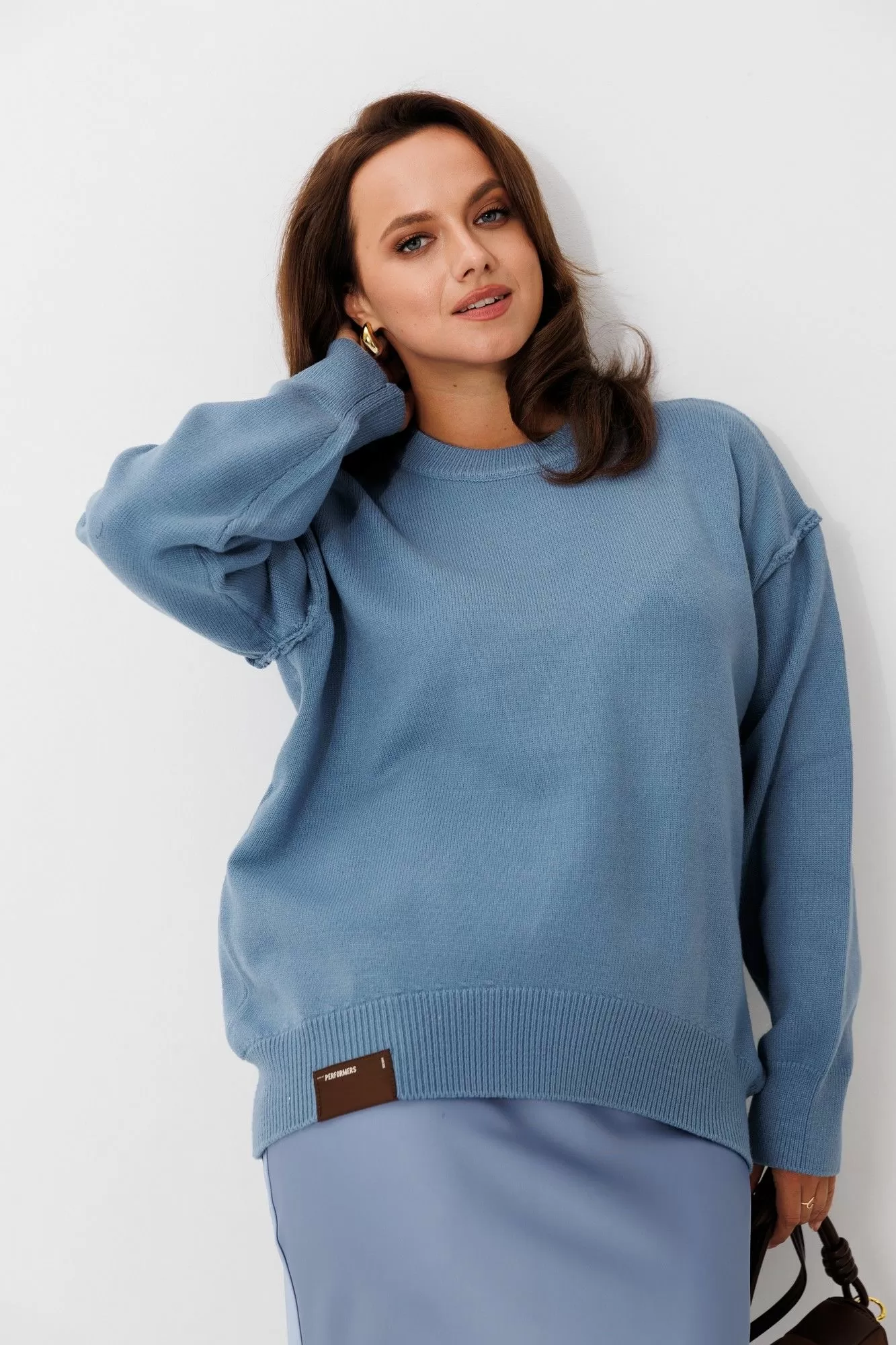 Джемпер свободного силуэта. Горловина круглая, рукава спущенные, плечевые швы специально вывернуты на лицо изделия. Ткань мягкая, плотная, хорошшо держит форму.рукава и низ изделия на свободной вязанной резинке. По низу изделия декоративная нашивка.