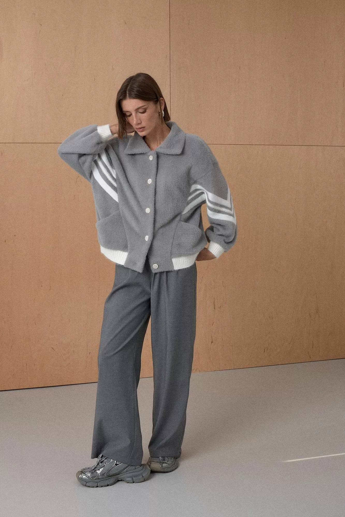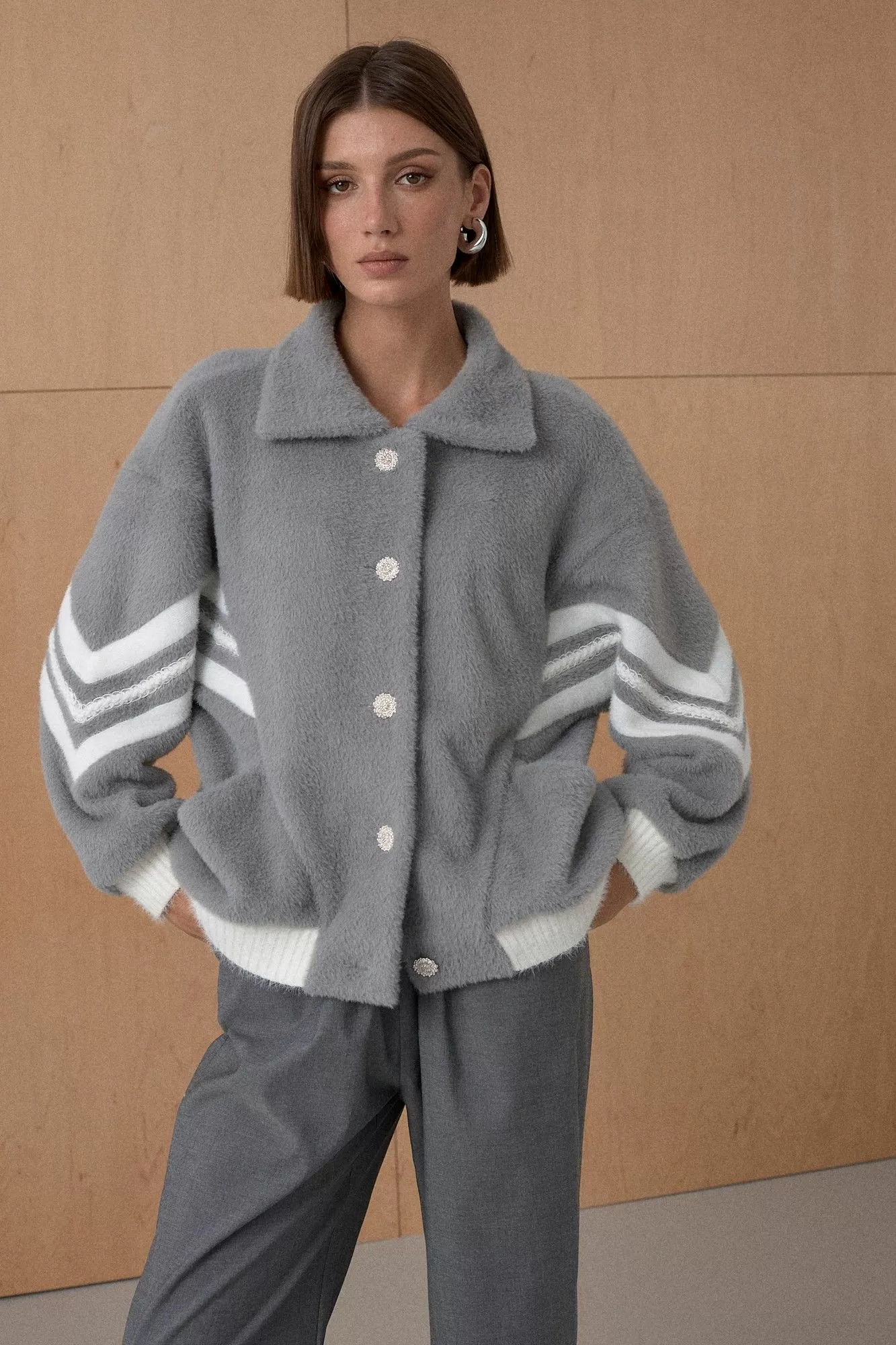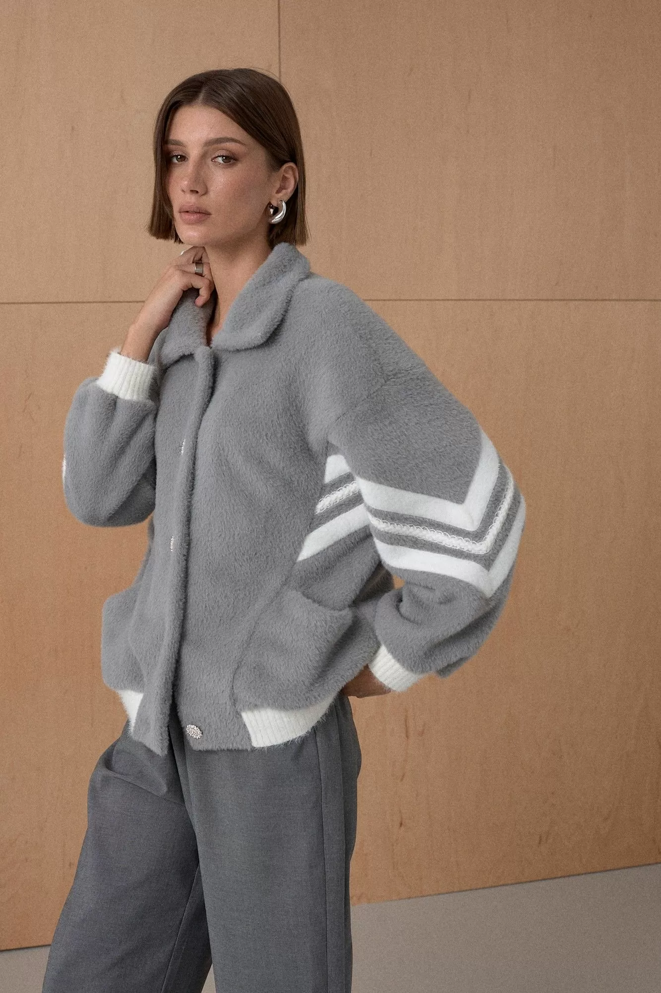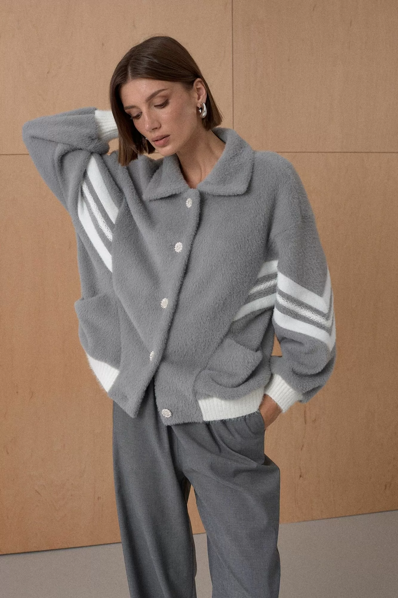 Джемпер из мягкого фактурного трикотажного полотна. Джемпер в силуэте олимпийки. Застежка на премиальные итальянские пуговицы. На рукавах декоративные ленты в виде лампасов. Длина от плечевой точки у основая шеи 64 см. Состав 100% ПЭ