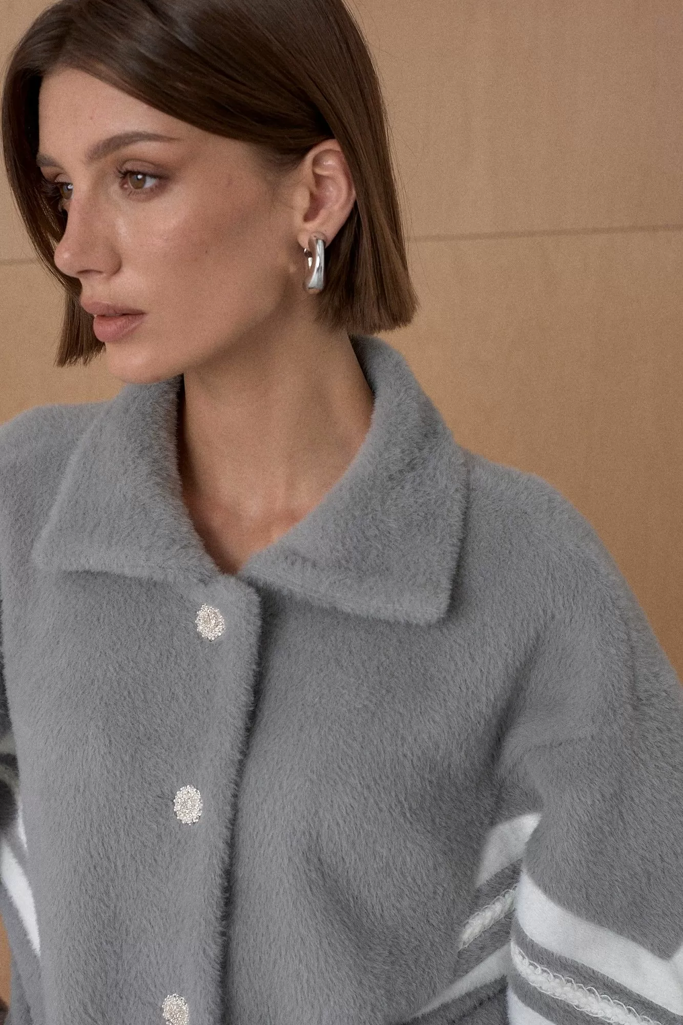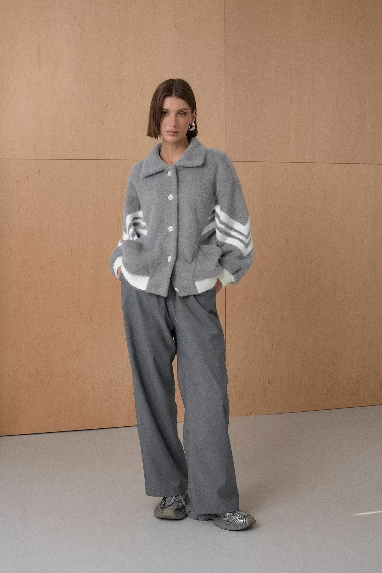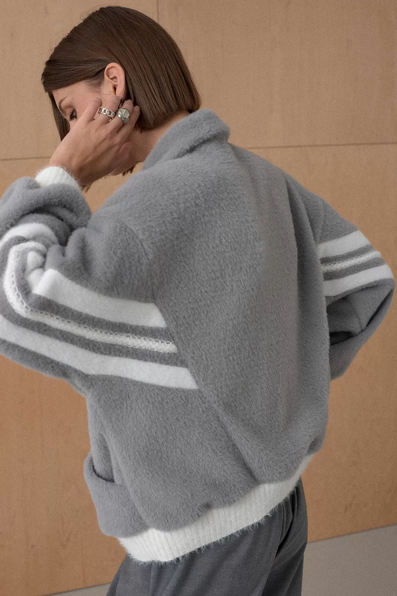 Джемпер из мягкого фактурного трикотажного полотна. Джемпер в силуэте олимпийки. Застежка на премиальные итальянские пуговицы. На рукавах декоративные ленты в виде лампасов. Длина от плечевой точки у основая шеи 64 см. Состав 100% ПЭ