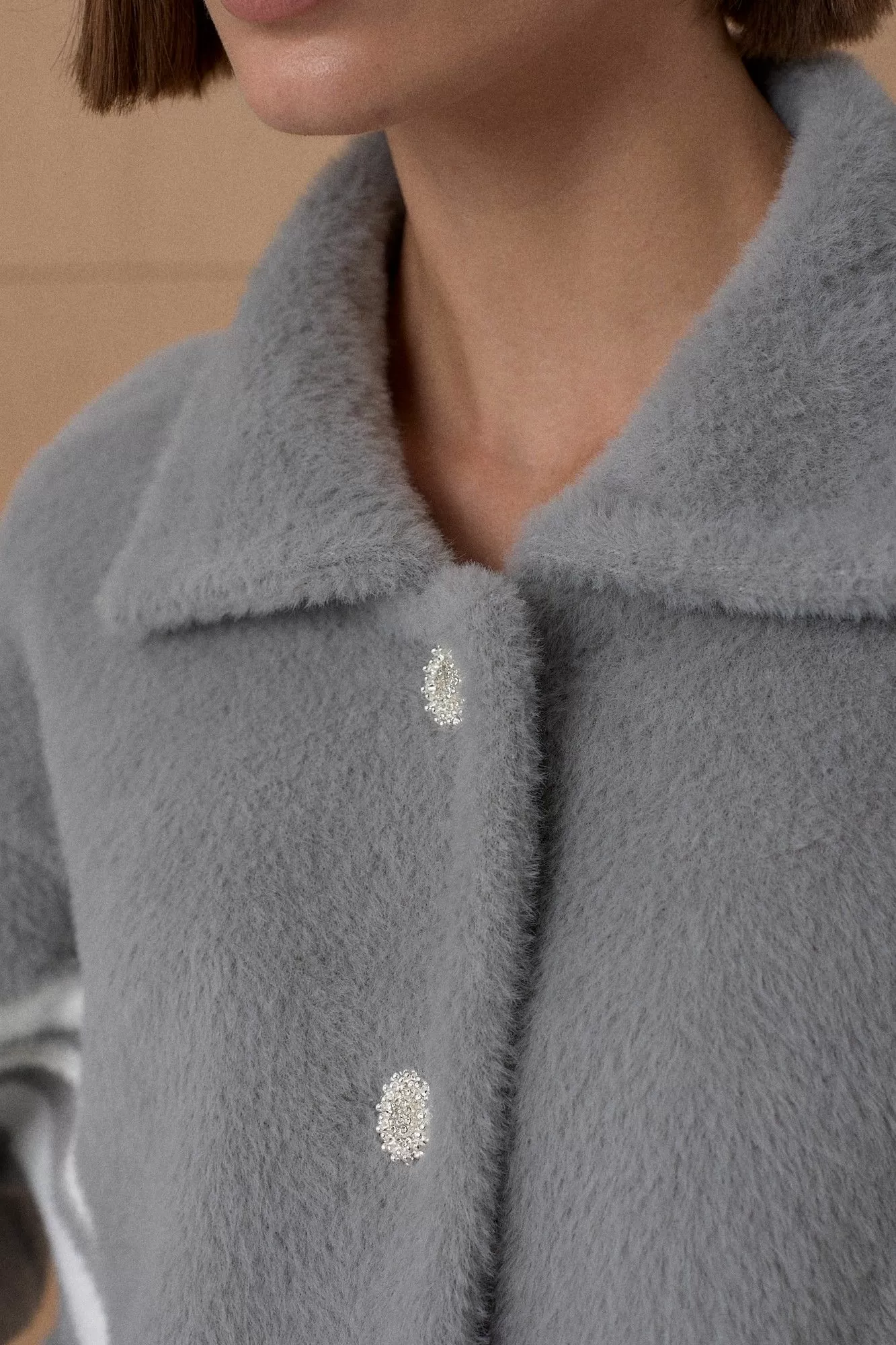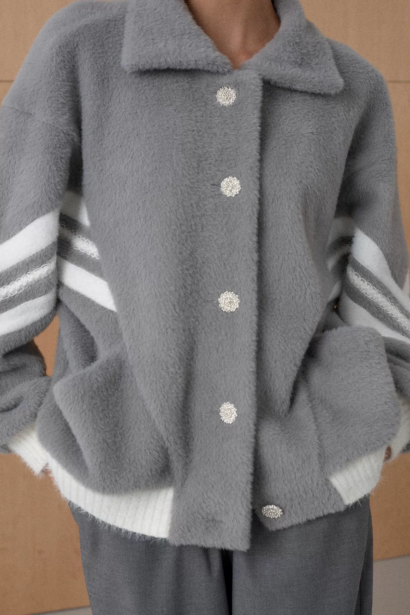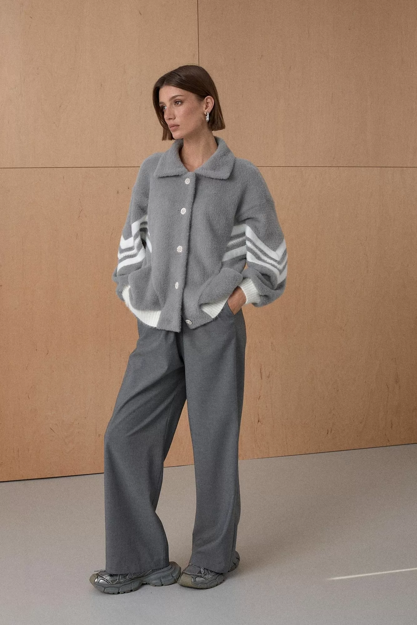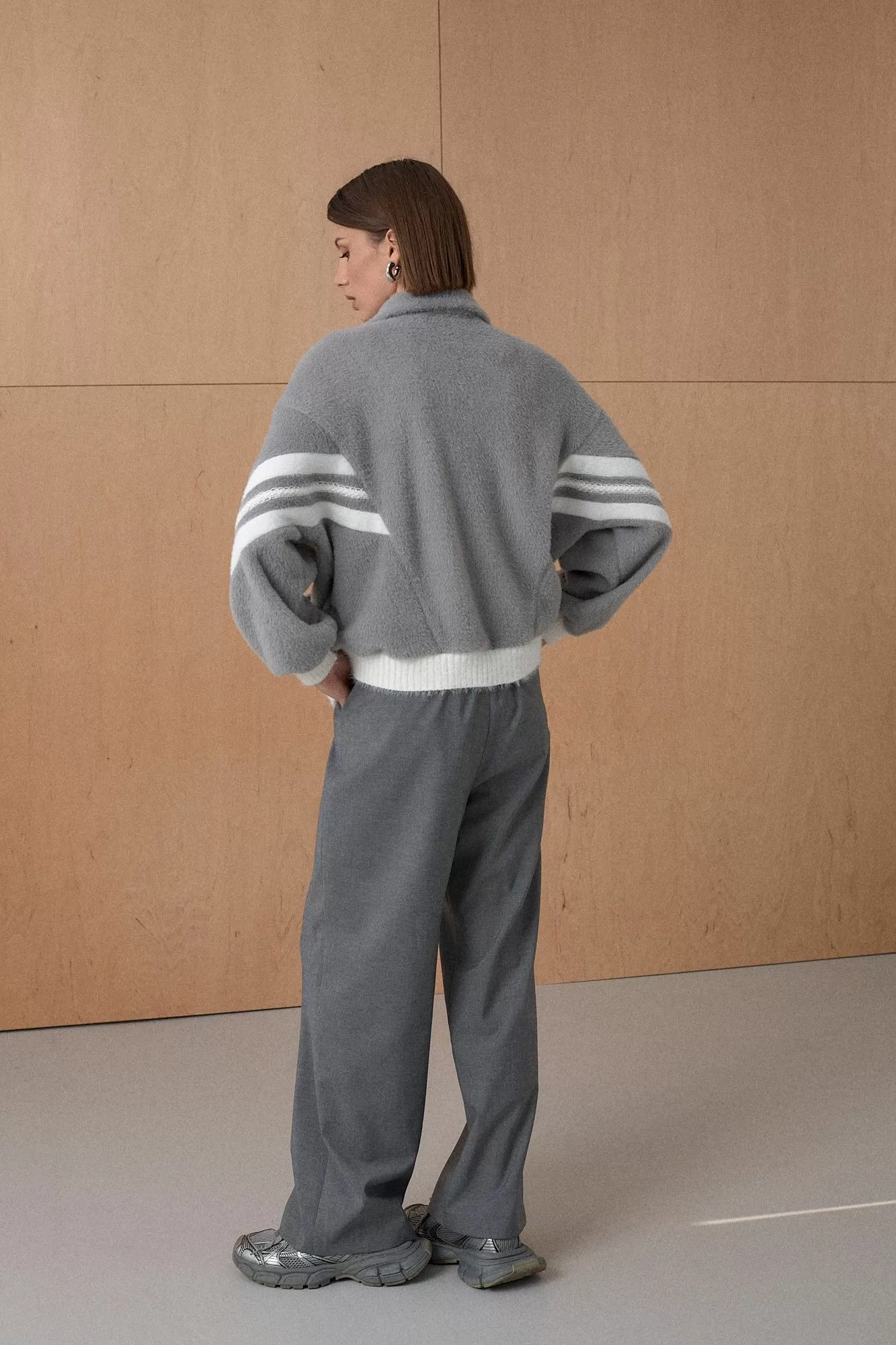 Джемпер из мягкого фактурного трикотажного полотна. Джемпер в силуэте олимпийки. Застежка на премиальные итальянские пуговицы. На рукавах декоративные ленты в виде лампасов. Длина от плечевой точки у основая шеи 64 см. Состав 100% ПЭ