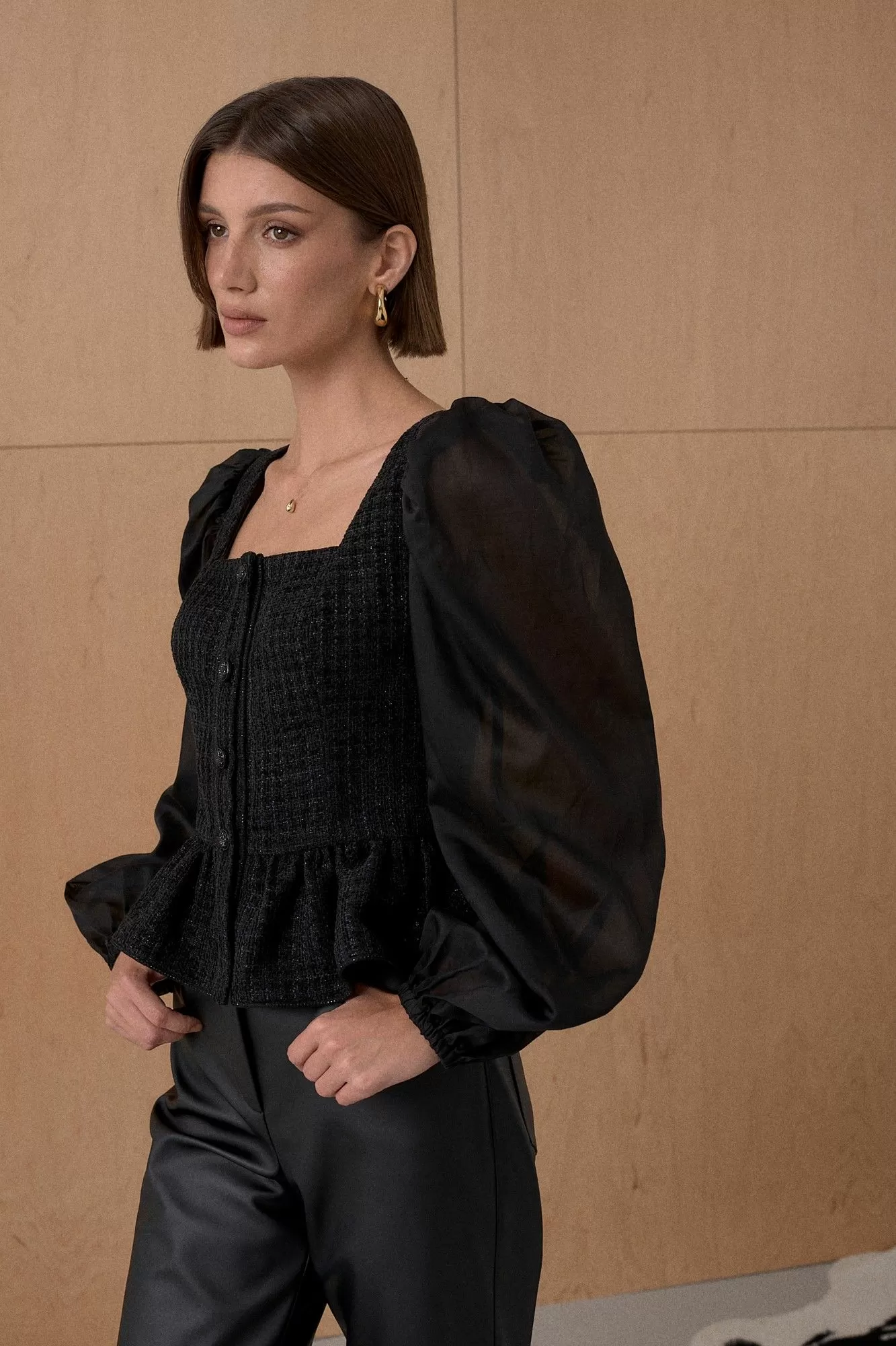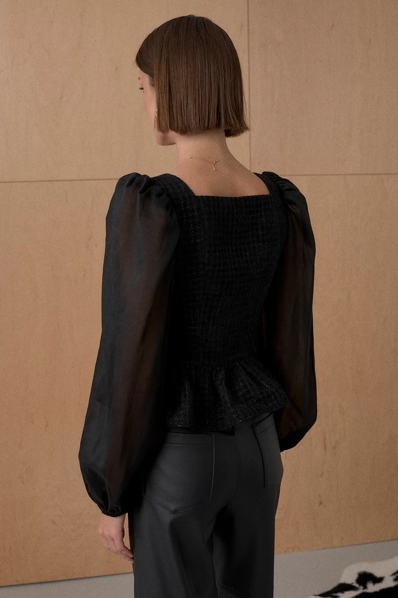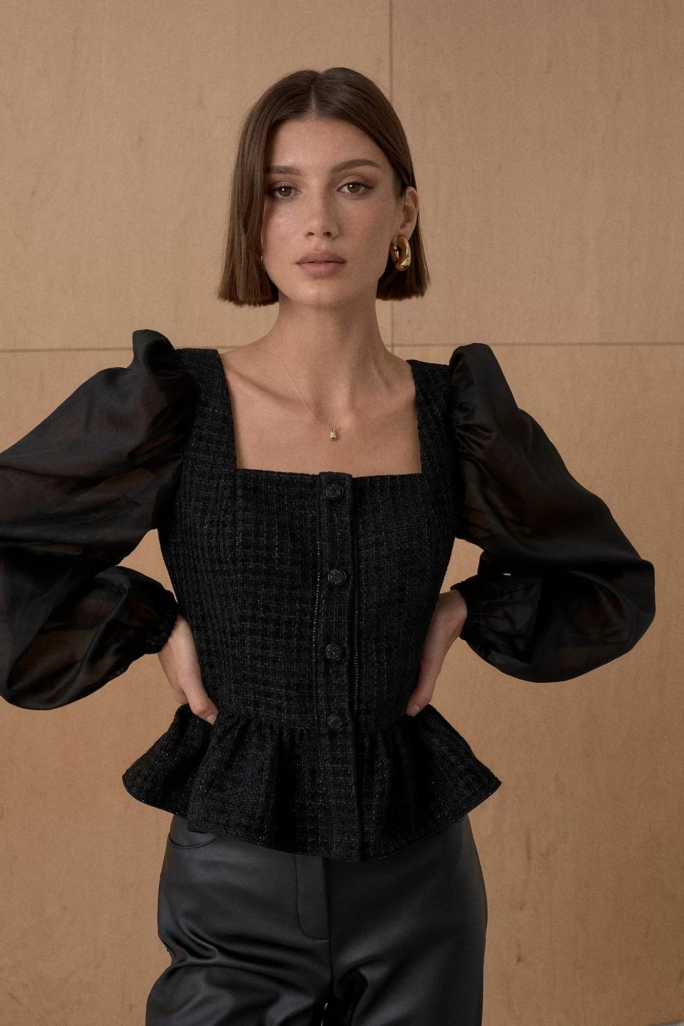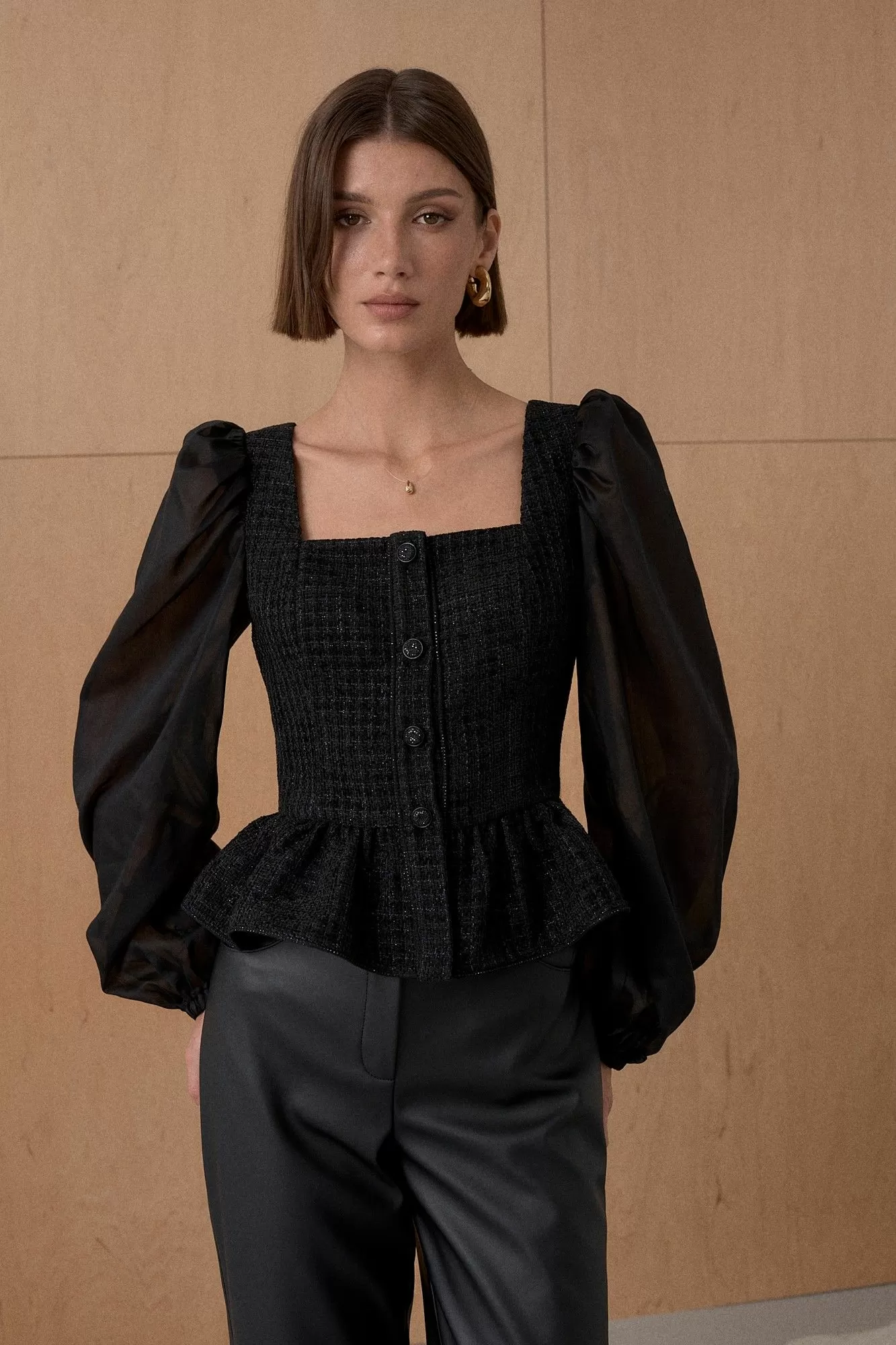 Топ из благородного жаккарда. Декорирован мерцающей тесьмой. Рукав выполнен из полупрозрачной вискозной ткани. Длина топа 55 см. Состав основной ткани 80% ПЭ, 18% вискоза, 2% спандекс. Состав ткани компаньона 83% вискоза, 17% ПЭ.