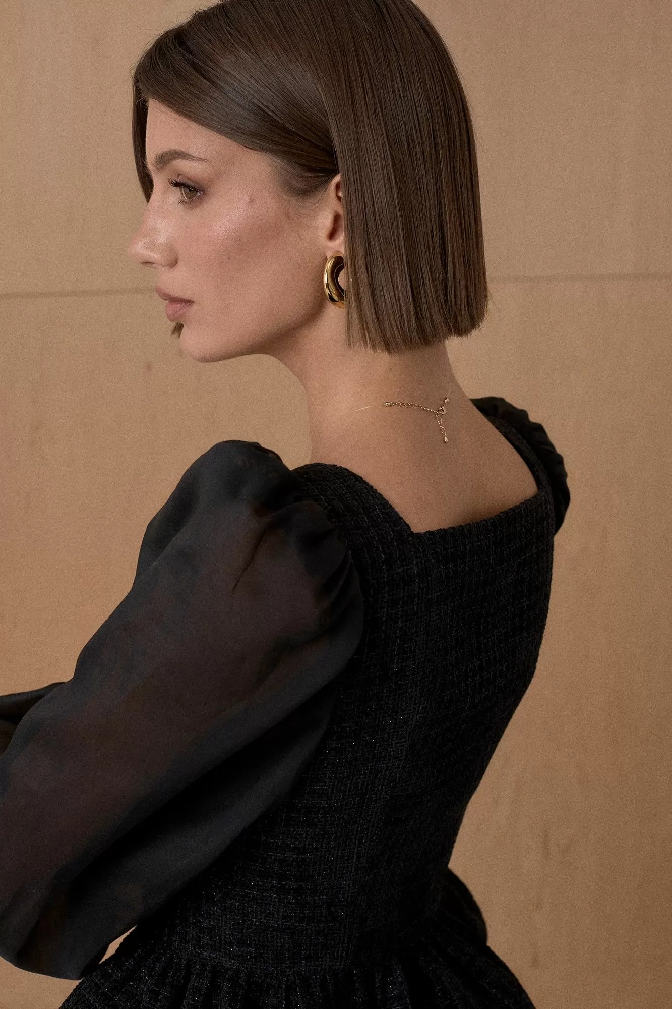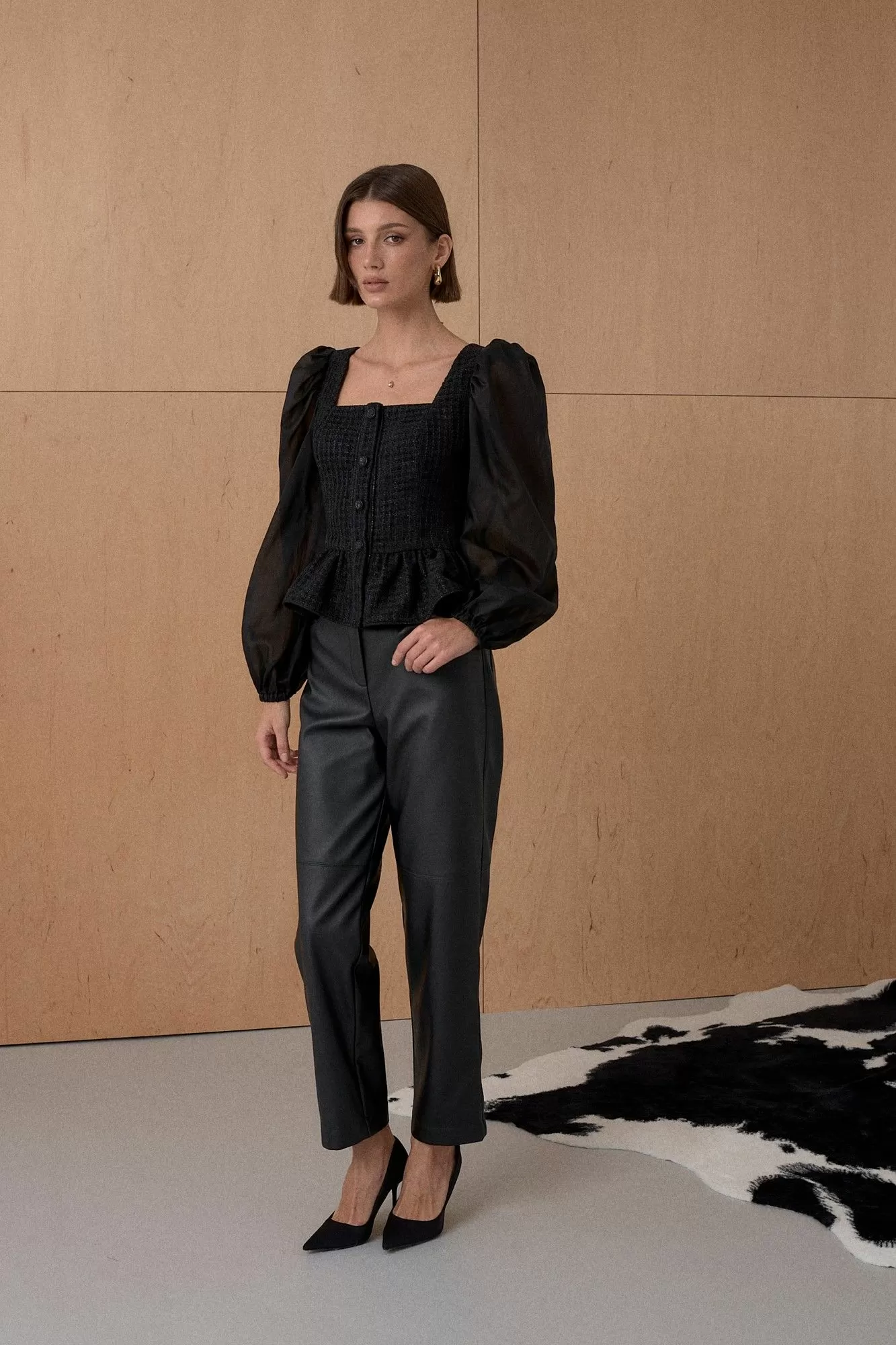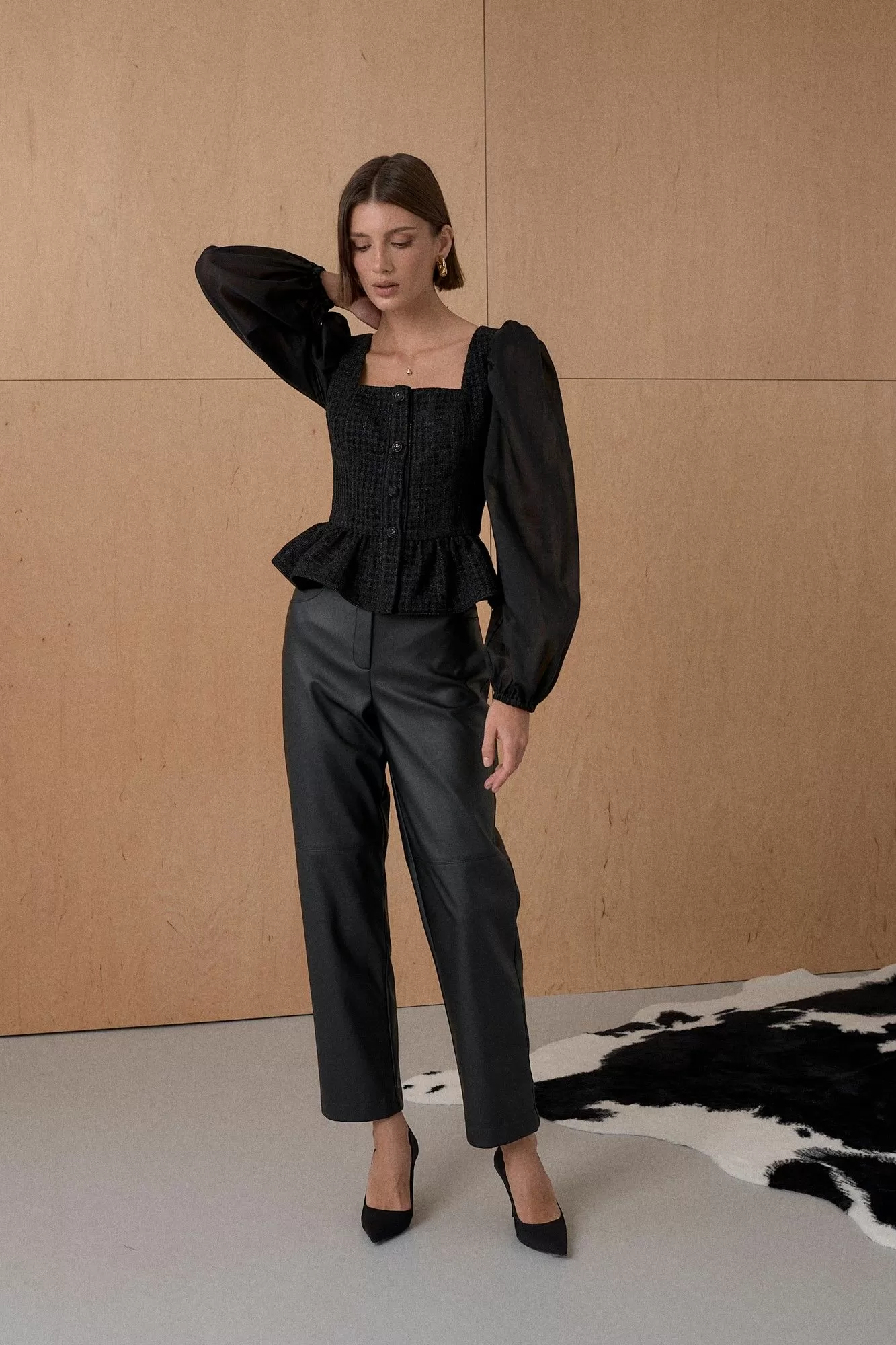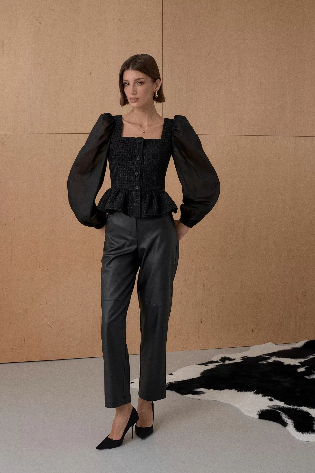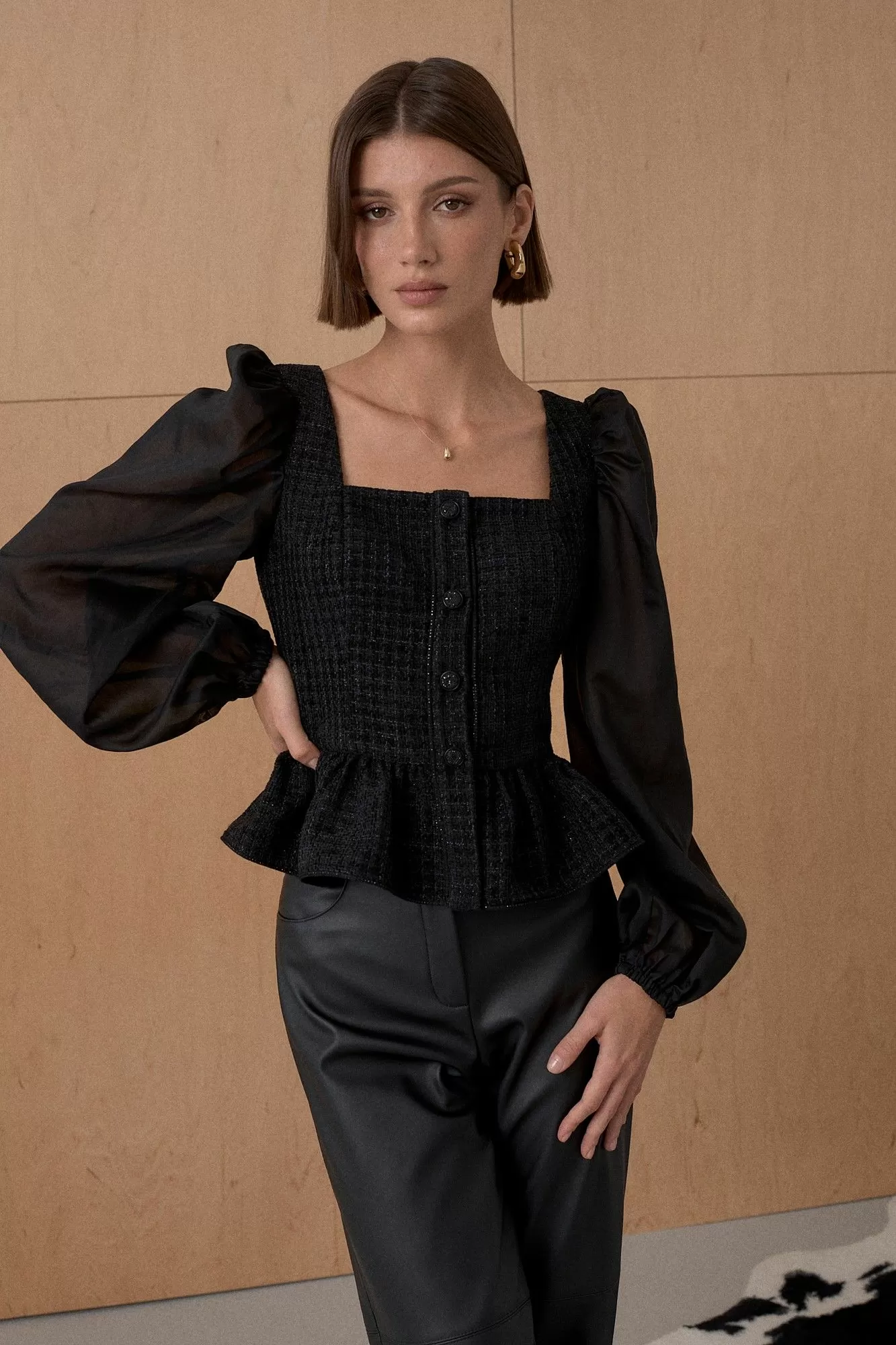 Топ из благородного жаккарда. Декорирован мерцающей тесьмой. Рукав выполнен из полупрозрачной вискозной ткани. Длина топа 55 см. Состав основной ткани 80% ПЭ, 18% вискоза, 2% спандекс. Состав ткани компаньона 83% вискоза, 17% ПЭ.