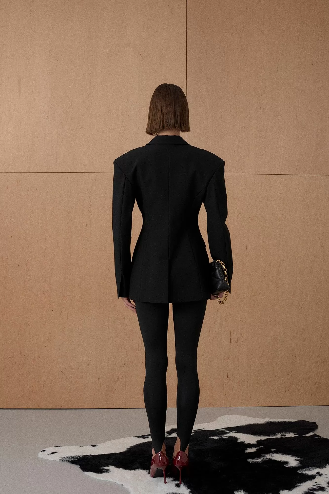 Жакет из формообразующей костюмной ткани. Усиленная и расширенная форма плеча. Приталенный. Двубортный. Длина от плечевой точки у основая шеи 76 см. Состав 80% ПЭ, 18% вискоза, 2% спандекс