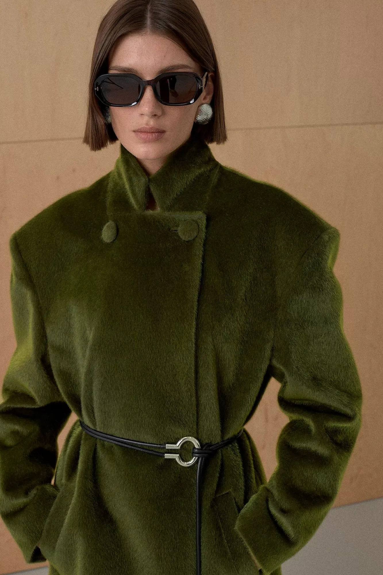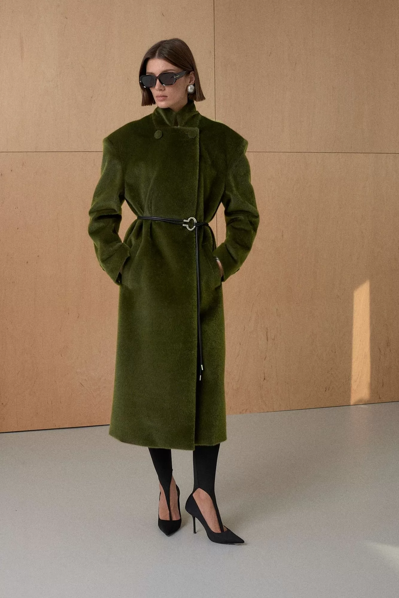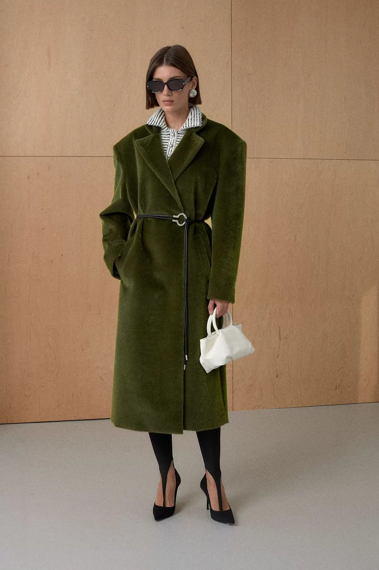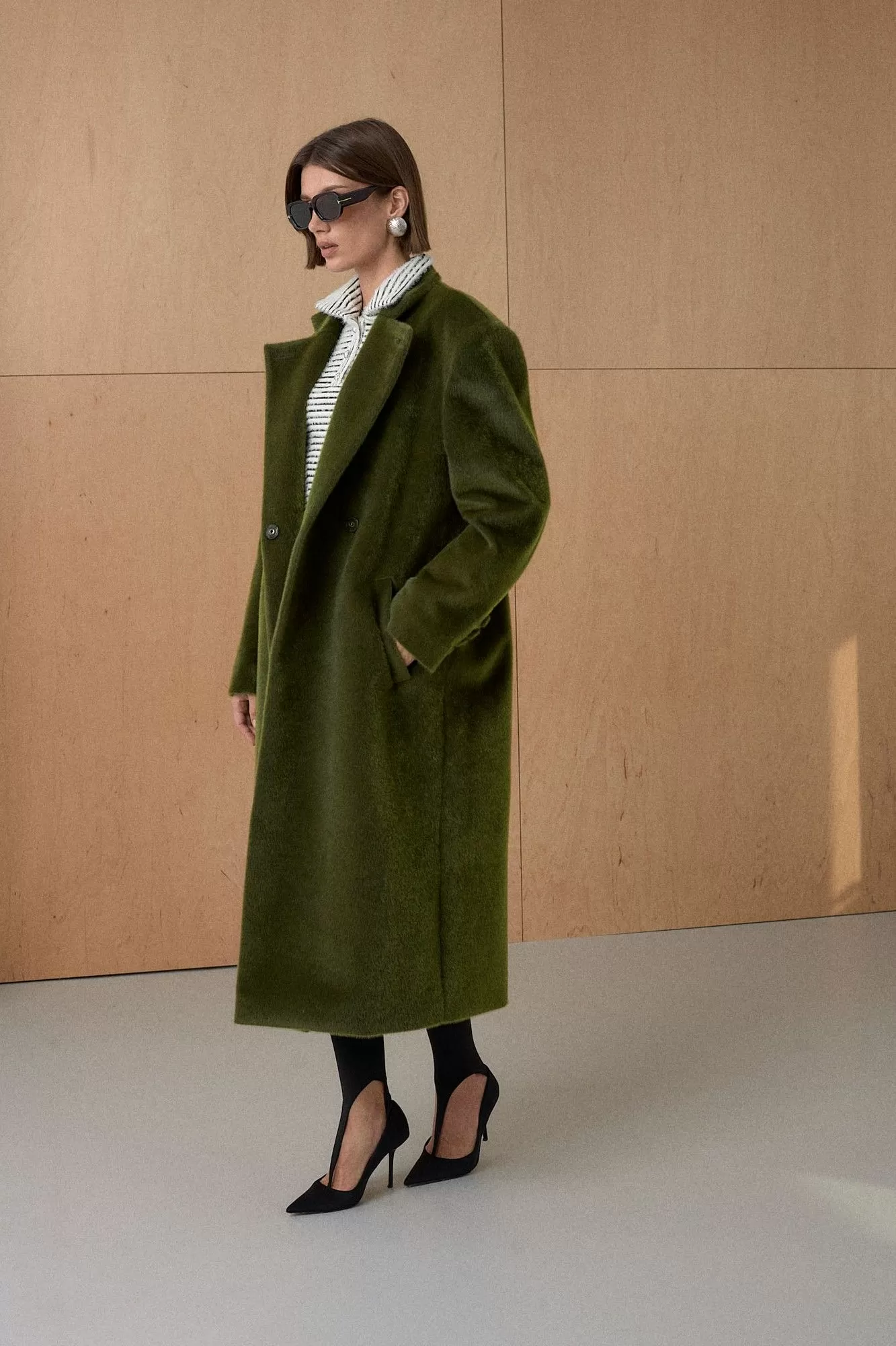 Жакет прямого силуэта с усиленой и расширенной формой плеча. Несколько вариантов застежки воротника. На утеплителе. Температурный режим до 0. Укороченный ворс полотна в трендовом оттенке. Длина от плечевой точки у основая шеи 126 см. Состав 100% ПЭ.