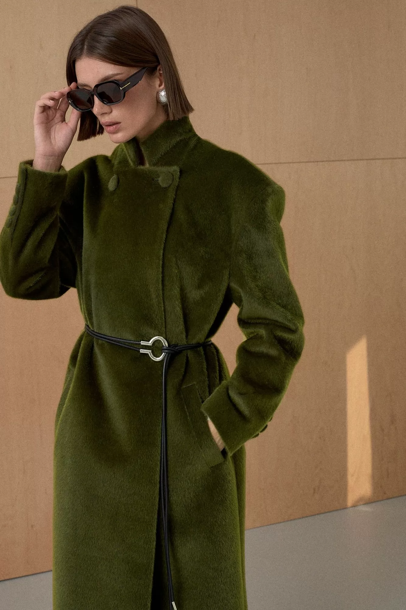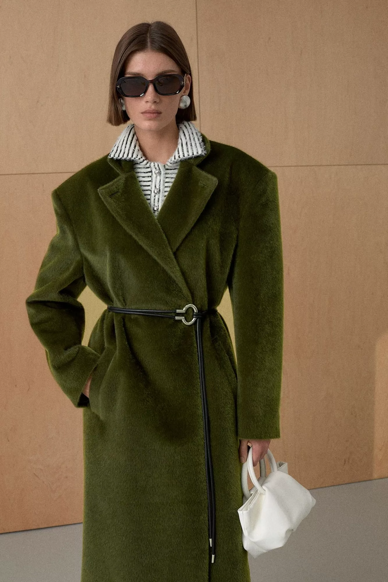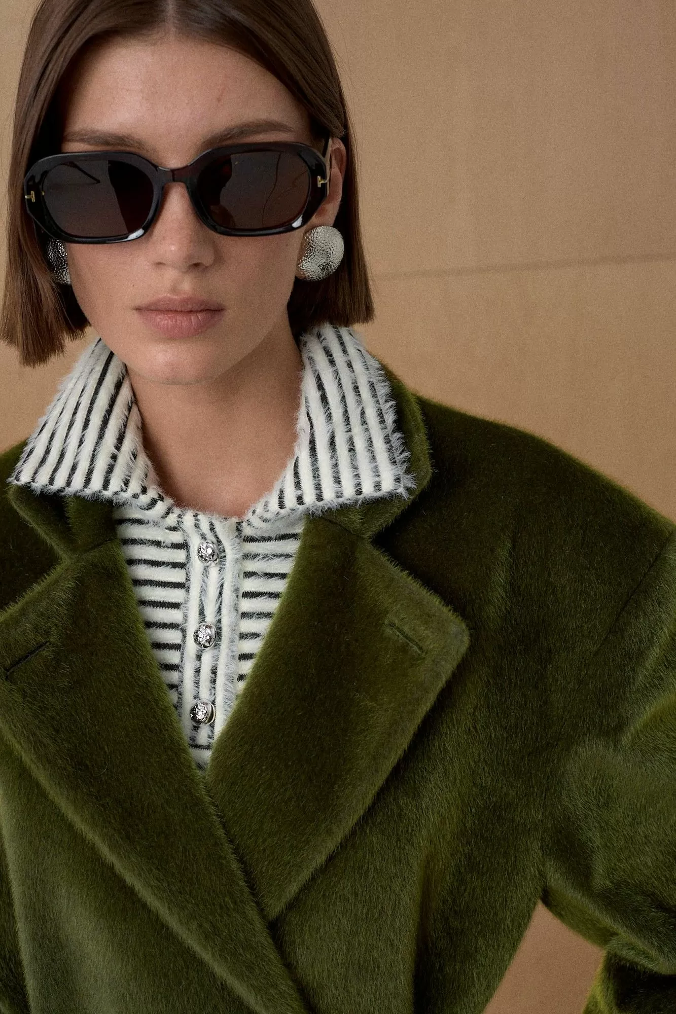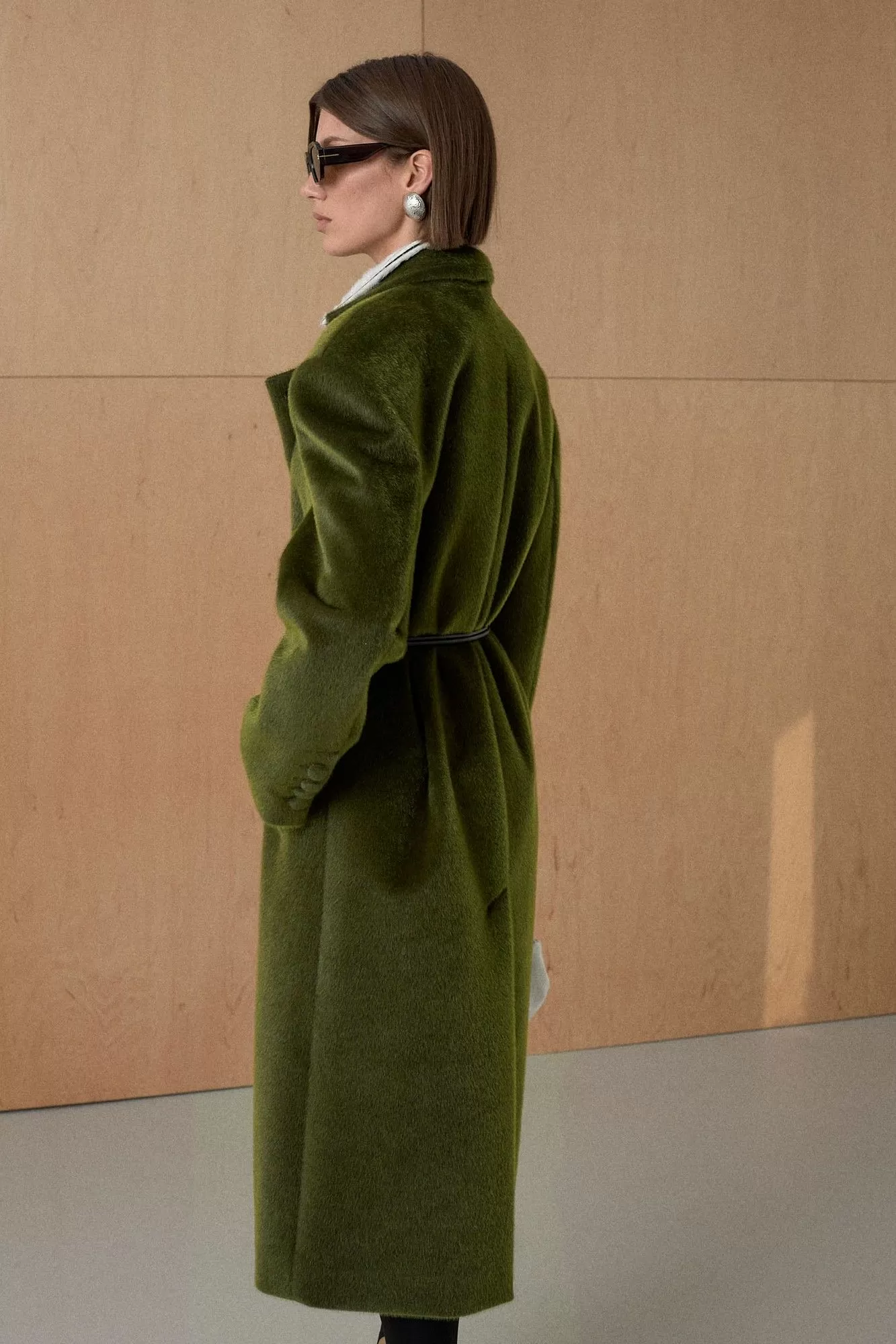 Жакет прямого силуэта с усиленой и расширенной формой плеча. Несколько вариантов застежки воротника. На утеплителе. Температурный режим до 0. Укороченный ворс полотна в трендовом оттенке. Длина от плечевой точки у основая шеи 126 см. Состав 100% ПЭ.
