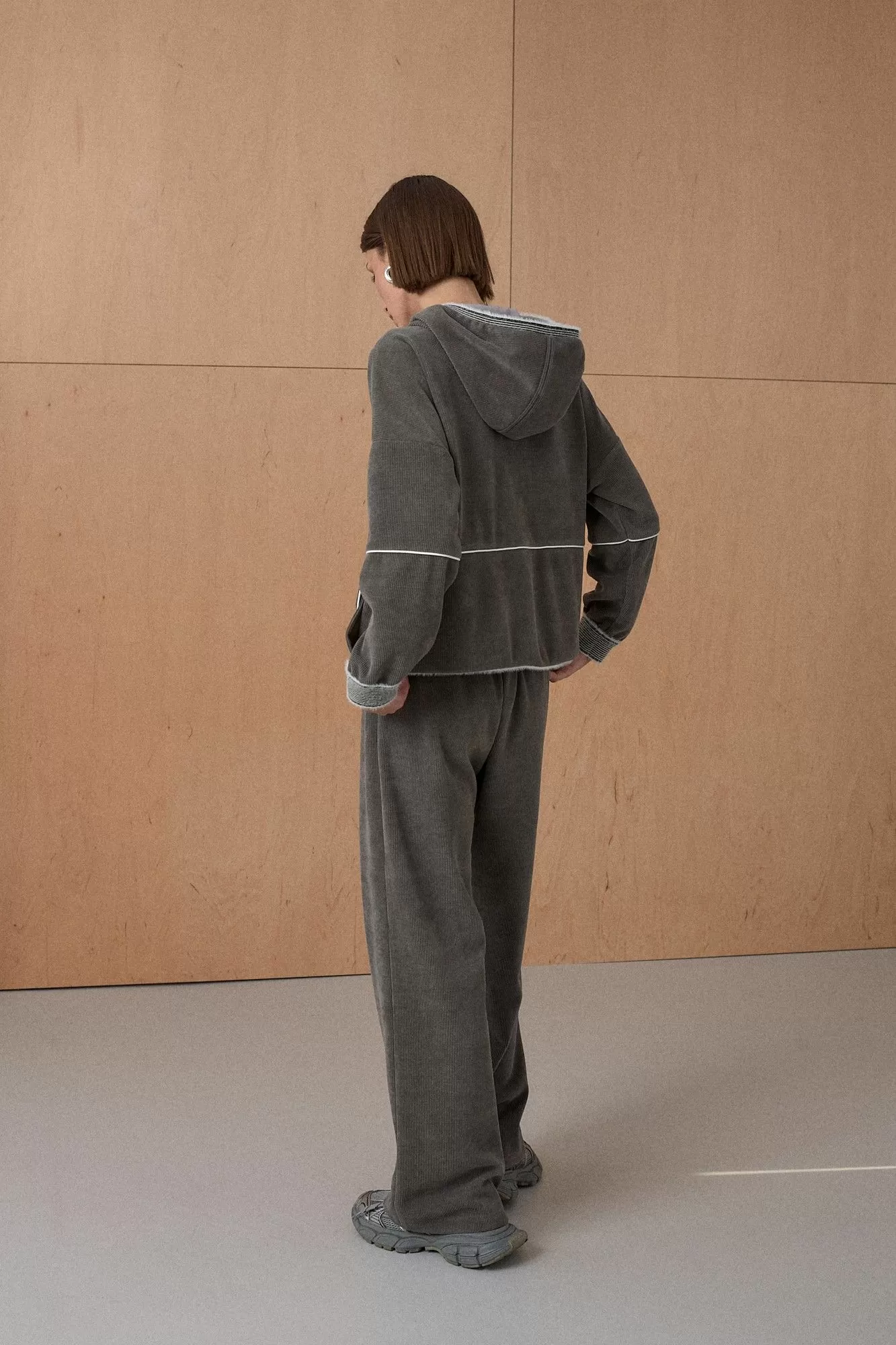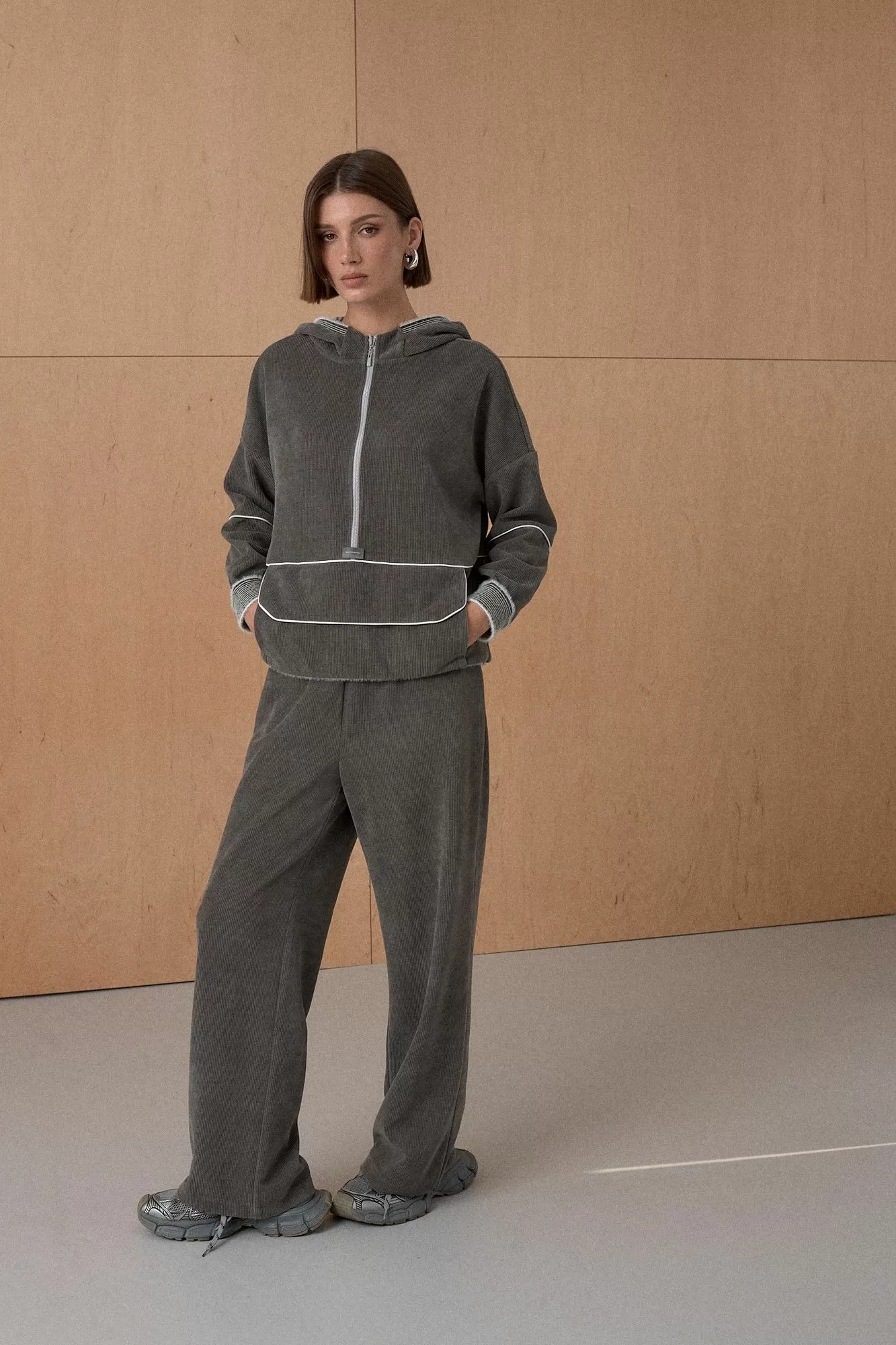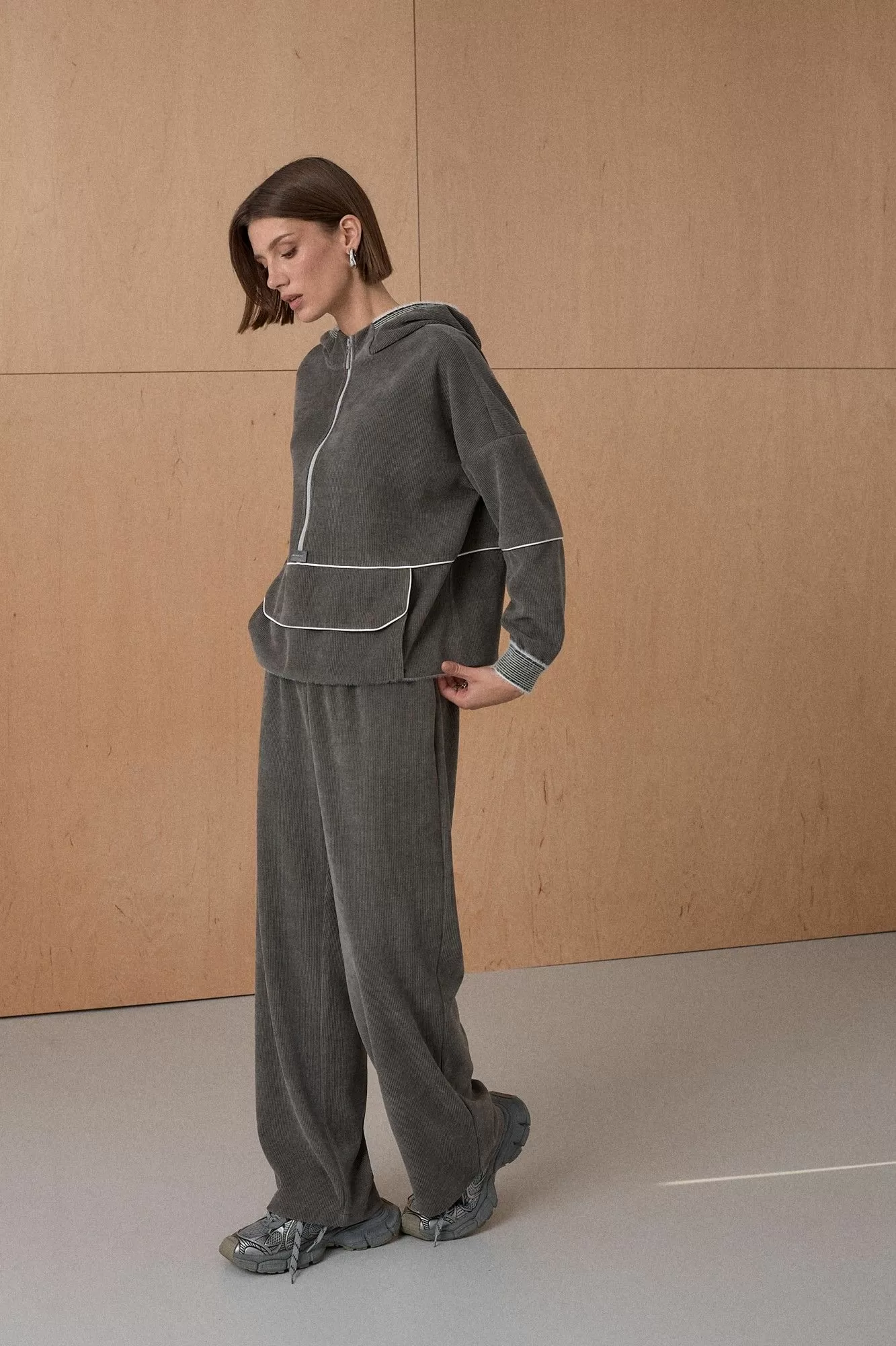 Брюки свободного силуэта из фактурной ткани. Пляс на резинке. В боковых швах карманы. Длина 108 см.