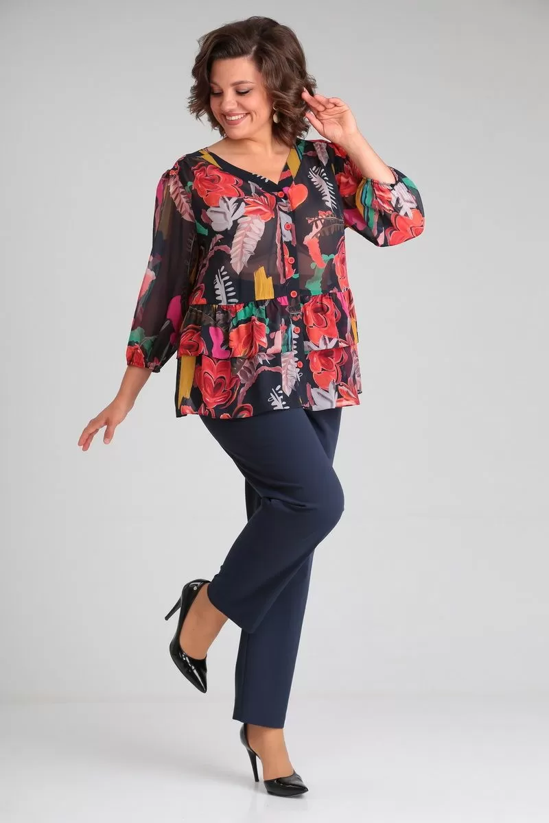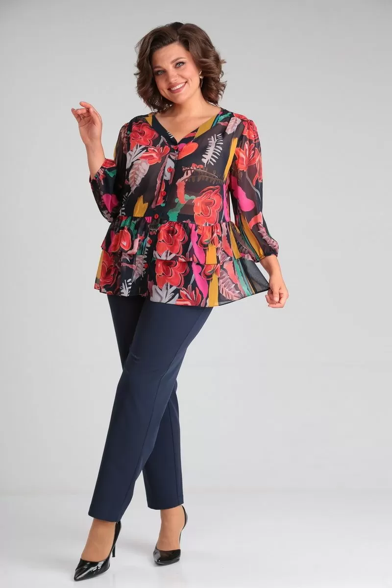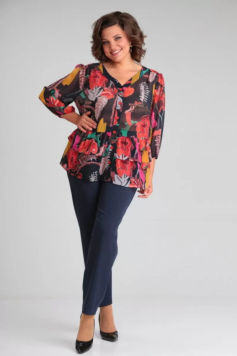 Блуза свободного силуэта, выполненная из легкой шифоновой ткани (не тянется) с модным, красочным принтом. Блуза отрезная чуть ниже линии талии. Верхняя часть переда с нагрудными вытачками, отрезной кокеткой, отрезной планкой. Застежка центральная на петли-пуговицы. Верхняя часть спинки со средним швом. Нижняя часть блузки оформлена двумя ярусами присборенных воланов. Рукав втачной, одношовный со сборкой по окату и резинкой по низу.
